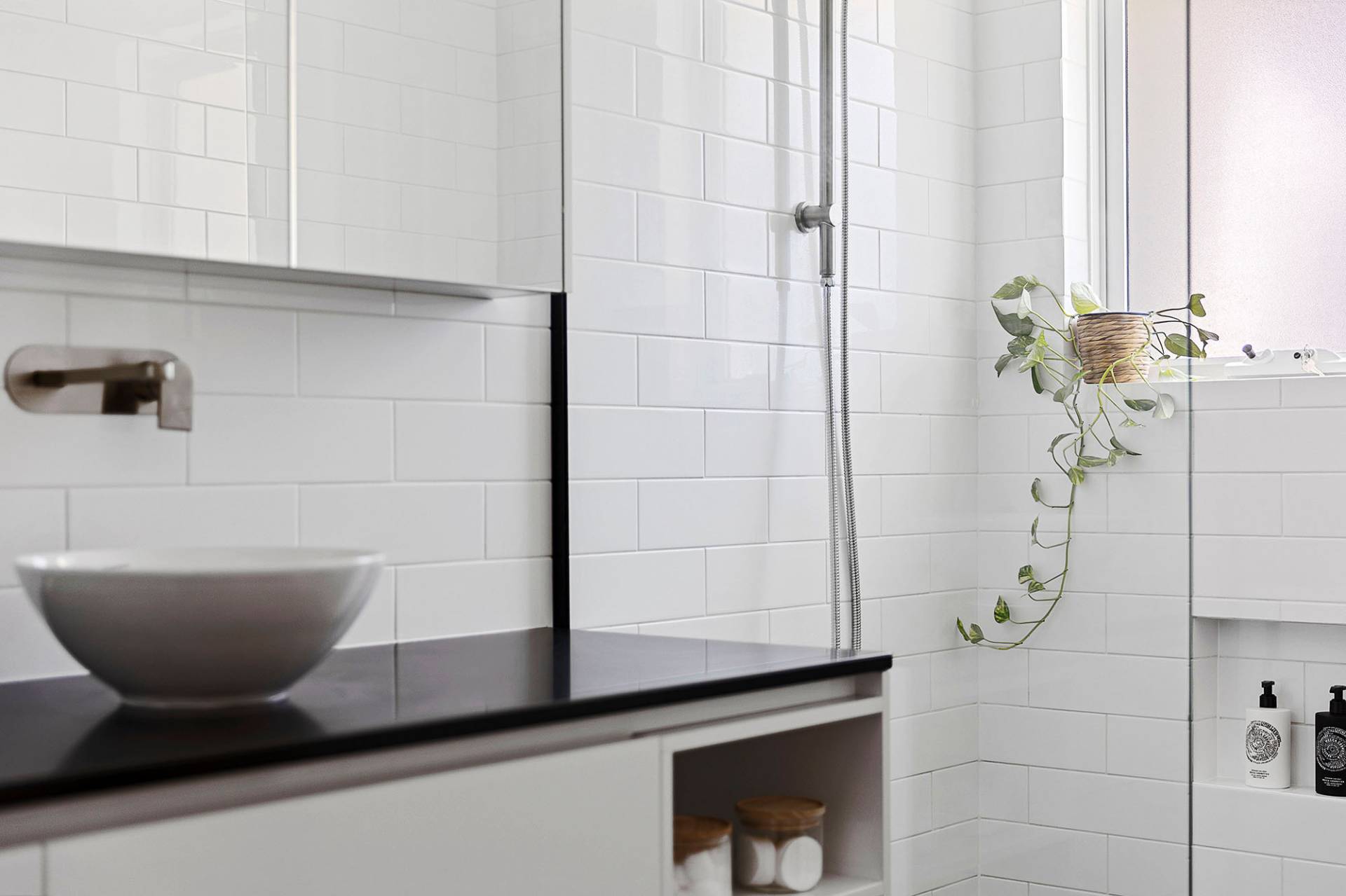 •    Modern bathroom featuring floor-to-ceiling subway tiles, a large walk-in shower, and a stone-topped vanity