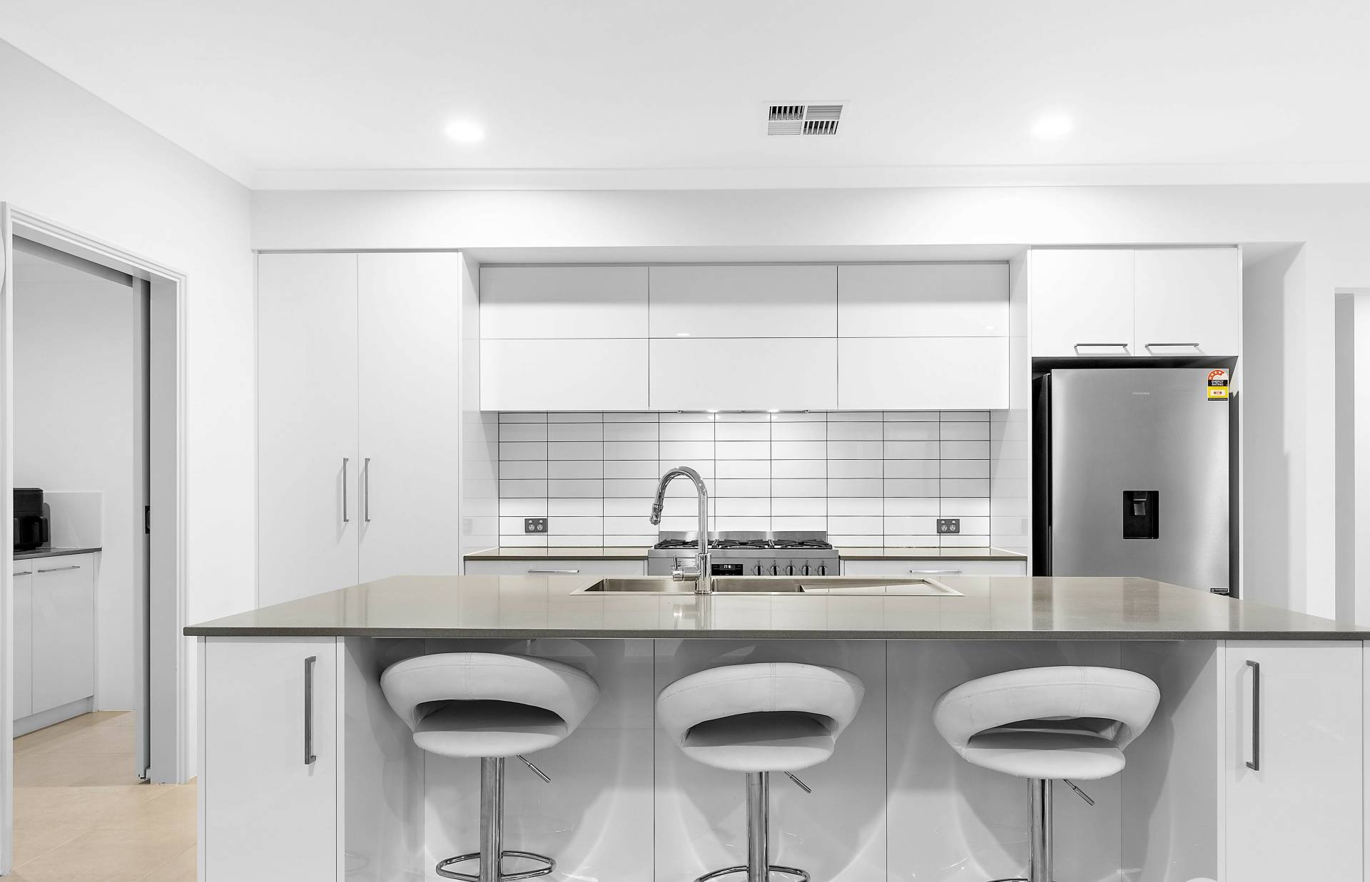3. Modern kitchen with a large freestanding island, stone benchtops, stainless steel appliances, and a walk-through scullery