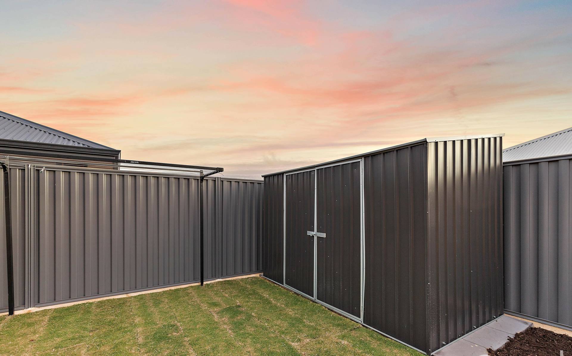 9. Spacious backyard with firepit area, lawn, garden beds, reticulation, and garden shed