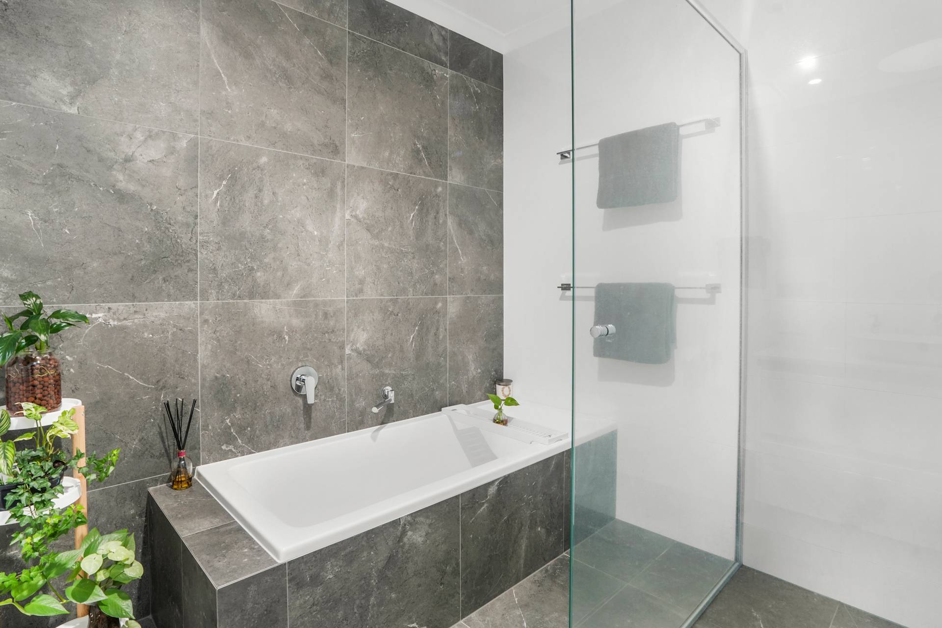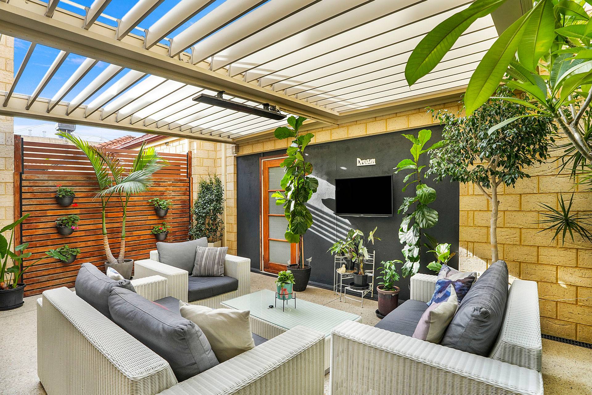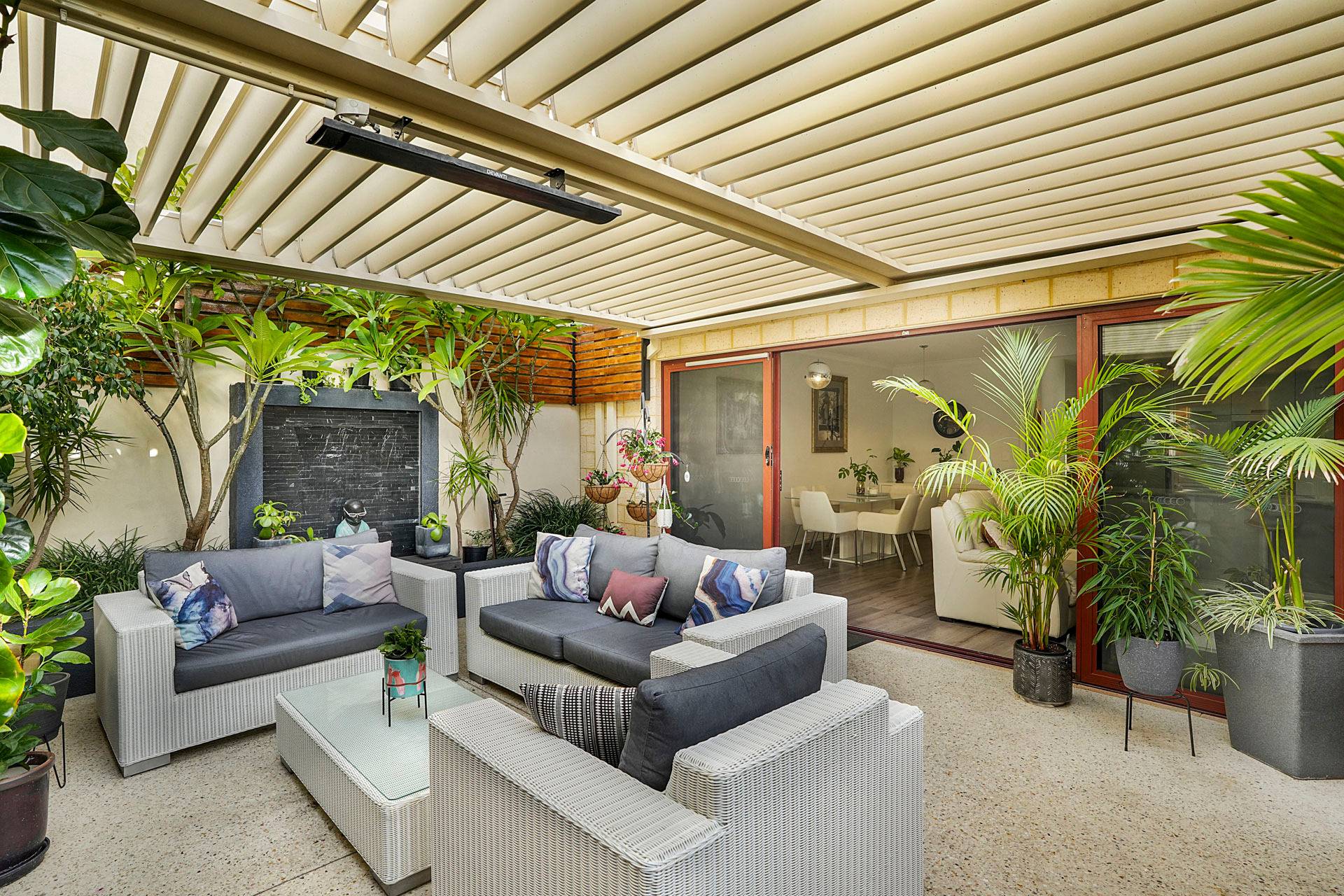 -The backyard is where you will probably spend the majority of your time! Incorporating polished concrete flooring, electric louvers overhead which allow you to easily control the amount of sun or rain that comes through and for those colder days, a radiator to stay warm, plus a relaxing waterfall, timber slat feature wall with plant pots and a wall mounted TV.