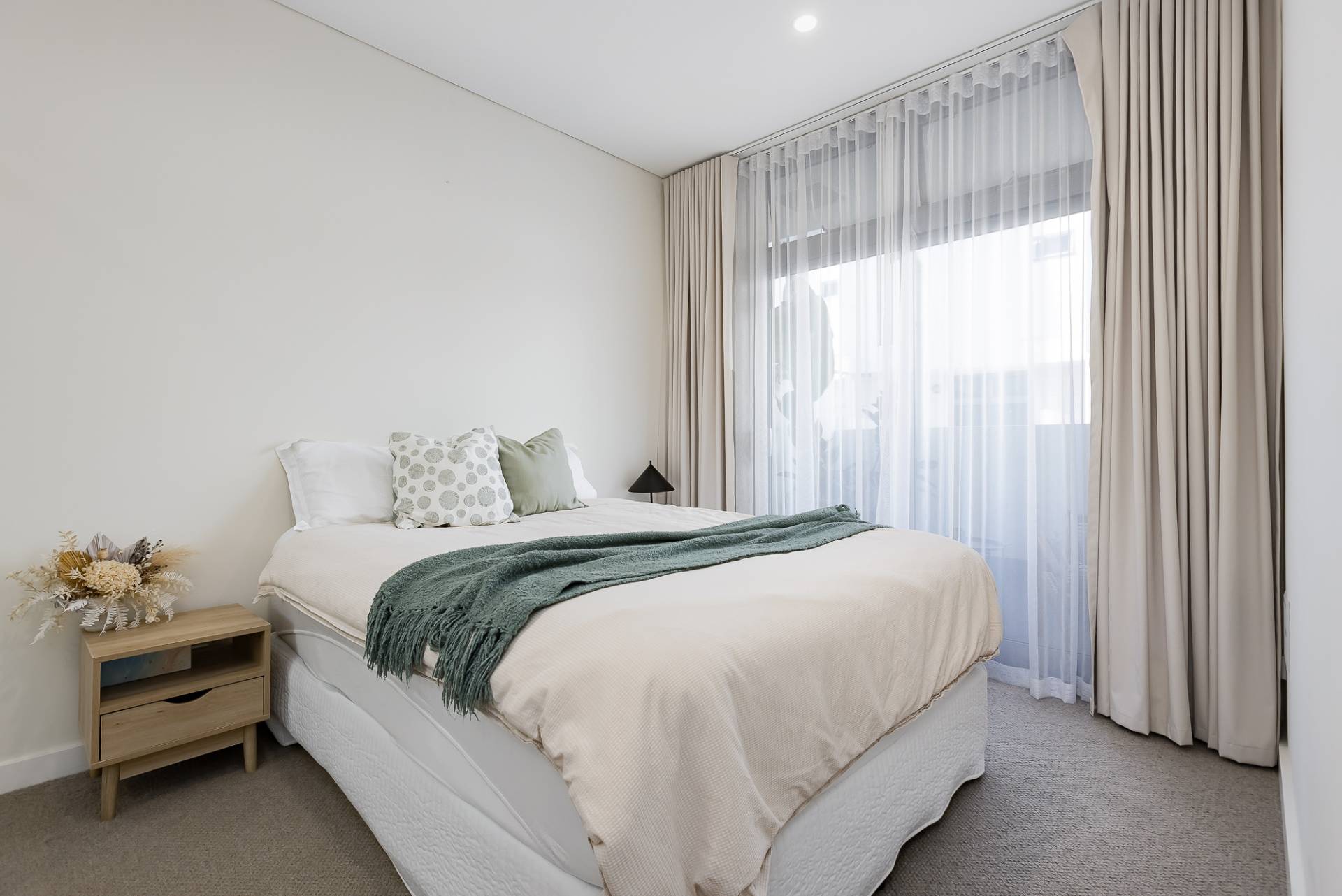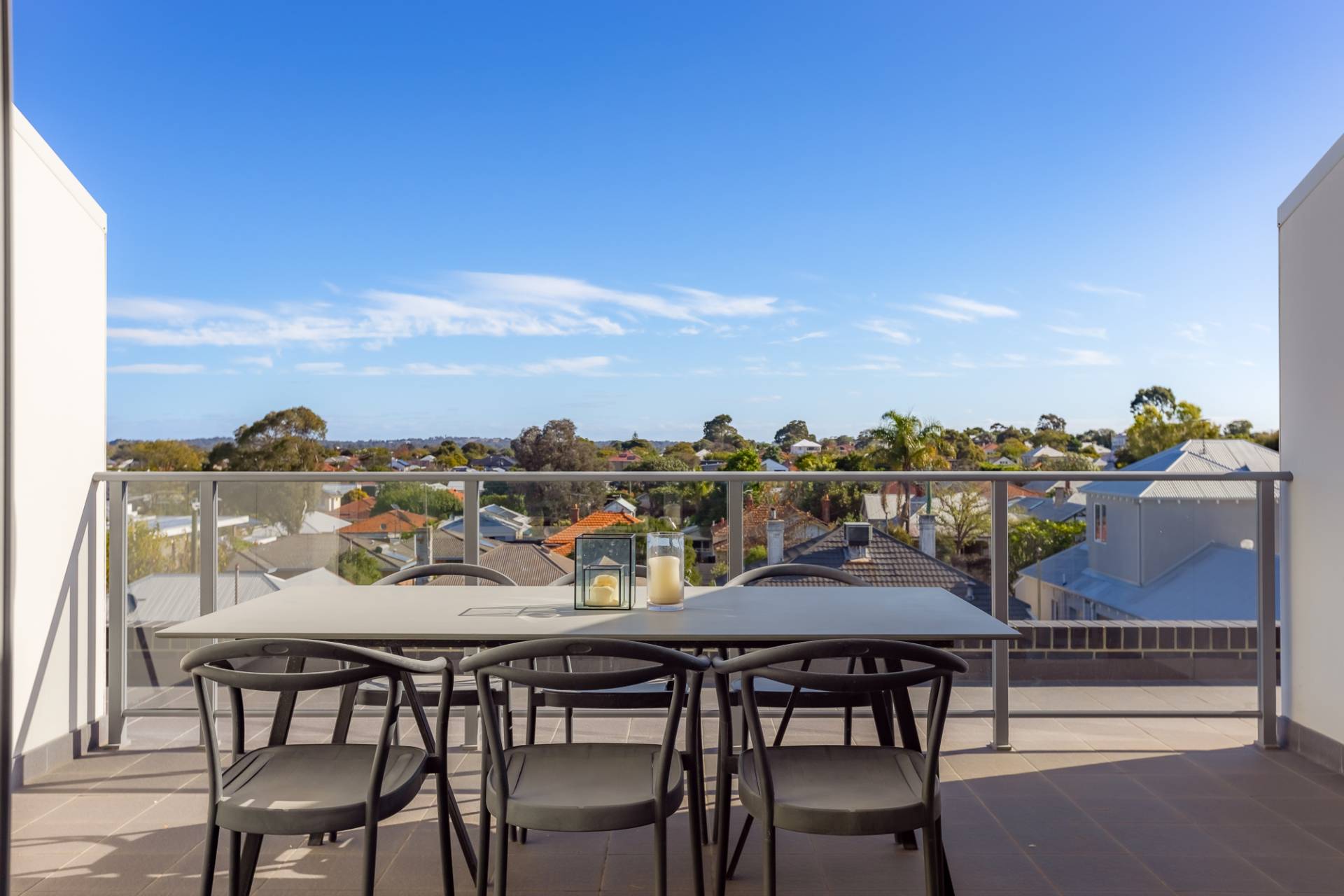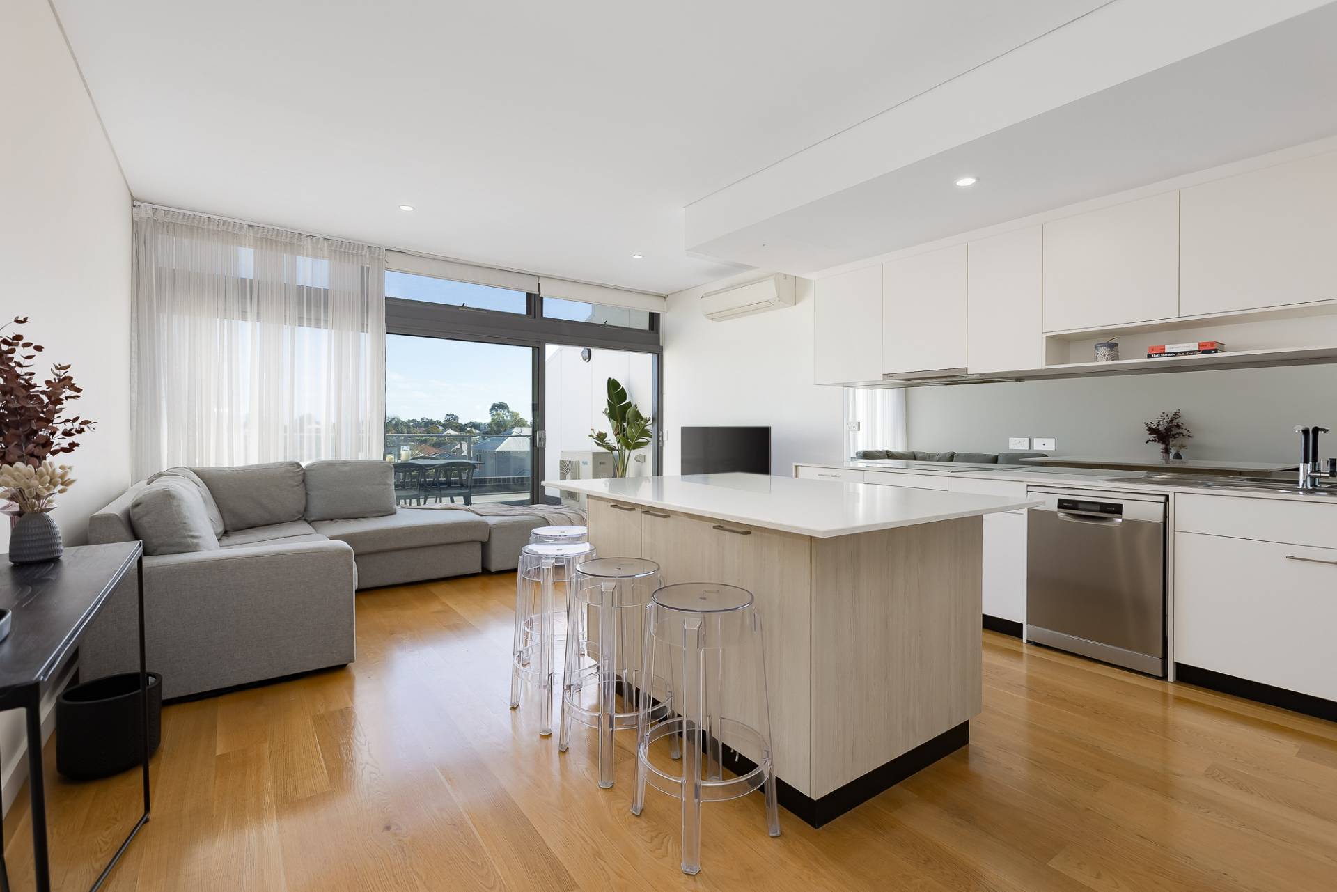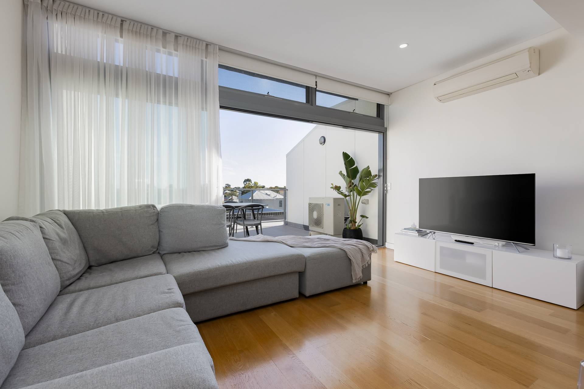 Inside, the open-plan living space is bathed in natural light, seamlessly flowing out to a generous terrace with leafy treetop views, ideal for relaxed entertaining or enjoying Perth’s endless summer evenings. The gourmet kitchen features sleek stone benchtops, ample storage, quality stainless steel appliances, a breakfast bar, and modern finishes that cater to everyday convenience and effortless entertaining. A spacious bedroom, modern bathroom, and well-considered inclusions such as timber flooring, full-height windows, and quality window treatments create a cohesive and welcoming environment.