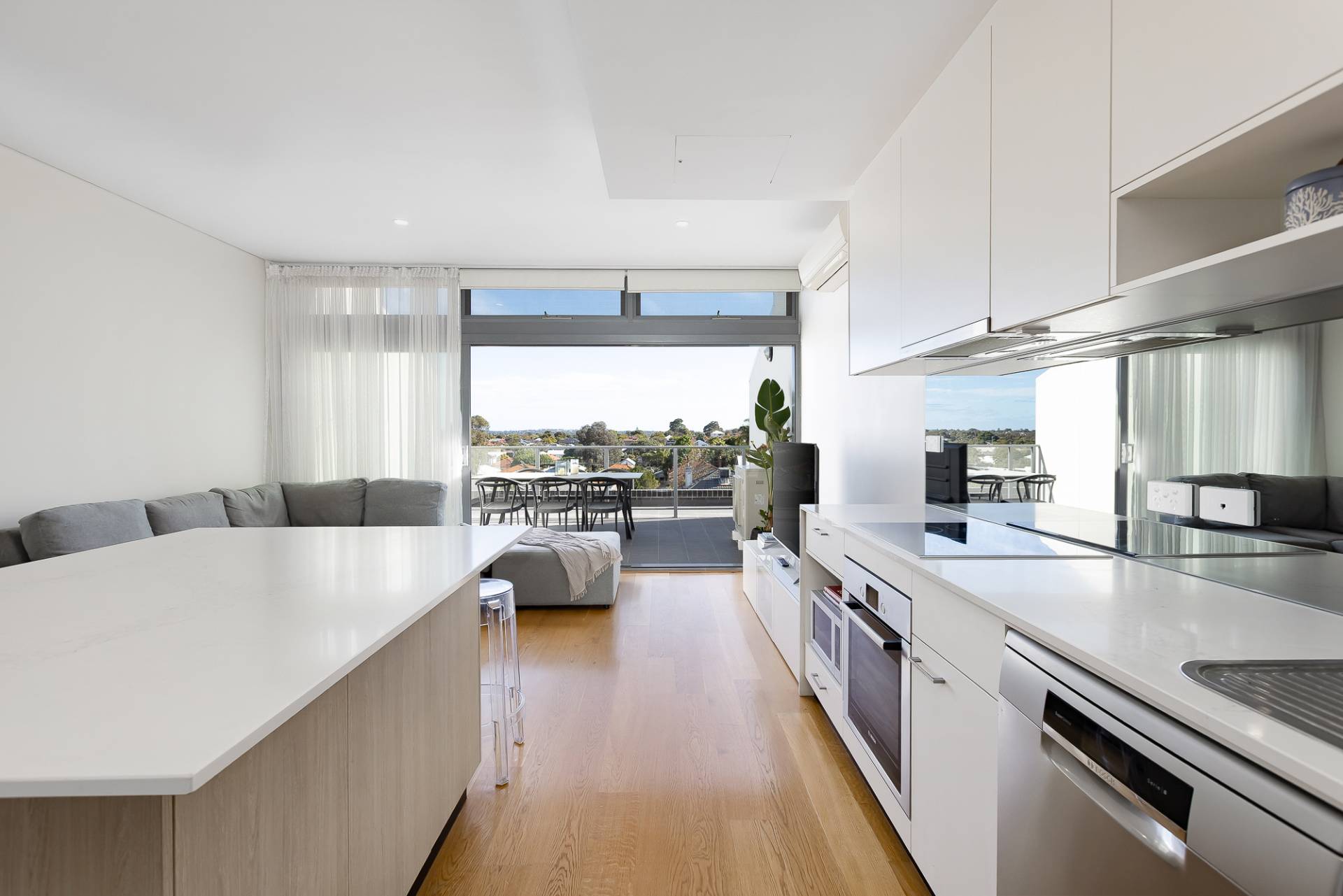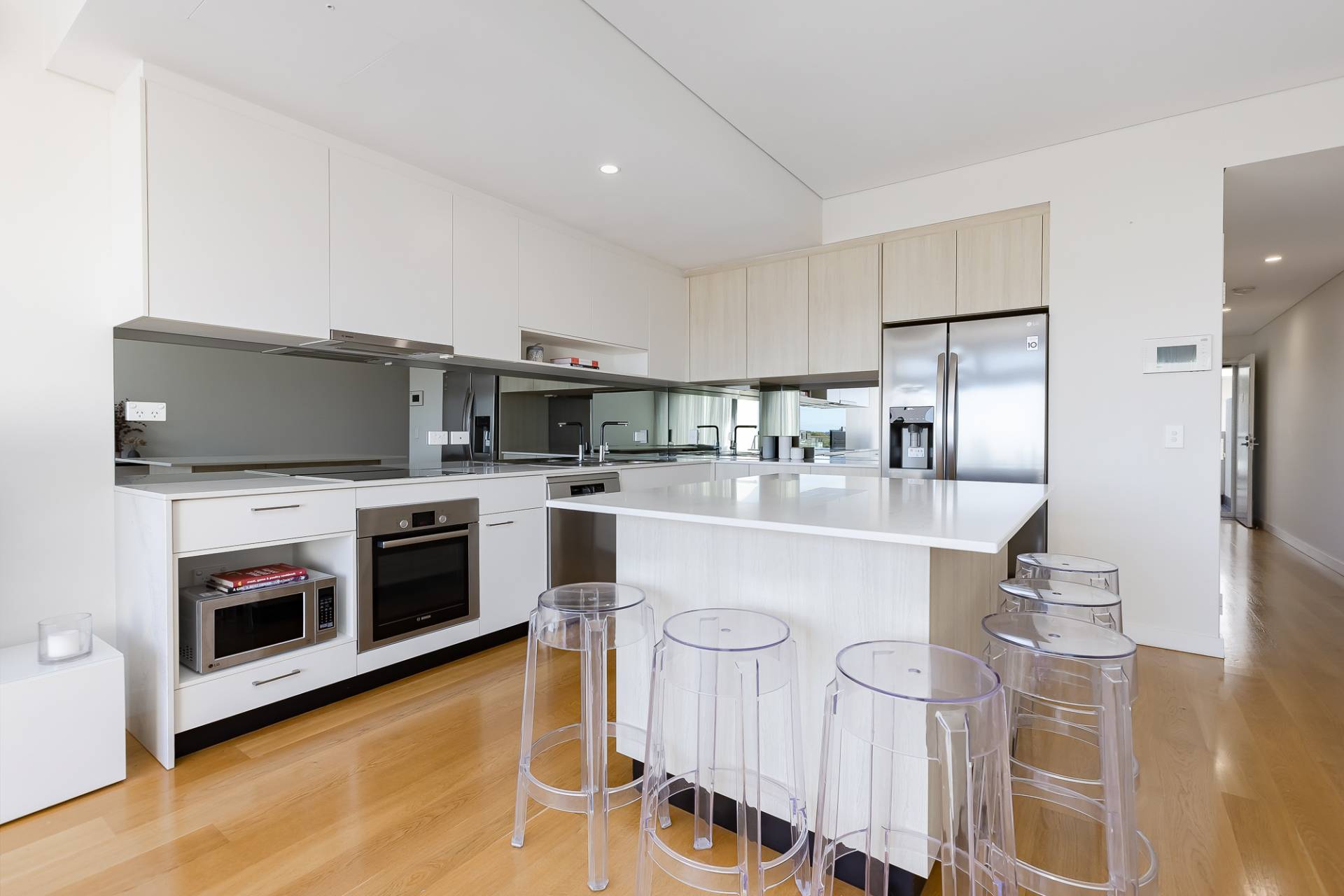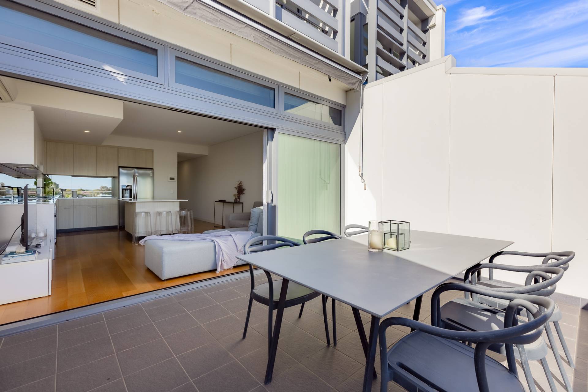 Inside, the open-plan living space is bathed in natural light, seamlessly flowing out to a generous terrace with leafy treetop views, ideal for relaxed entertaining or enjoying Perth’s endless summer evenings. The gourmet kitchen features sleek stone benchtops, ample storage, quality stainless steel appliances, a breakfast bar, and modern finishes that cater to everyday convenience and effortless entertaining. A spacious bedroom, modern bathroom, and well-considered inclusions such as timber flooring, full-height windows, and quality window treatments create a cohesive and welcoming environment.