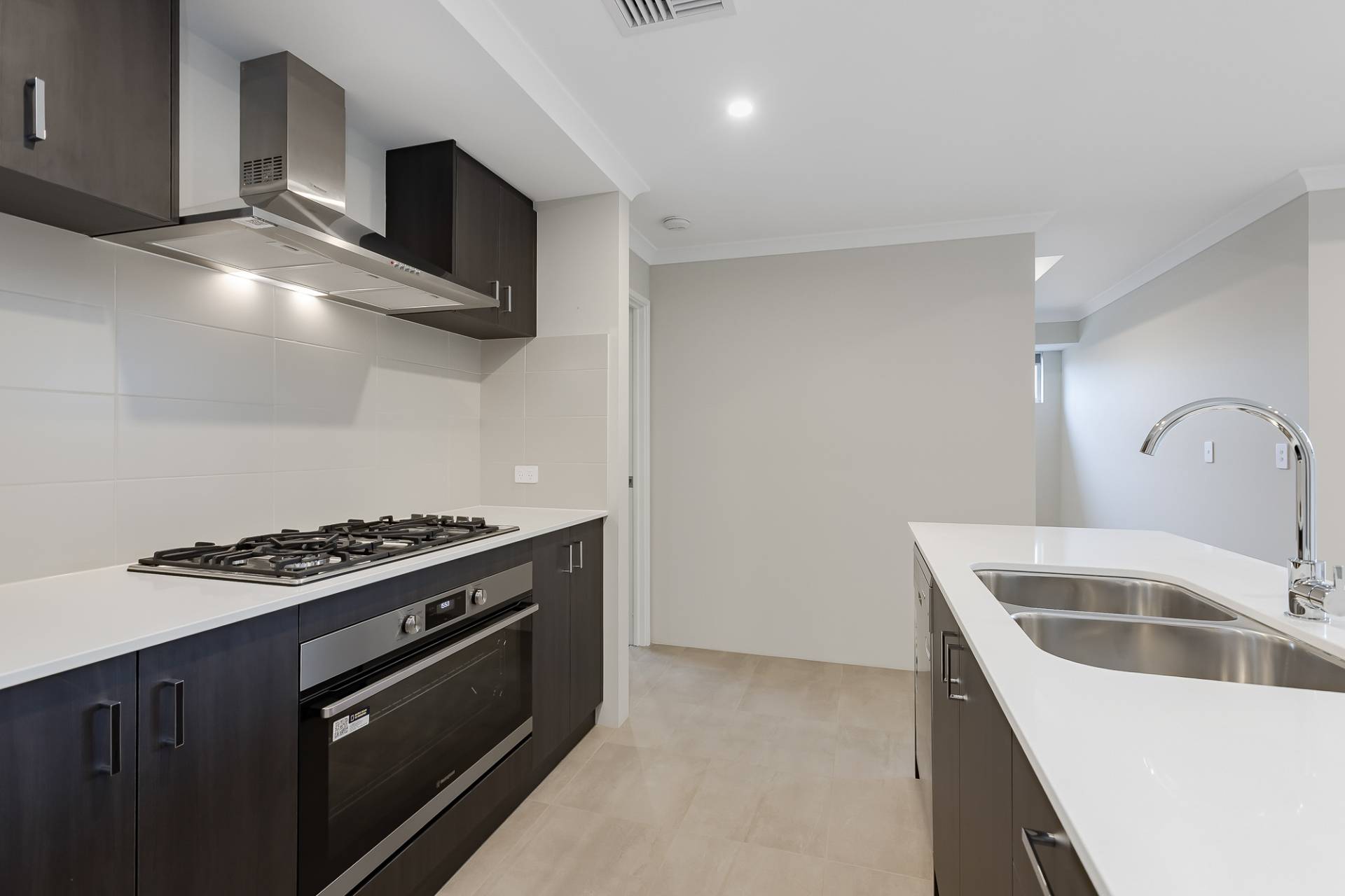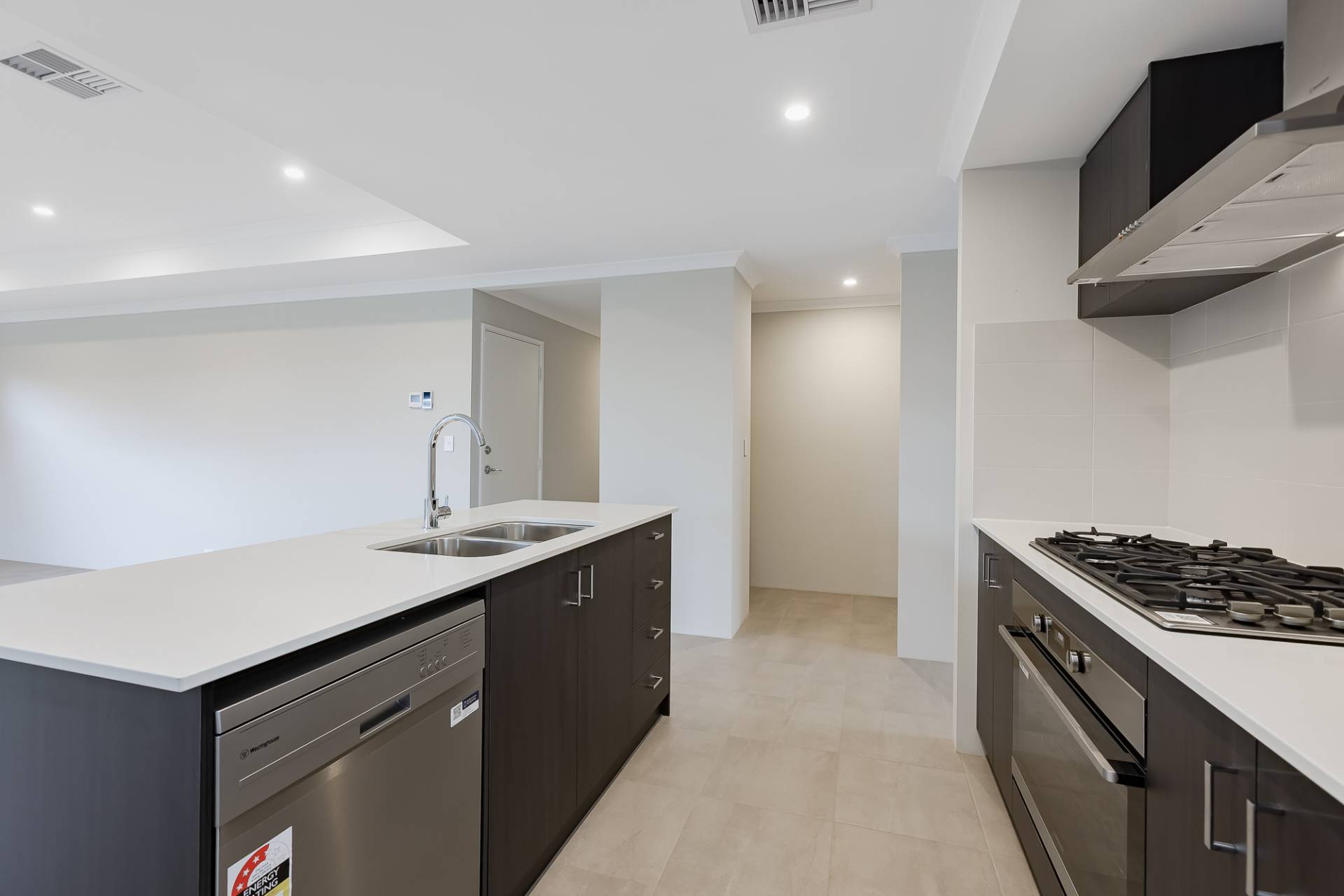 At the heart of the home, the kitchen is both stylish and practical, featuring a large gas cooktop and oven, stone benchtops, overhead cabinetry, and a breakfast bar for casual meals. There's also a walk in pantry, a designated fridge nook, and a dishwasher for added convenience.