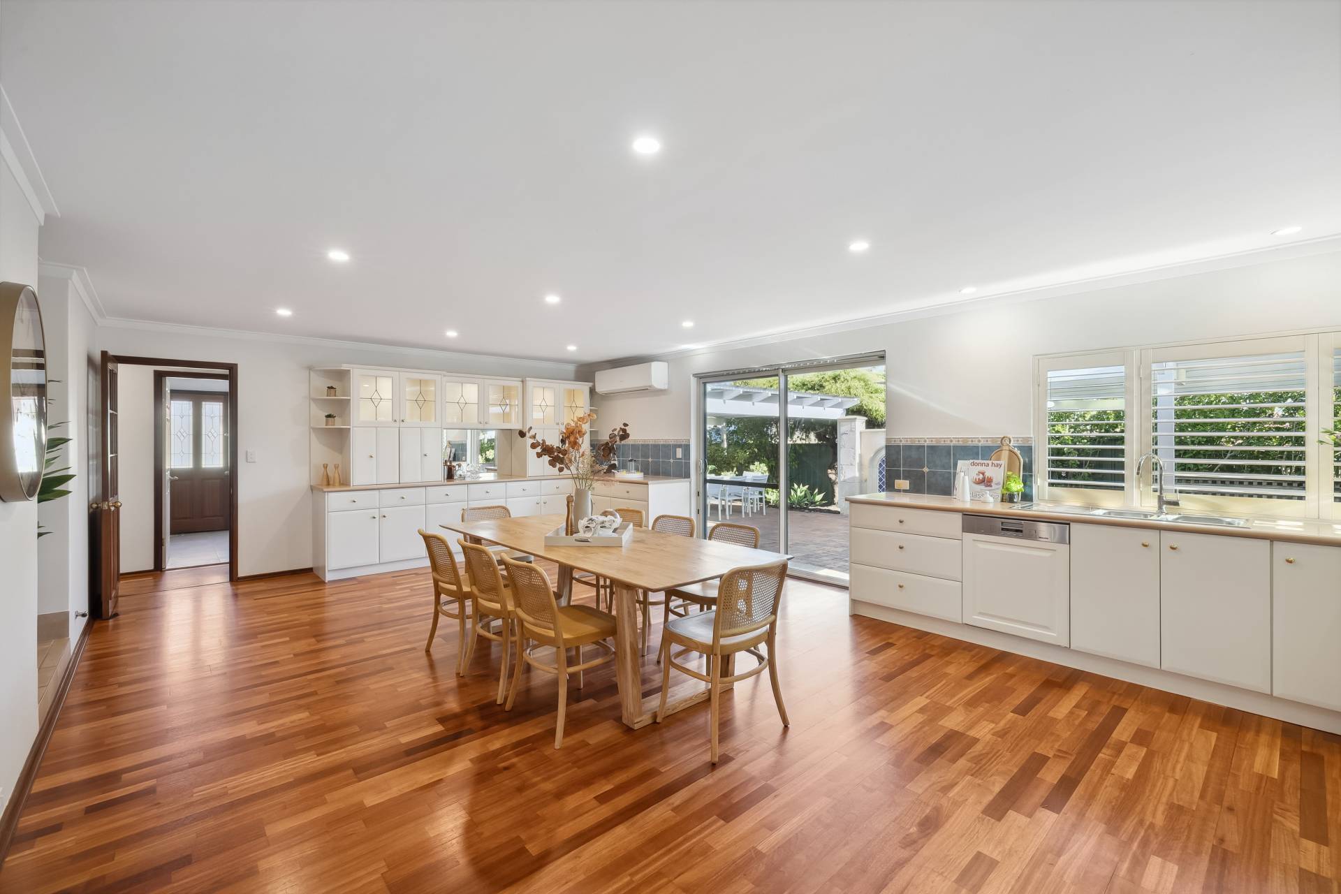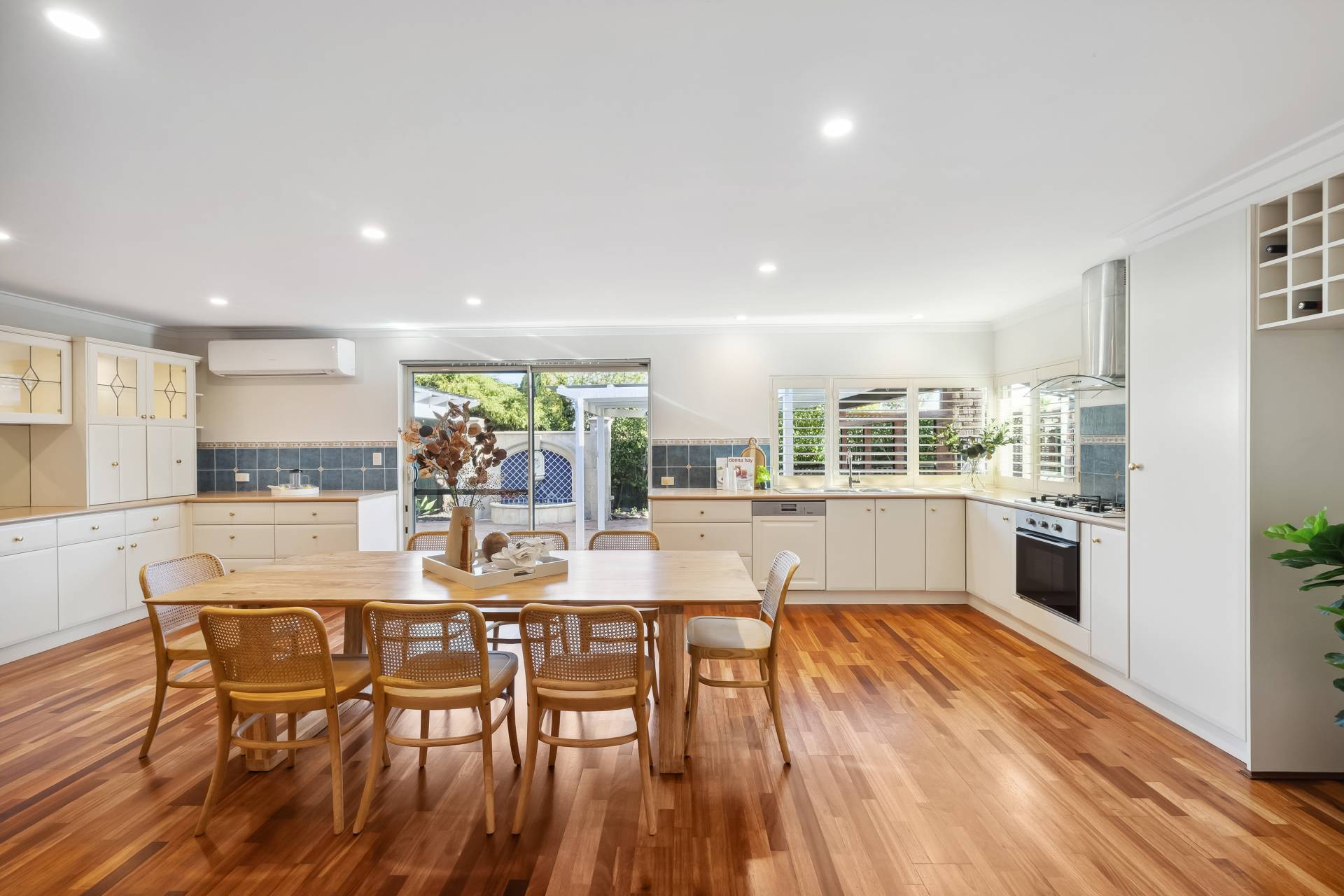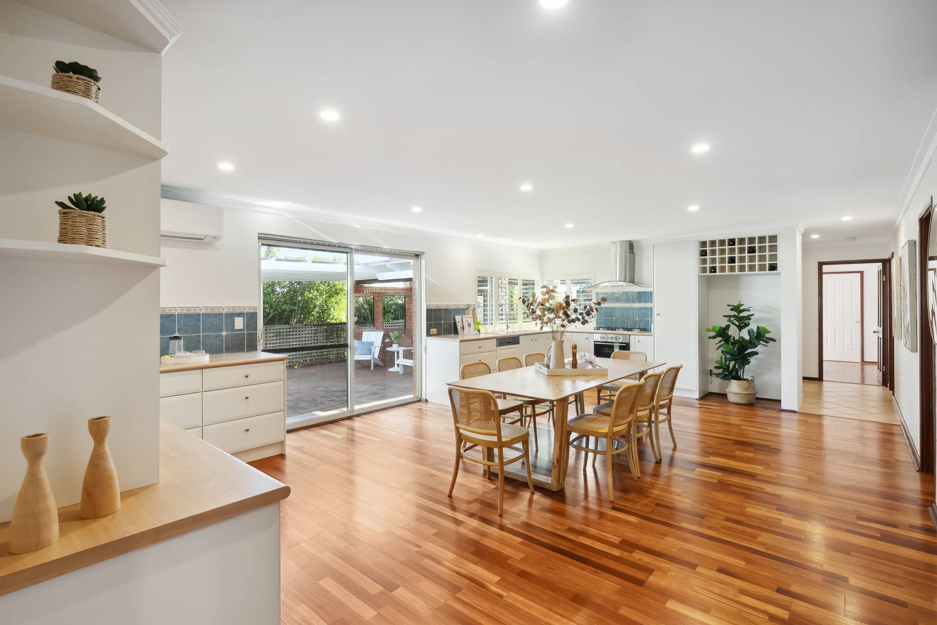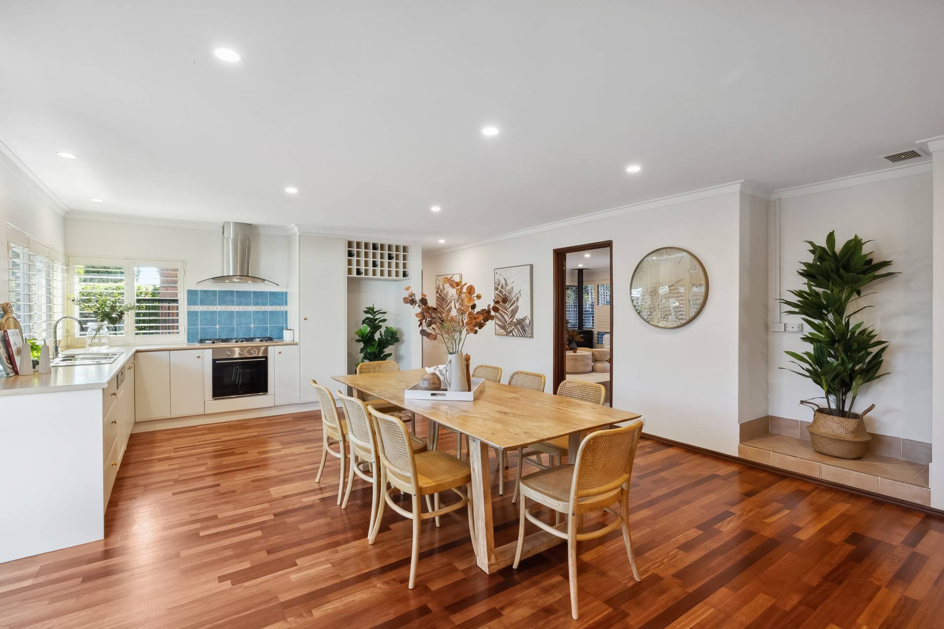 Step inside to find a freshly painted interior, complemented by stylish LED downlights, warm wooden flooring throughout the main living zones and bedrooms, and a modern finish from top to bottom. The spacious kitchen is a standout, featuring gas cooktop, electric oven, pantry, wine rack, dishwasher and plantation blinds – all overlooking a versatile area that can function as a family room, dining space, or open-plan living.