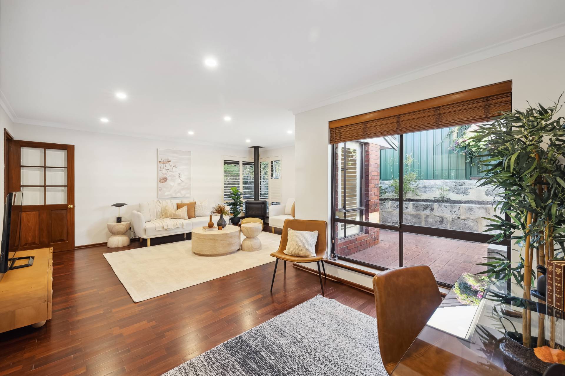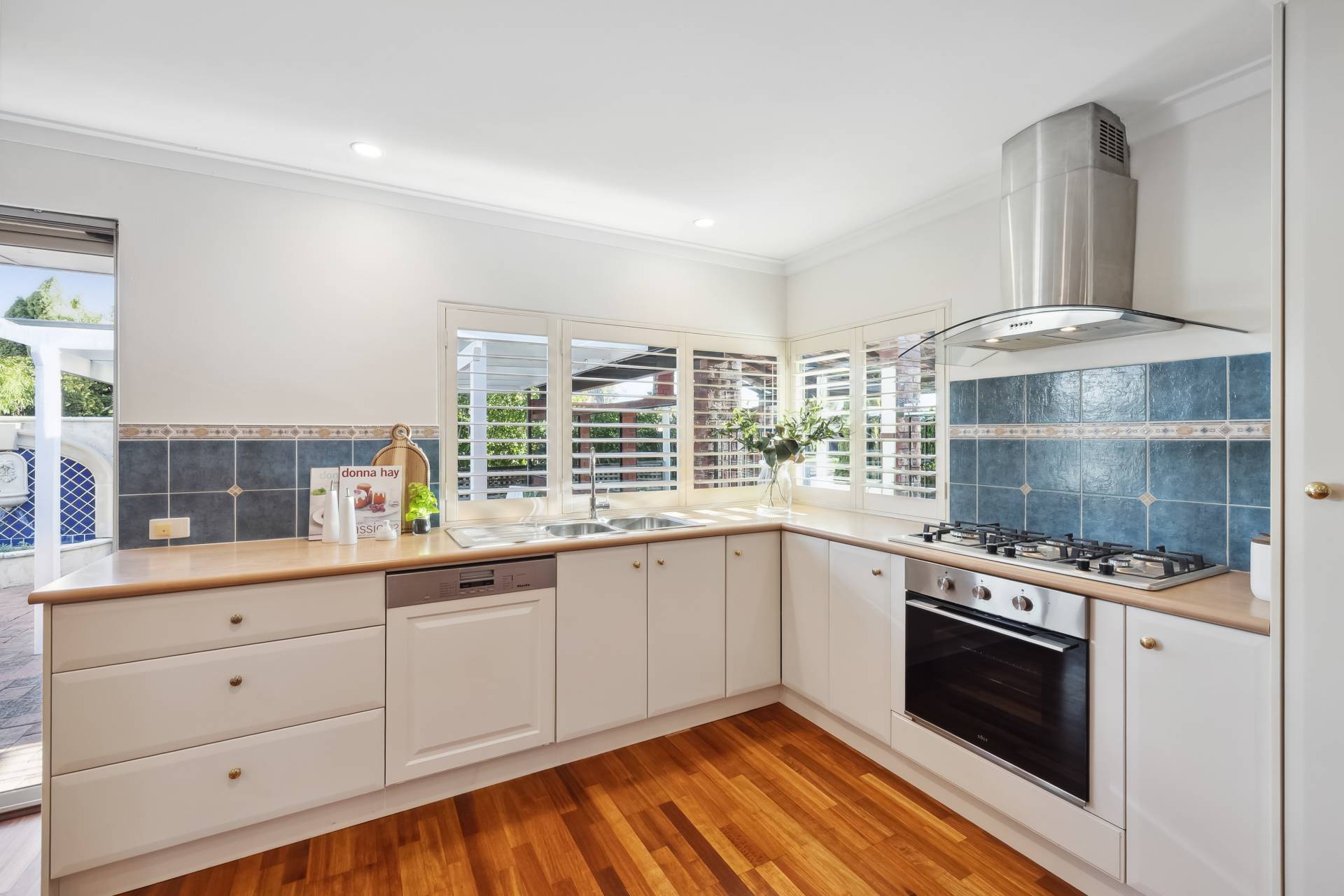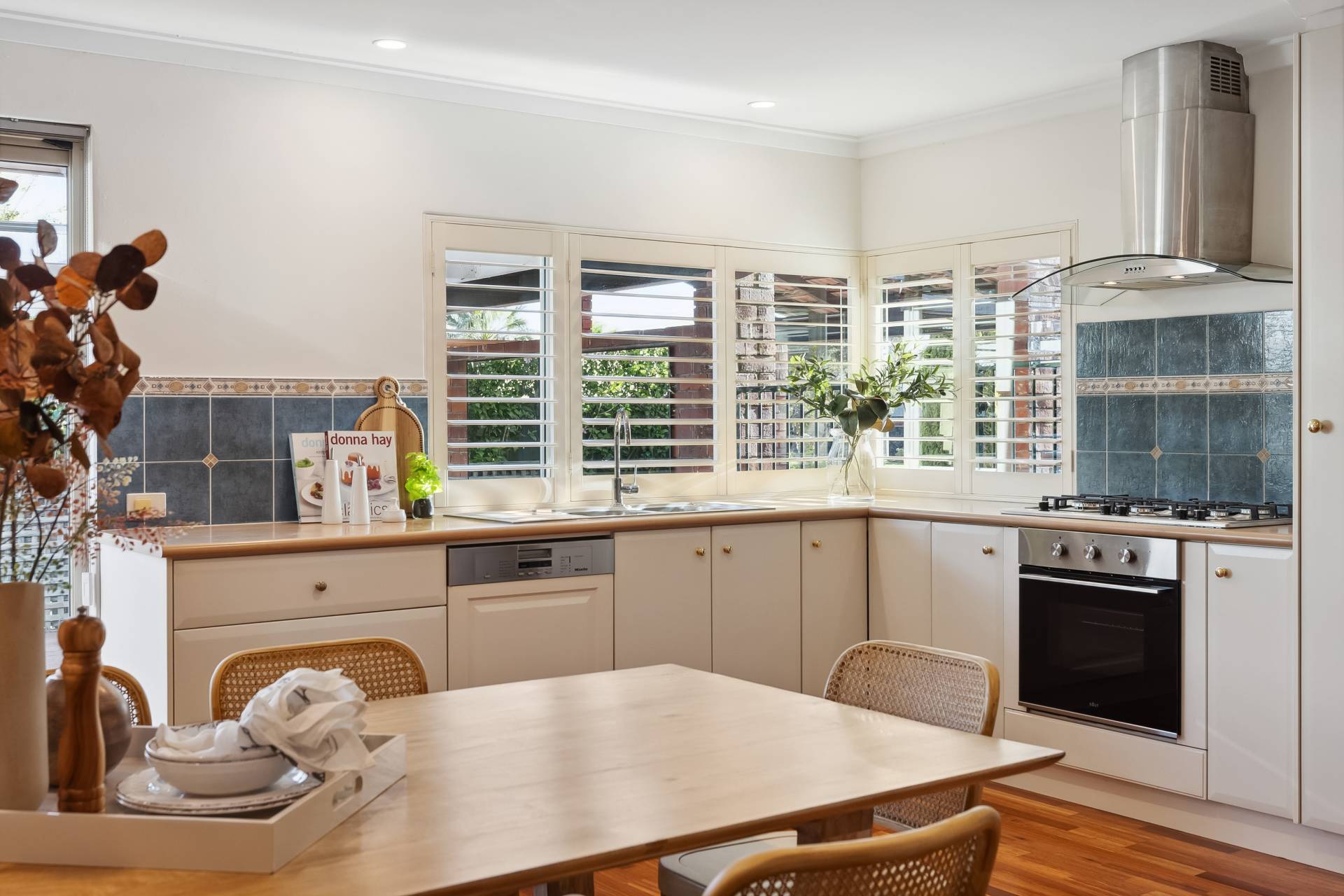 Step inside to find a freshly painted interior, complemented by stylish LED downlights, warm wooden flooring throughout the main living zones and bedrooms, and a modern finish from top to bottom. The spacious kitchen is a standout, featuring gas cooktop, electric oven, pantry, wine rack, dishwasher and plantation blinds – all overlooking a versatile area that can function as a family room, dining space, or open-plan living.
