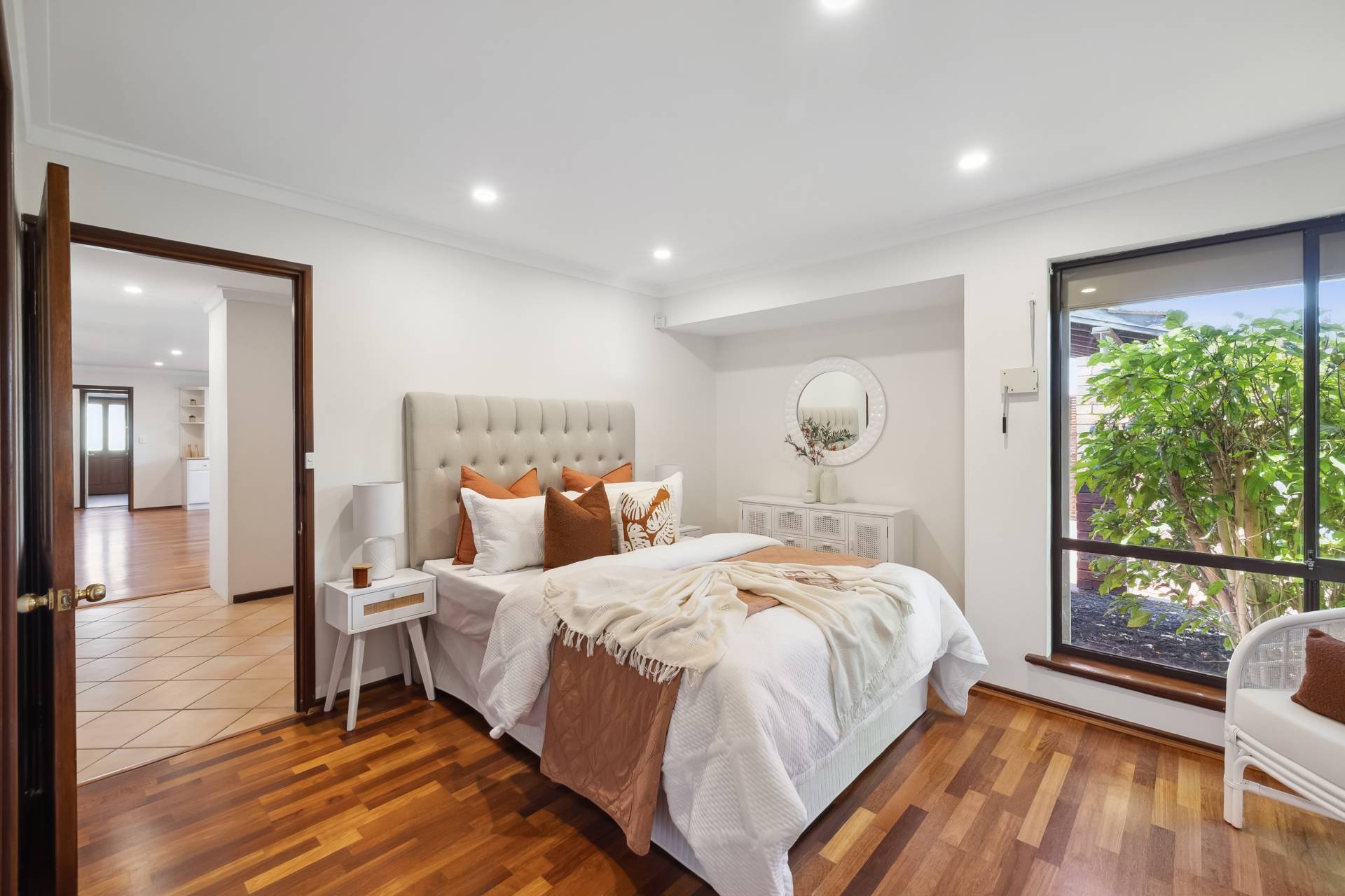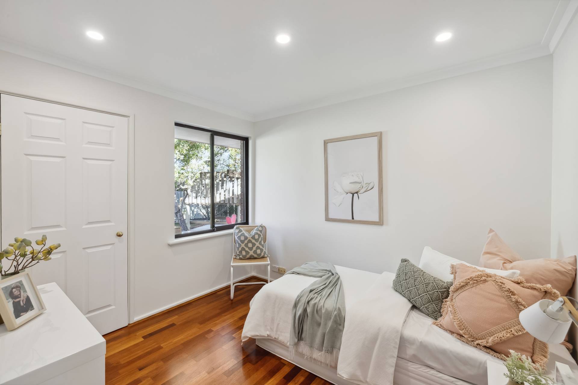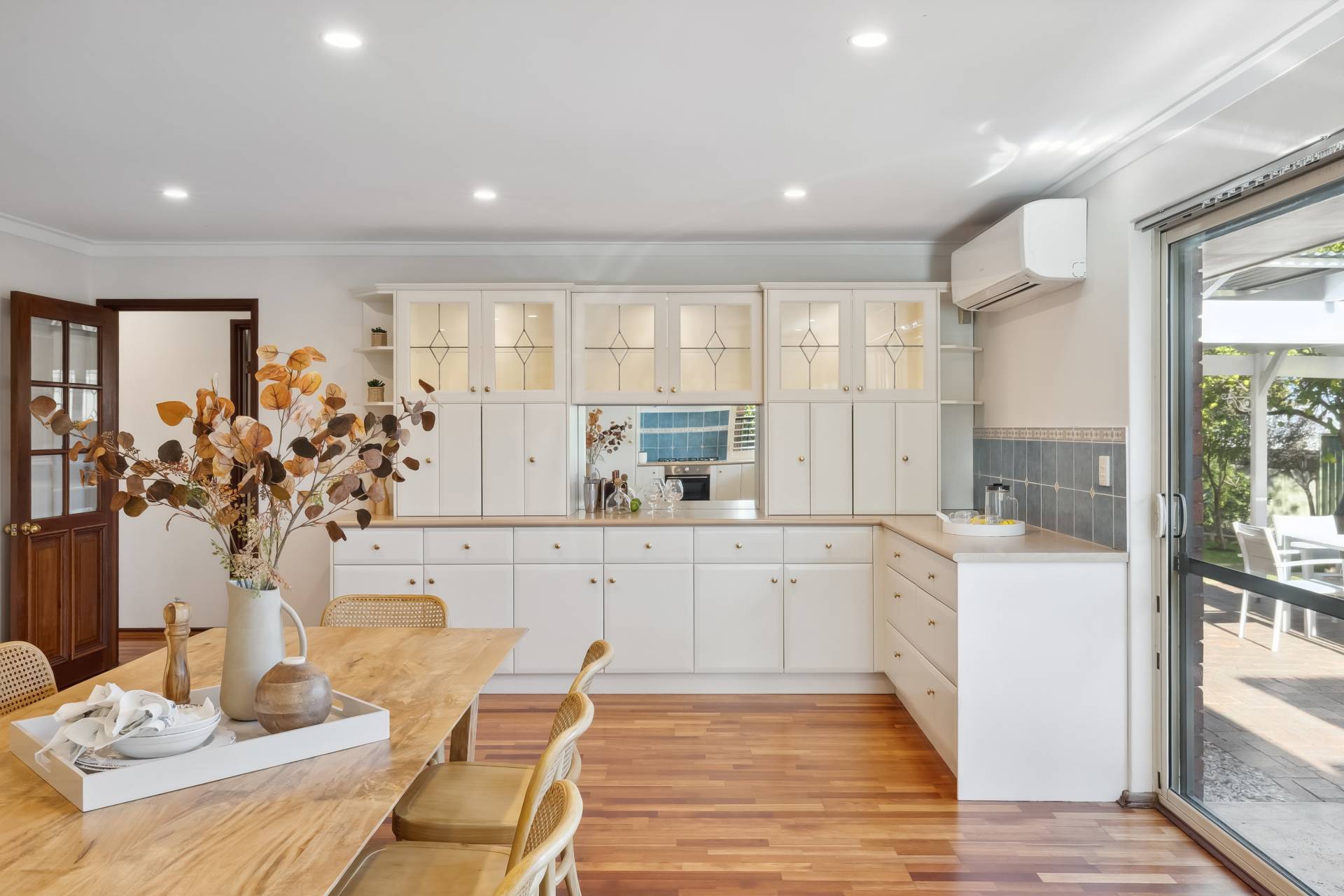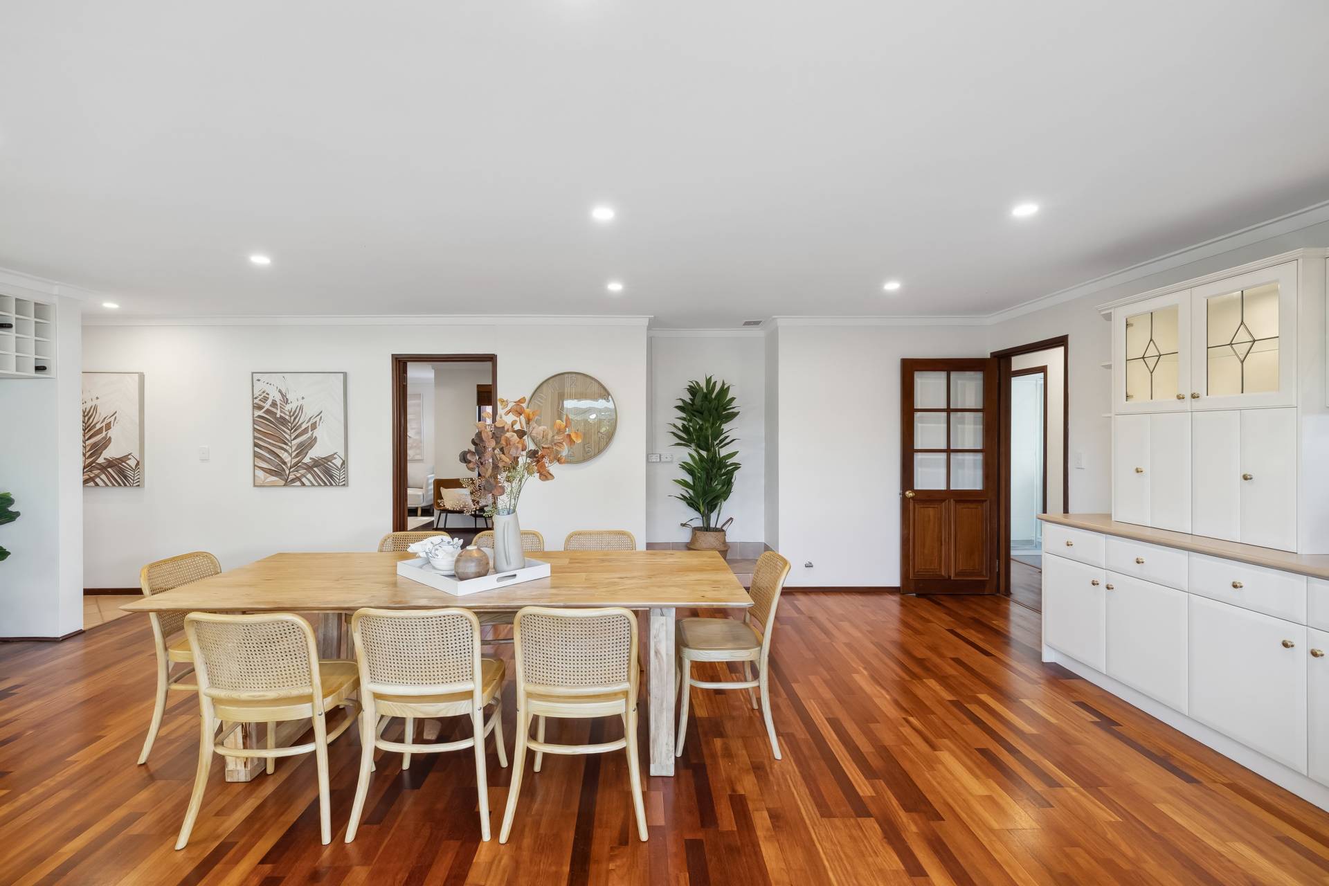 Step inside to find a freshly painted interior, complemented by stylish LED downlights, warm wooden flooring throughout the main living zones and bedrooms, and a modern finish from top to bottom. The spacious kitchen is a standout, featuring gas cooktop, electric oven, pantry, wine rack, dishwasher and plantation blinds – all overlooking a versatile area that can function as a family room, dining space, or open-plan living.