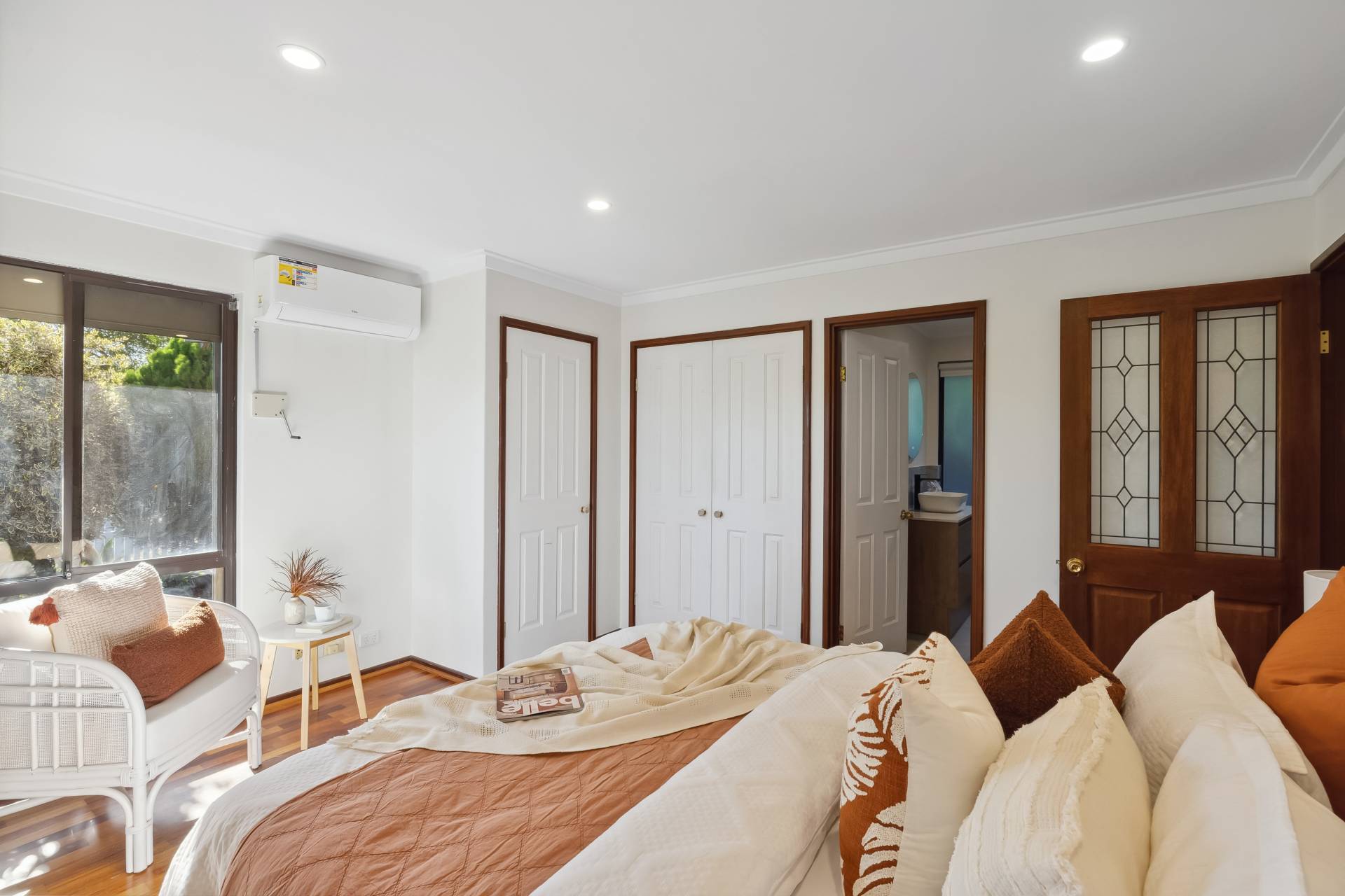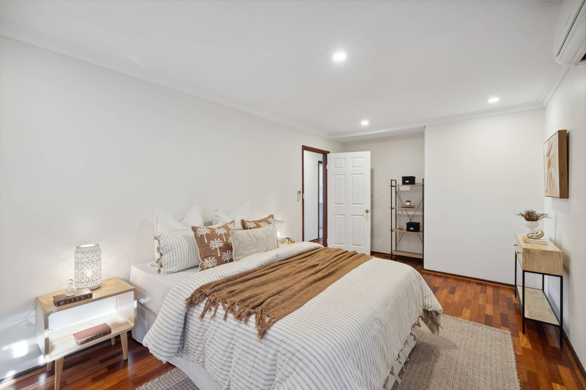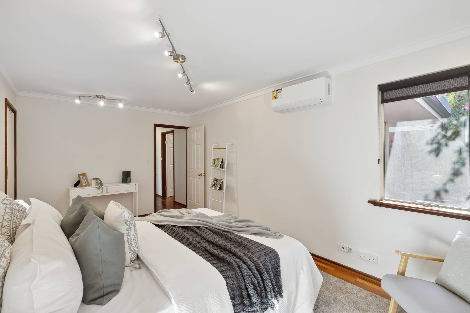 The air-conditioned master bedroom is located at the front of the home and includes two built-in robes, roller shutters, and a renovated ensuite with stone benchtop. The three additional bedrooms are generously sized, two of which are also air-conditioned, and all feature built-in robes and wooden flooring.