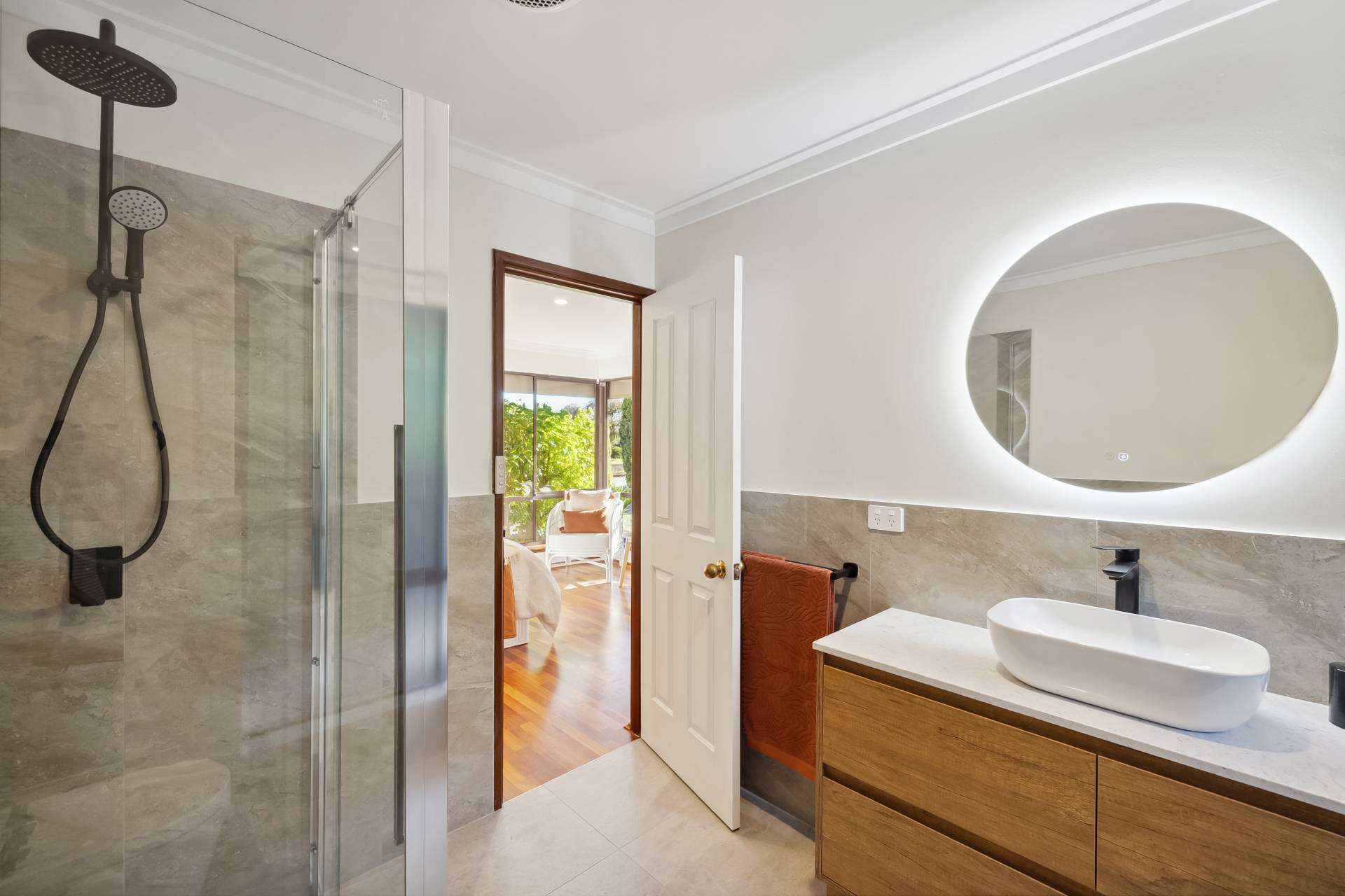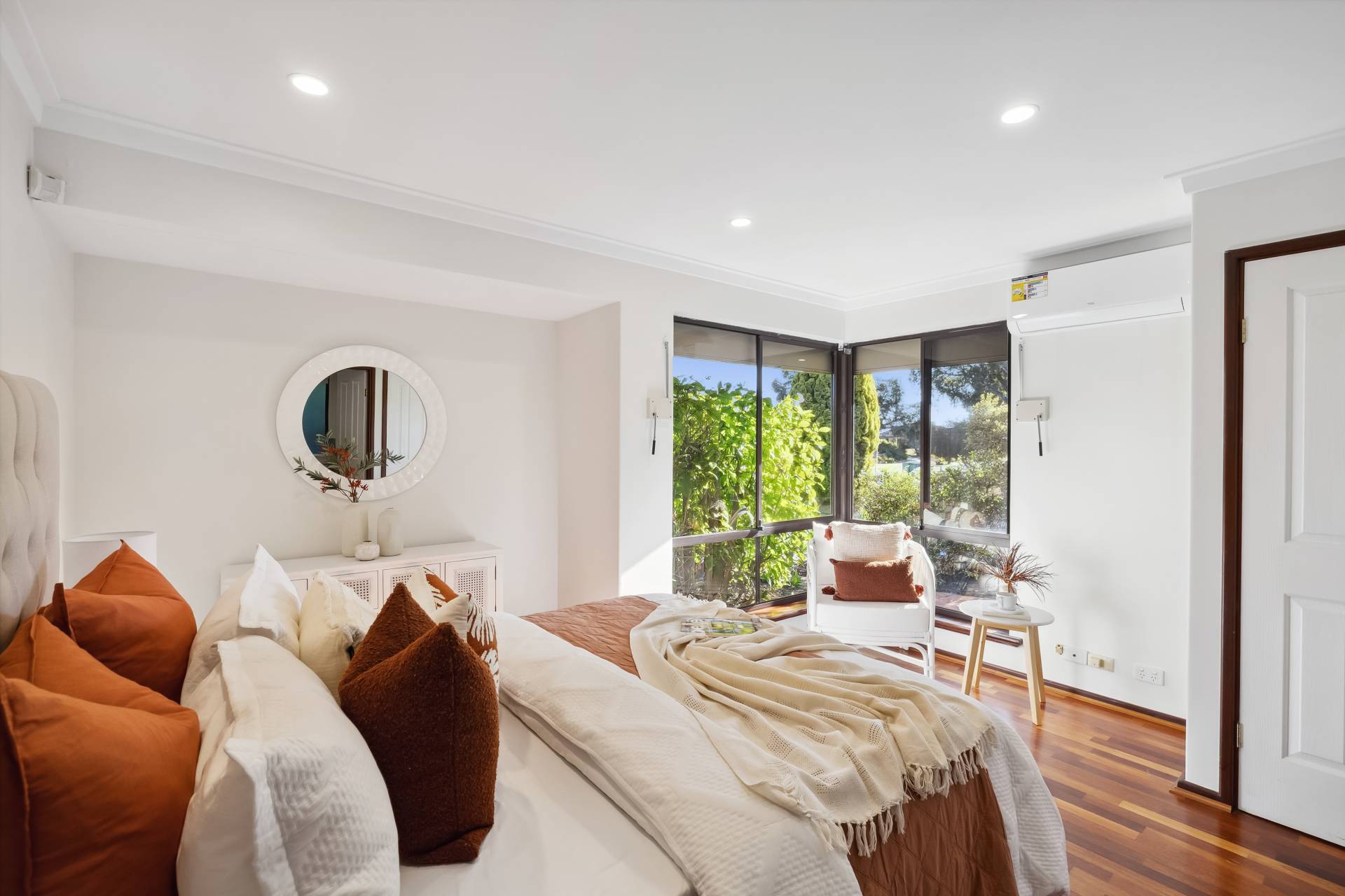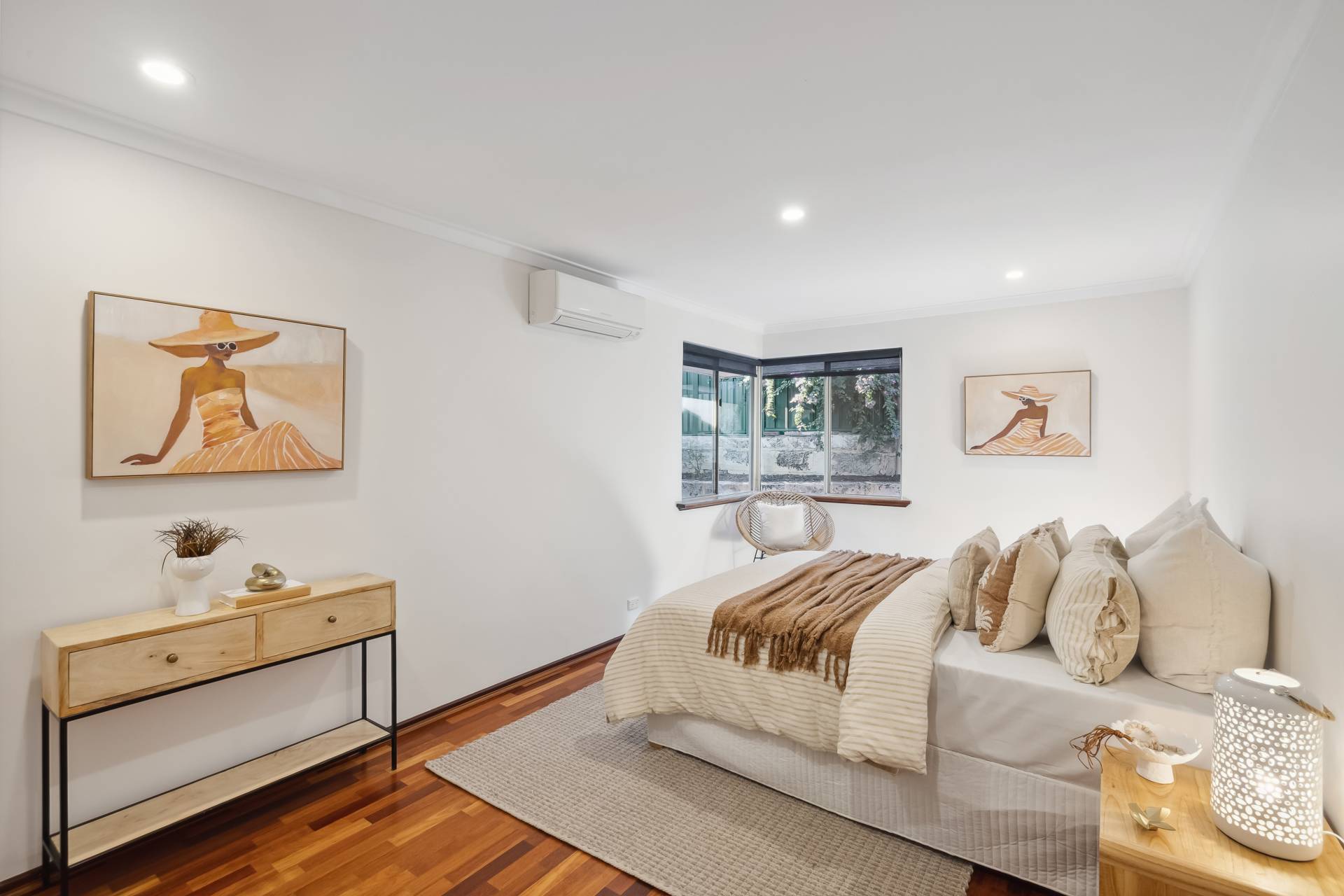 The air-conditioned master bedroom is located at the front of the home and includes two built-in robes, roller shutters, and a renovated ensuite with stone benchtop. The three additional bedrooms are generously sized, two of which are also air-conditioned, and all feature built-in robes and wooden flooring.