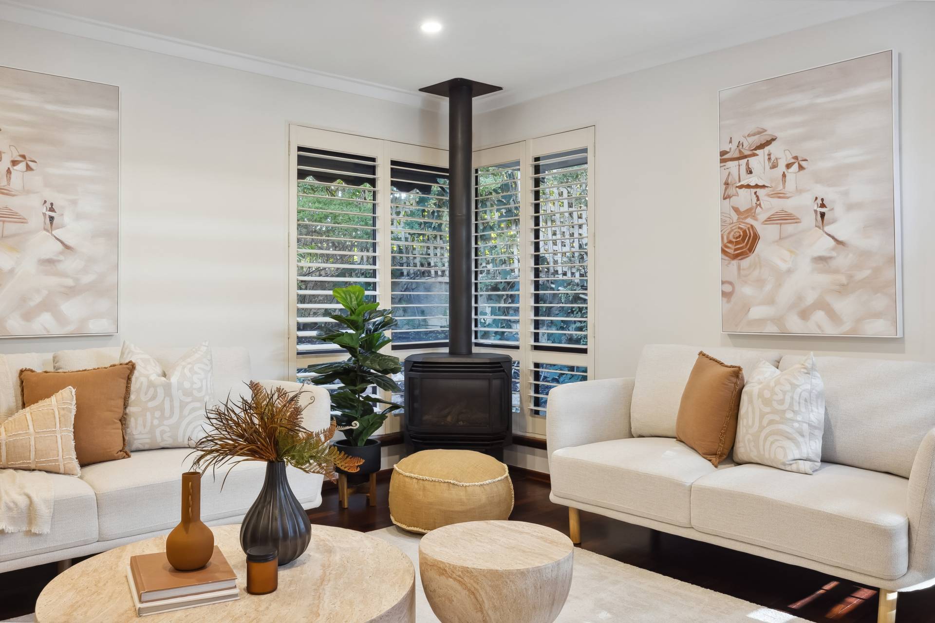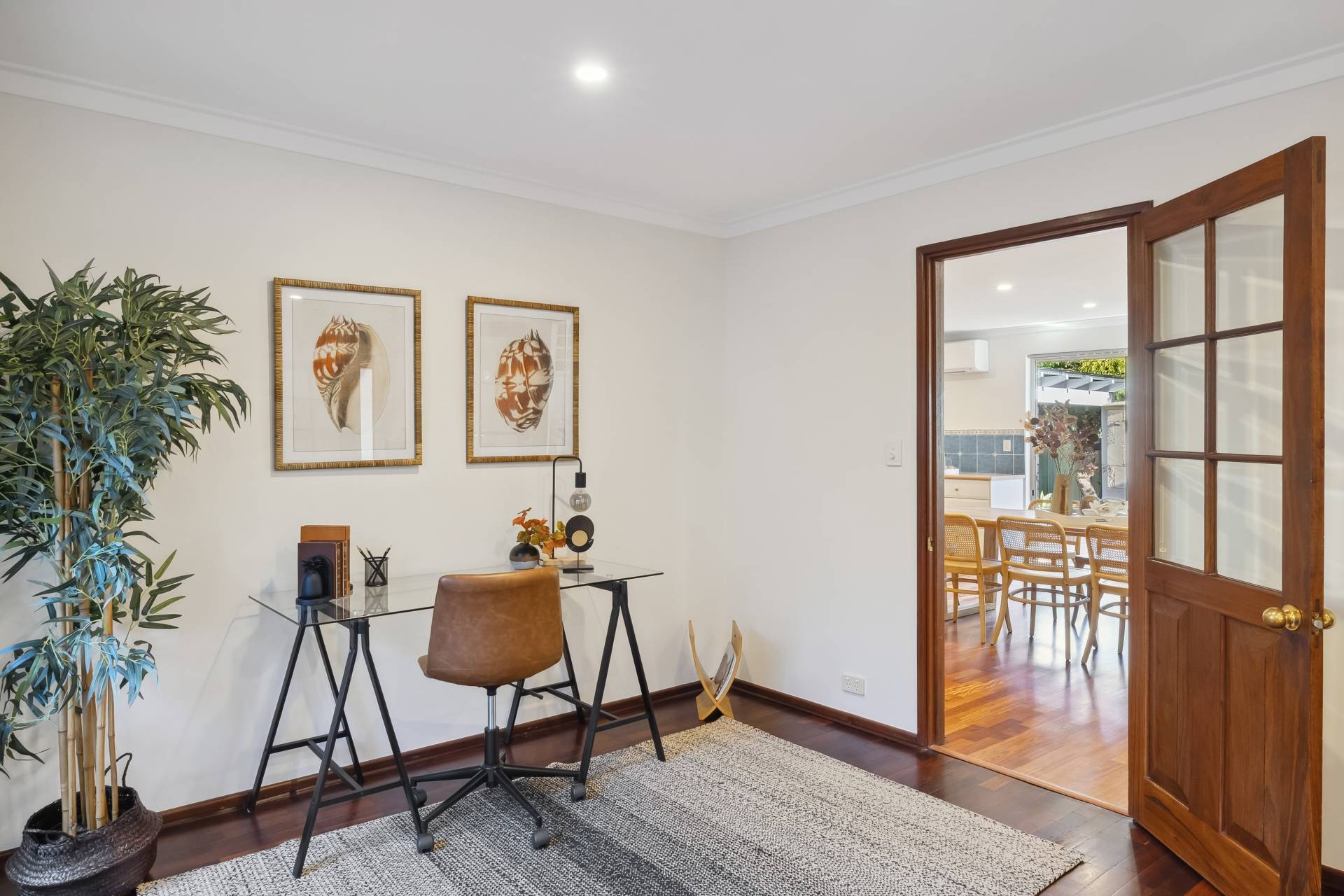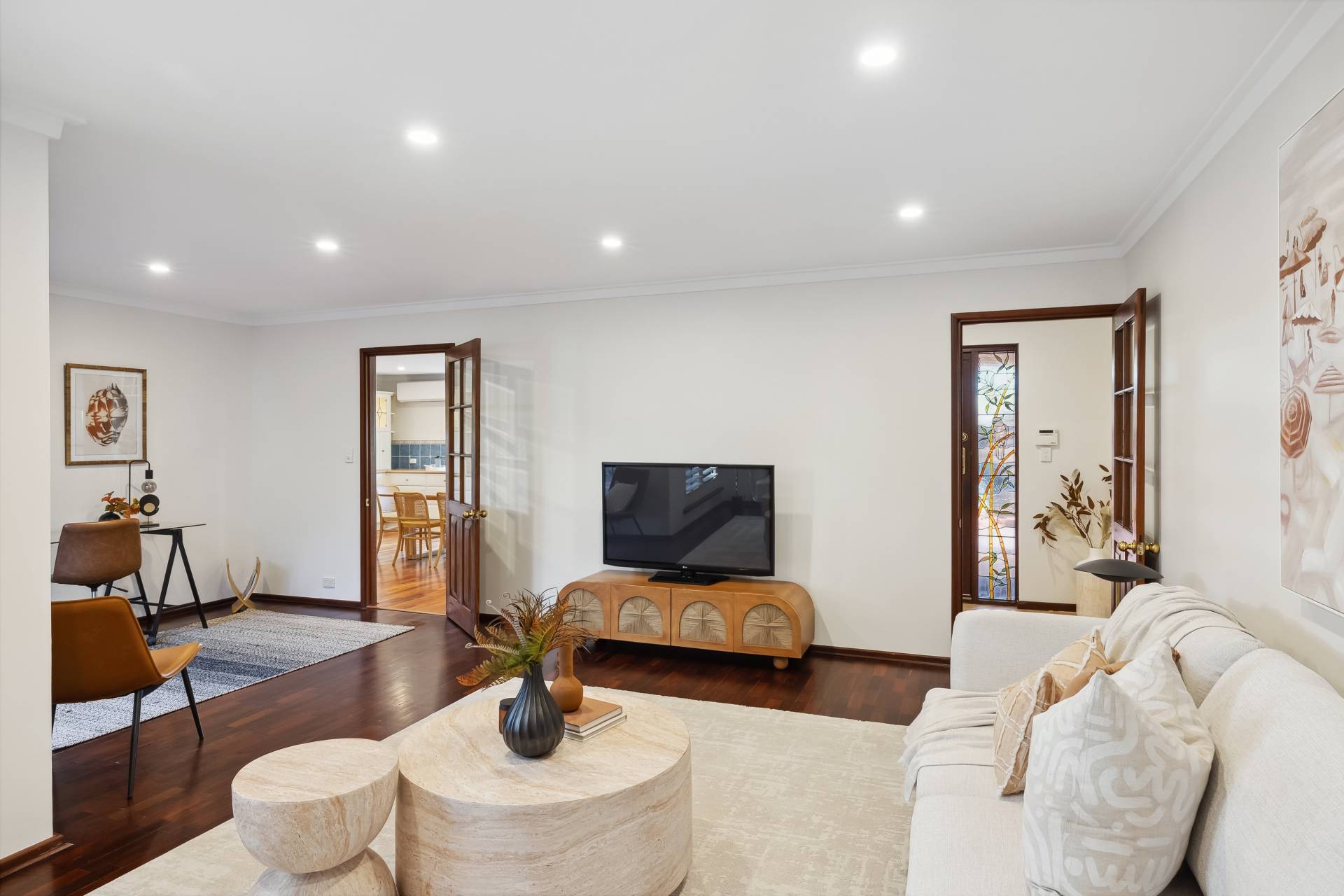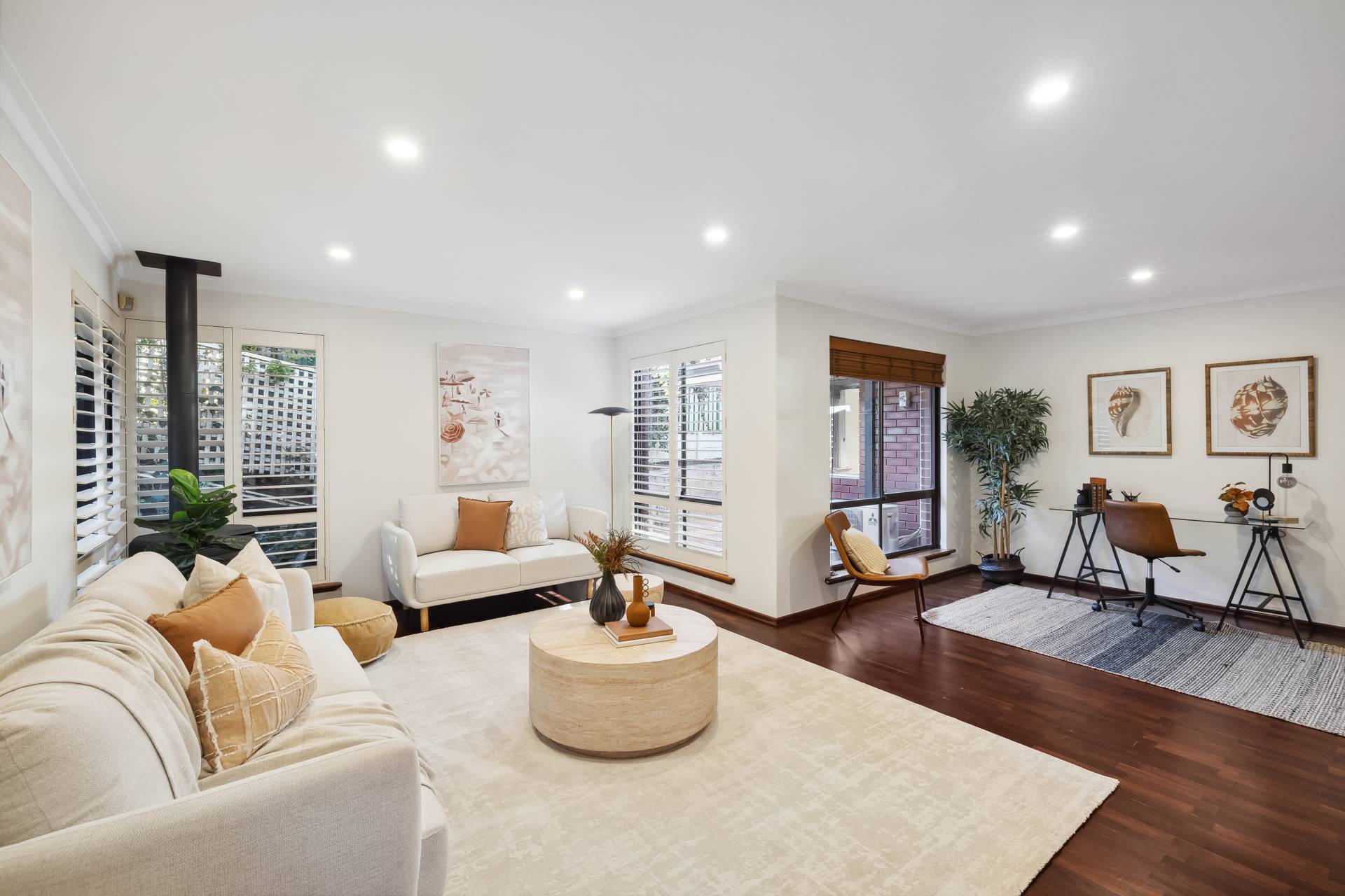 Off the entry hall, the separate lounge offers a welcoming escape with its beautiful Jarrah flooring, gas fireplace, French doors, and cozy study nook or formal dining option – ideal for quiet evenings or working from home.
