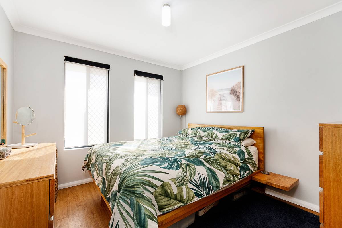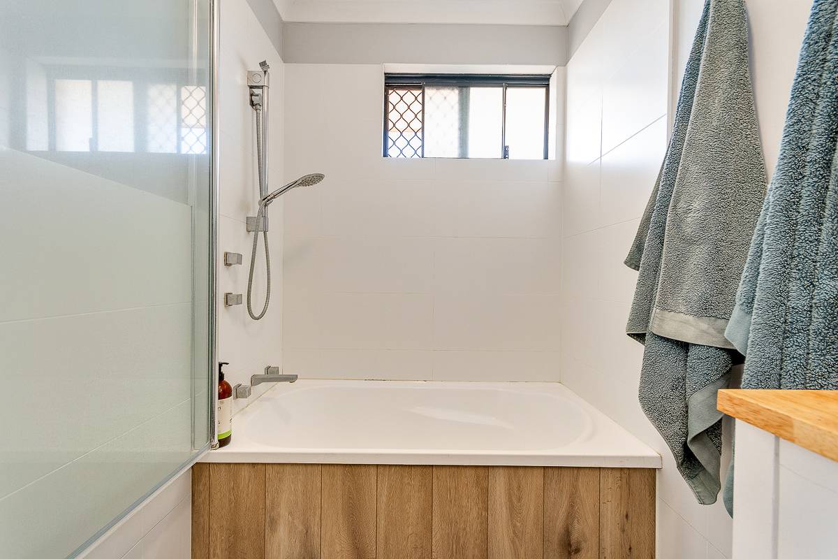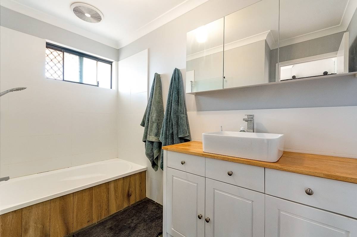 The home offers three well-sized bedrooms, including a generous master bedroom with a walk-in robe, while the contemporary renovated bathroom includes a shower-over-bath and vanity. There’s also a separate laundry with stainless steel trough sink, separate WC, and a built-in linen cupboard for additional storage.