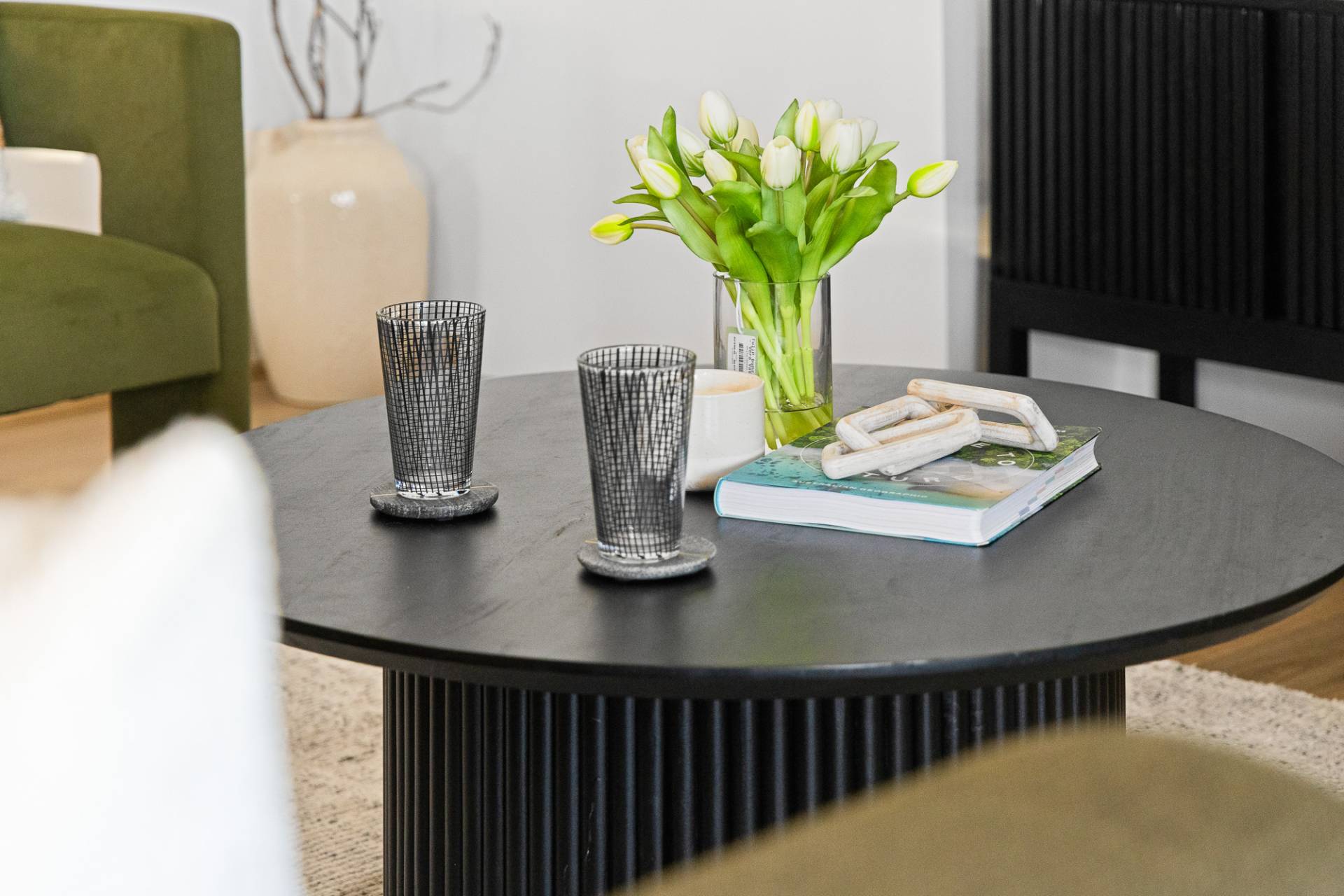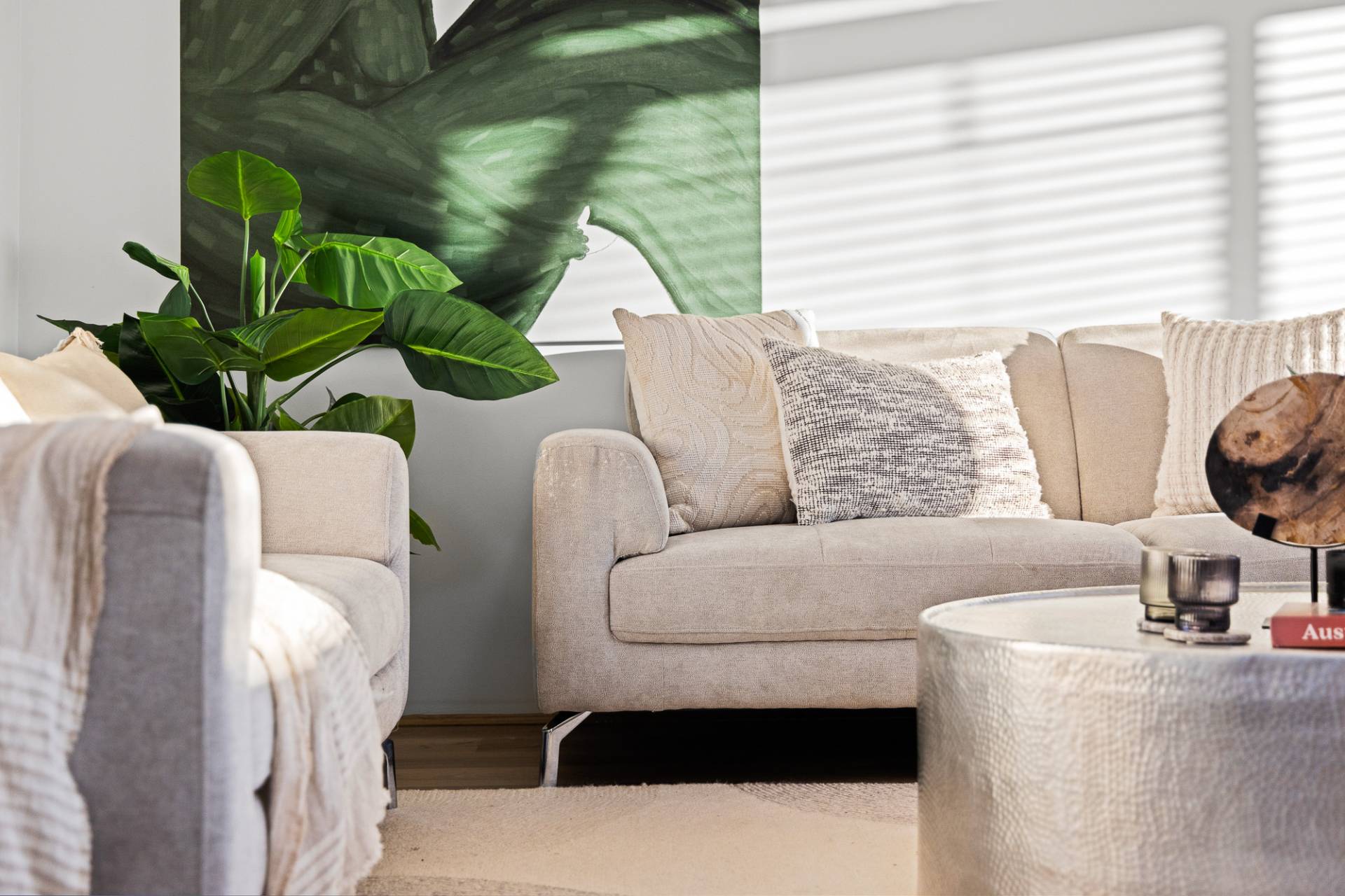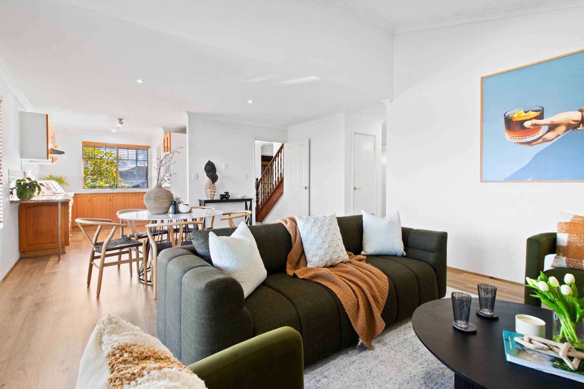 • Light-filled open-plan living, dining, and kitchen with timber-look flooring and high ceilings
