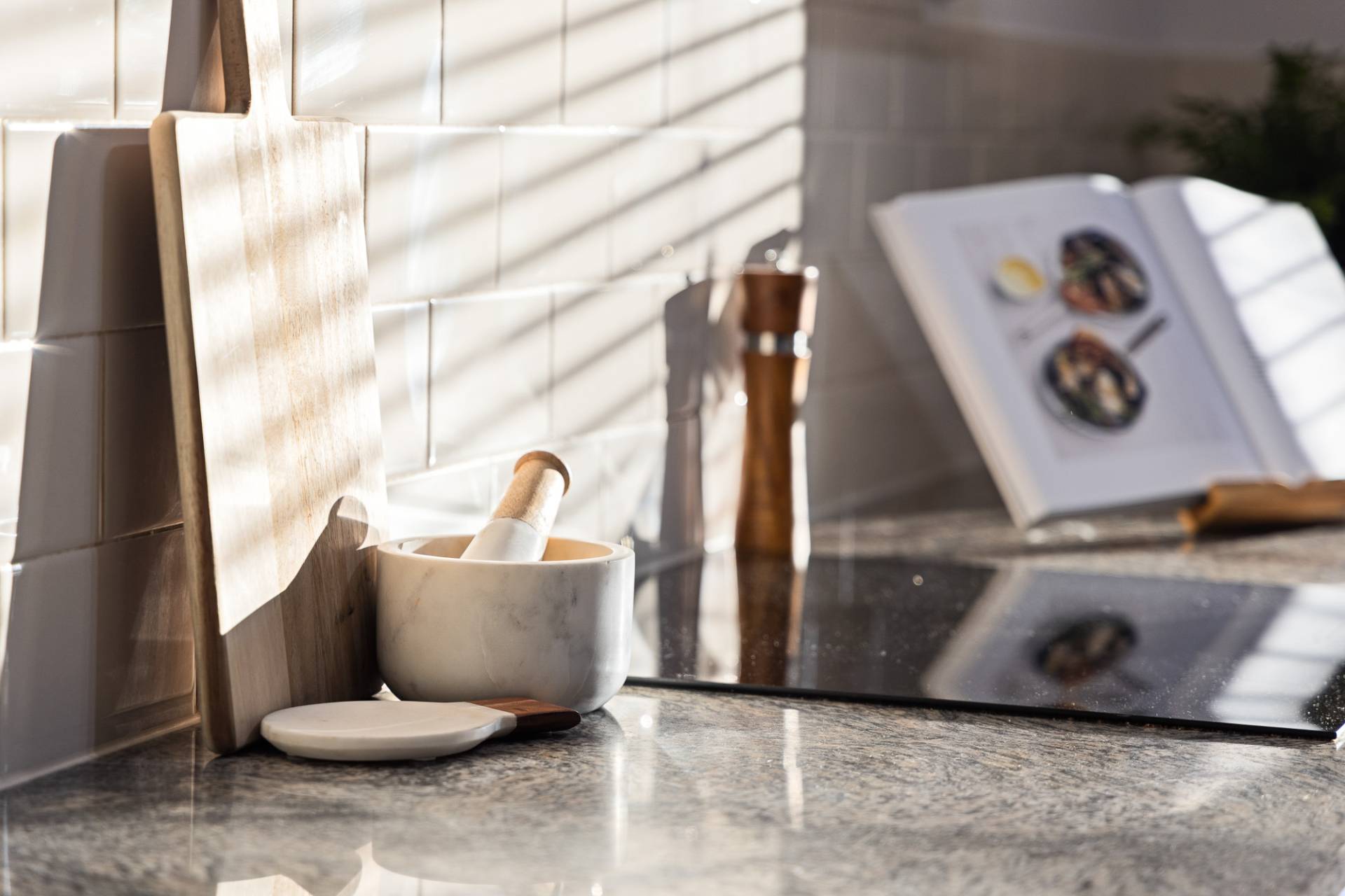 • Warm kitchen with granite benchtops, subway tile splashback, double sinks, Westinghouse 4-burner induction cooktop, stainless steel rangehood, and corner walk-in pantry