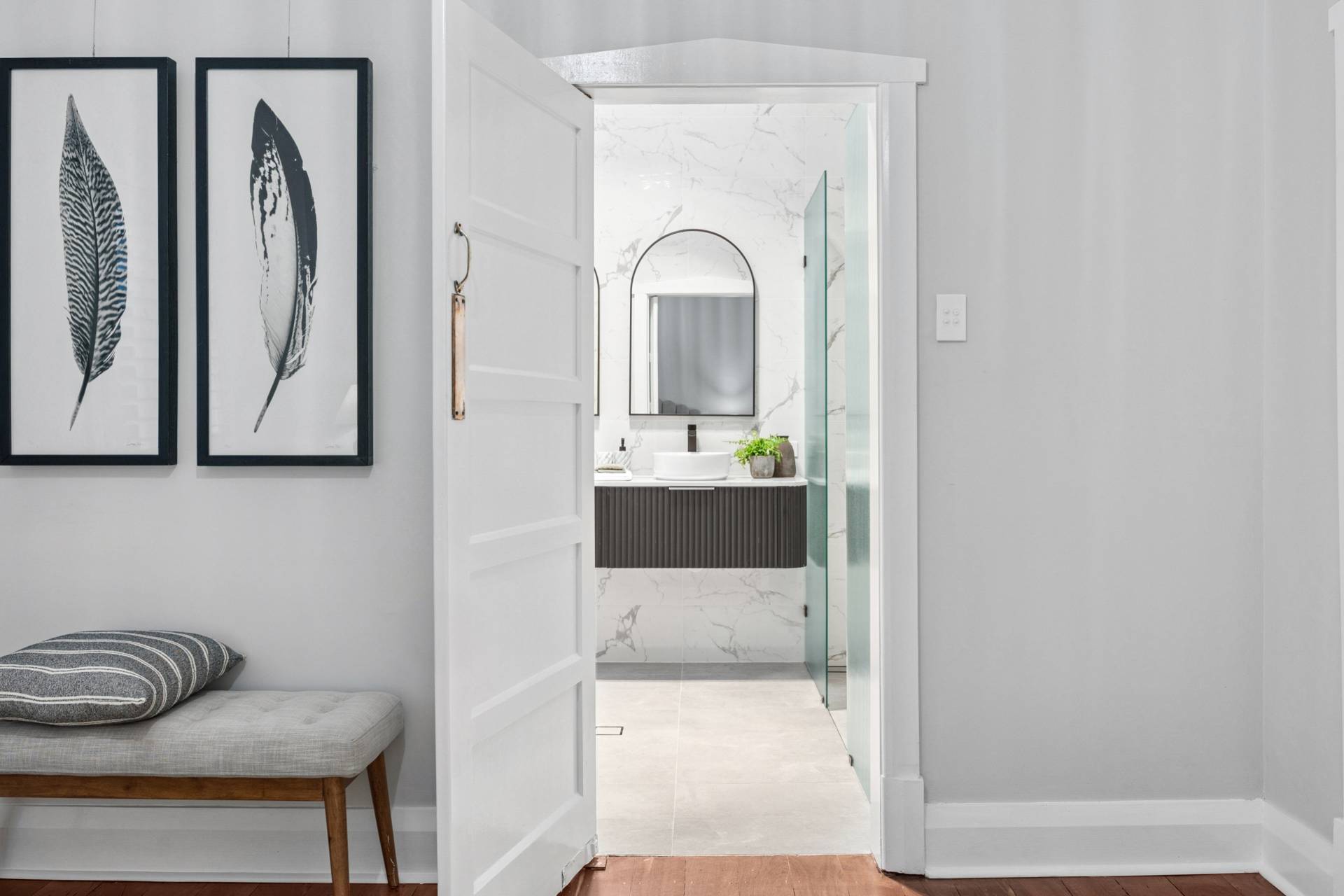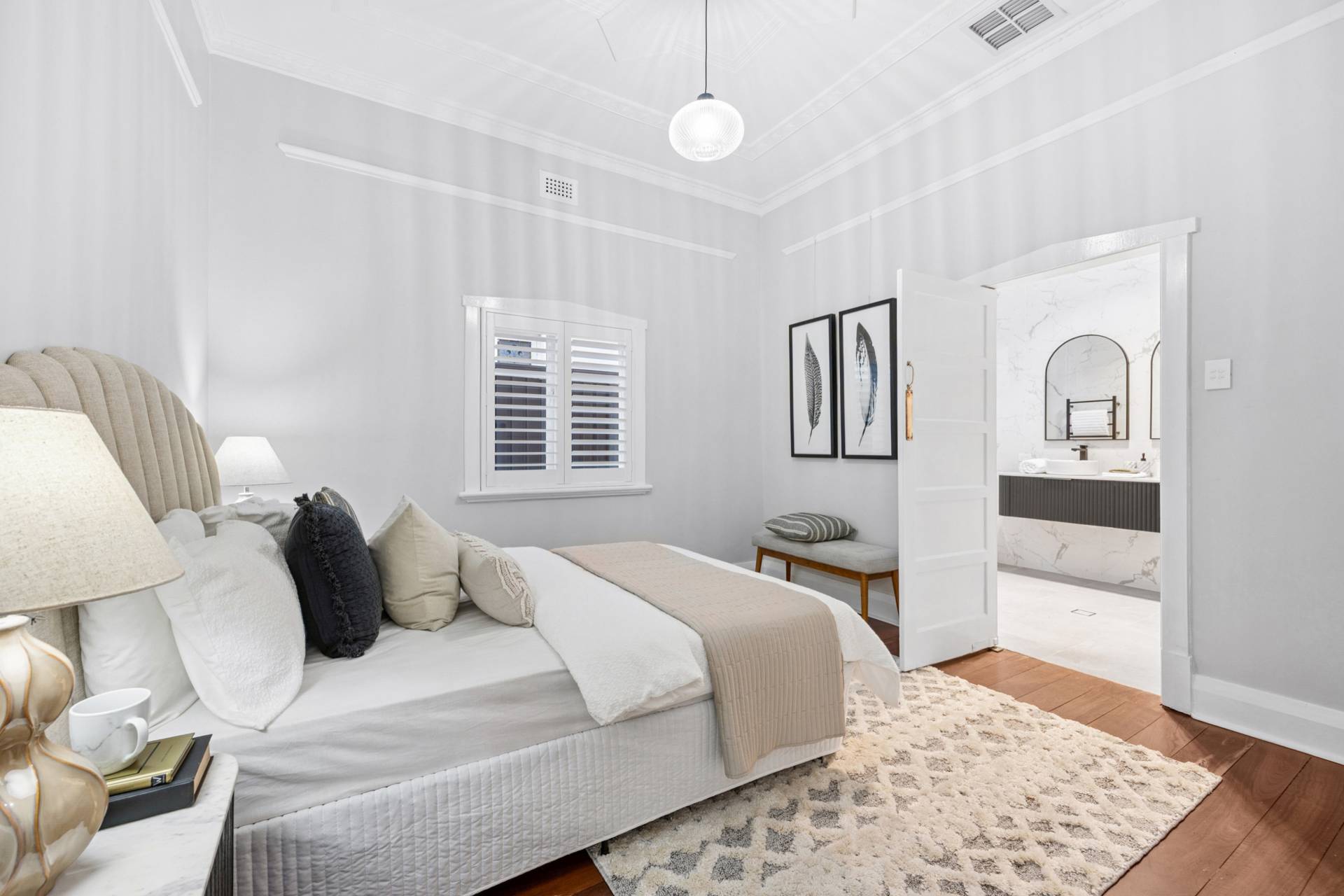 The front wing of the home features three generously proportioned bedrooms, each filled with natural light through oversized glass-stained windows dressed with plantation shutters. Ornate ceiling detailing, soft neutral tones, and quality finishes create an atmosphere of calm and comfort. A separate lounge room is situated to the front of the home boasting an original fireplace, a timeless centrepiece to the home's heritage. The master suite is a luxurious retreat, complete with built-in robes and a resort-style ensuite showcasing dual vanities, exquisite wall to ceiling marble tiling, a walk-in rain shower and a heated towel rail for ultimate comfort.
