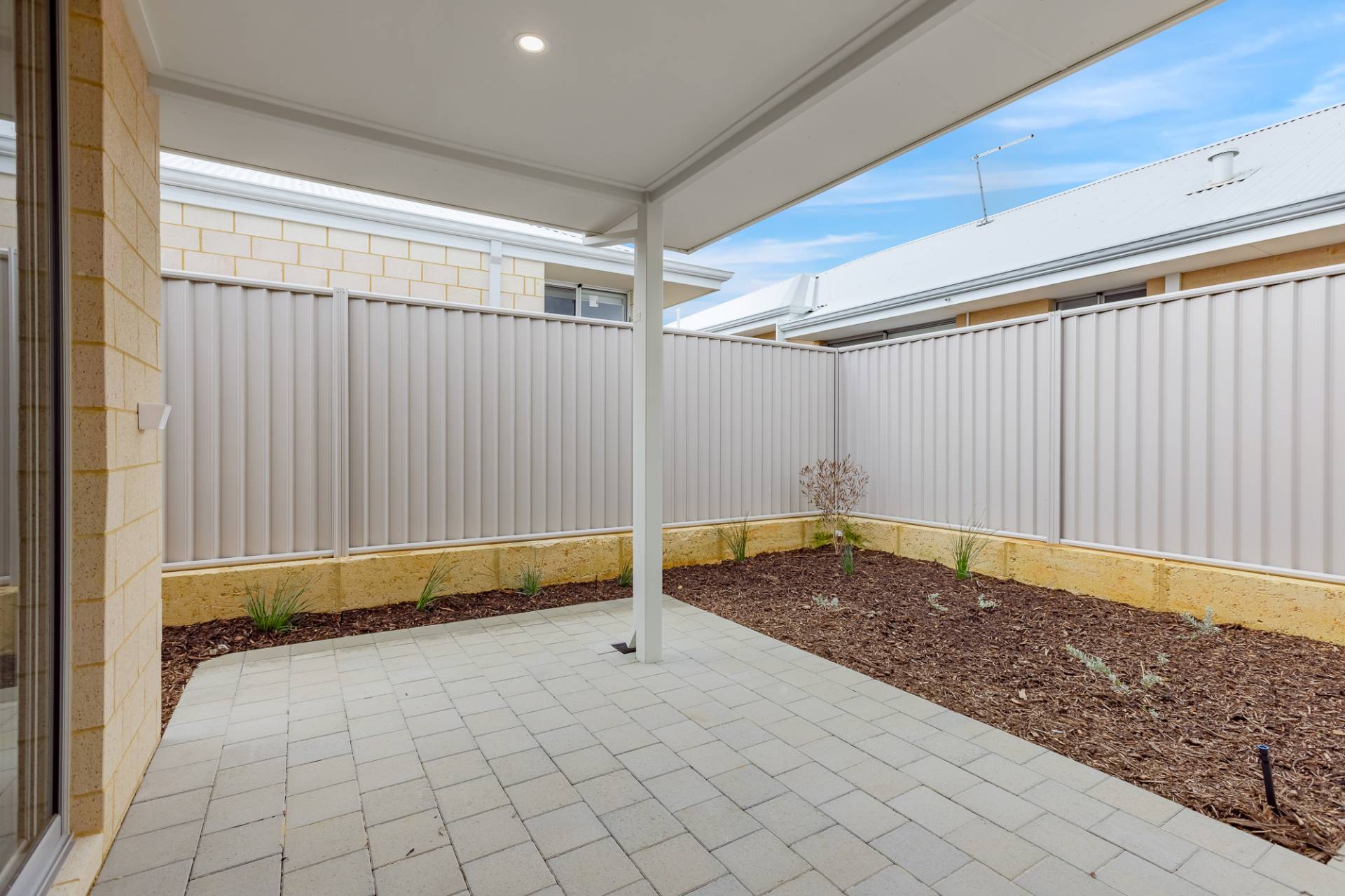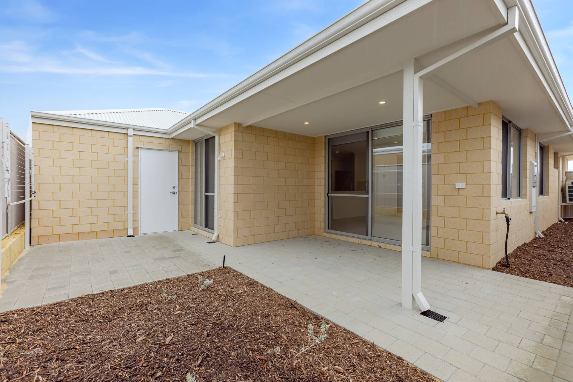 Paved alfresco area under the main roof for all-weather outdoor living