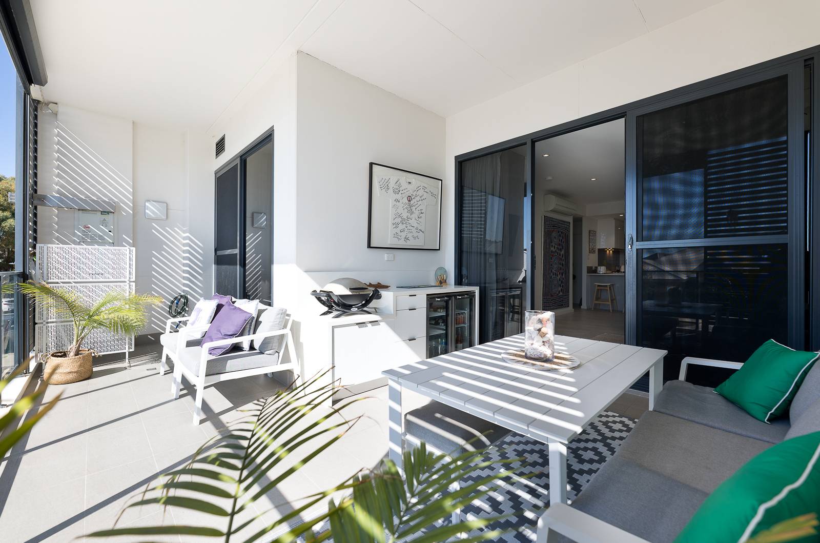 • Expansive private terrace with motorised café blinds, Caesarstone countertop, bar fridge nook, and space for a BBQ
