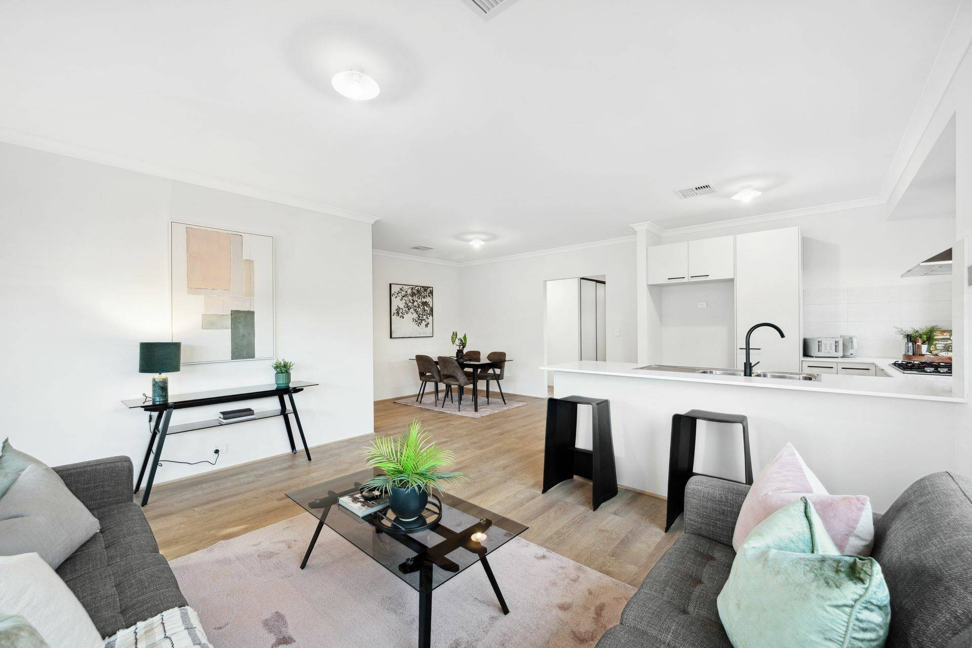 At the heart of the home, the open-plan living and dining area is filled with natural light, adjoining a modern kitchen with dual sinks, oven, and gas cooktop. Ducted air-conditioning throughout ensures year-round comfort, while carpeted bedrooms add a touch of warmth.