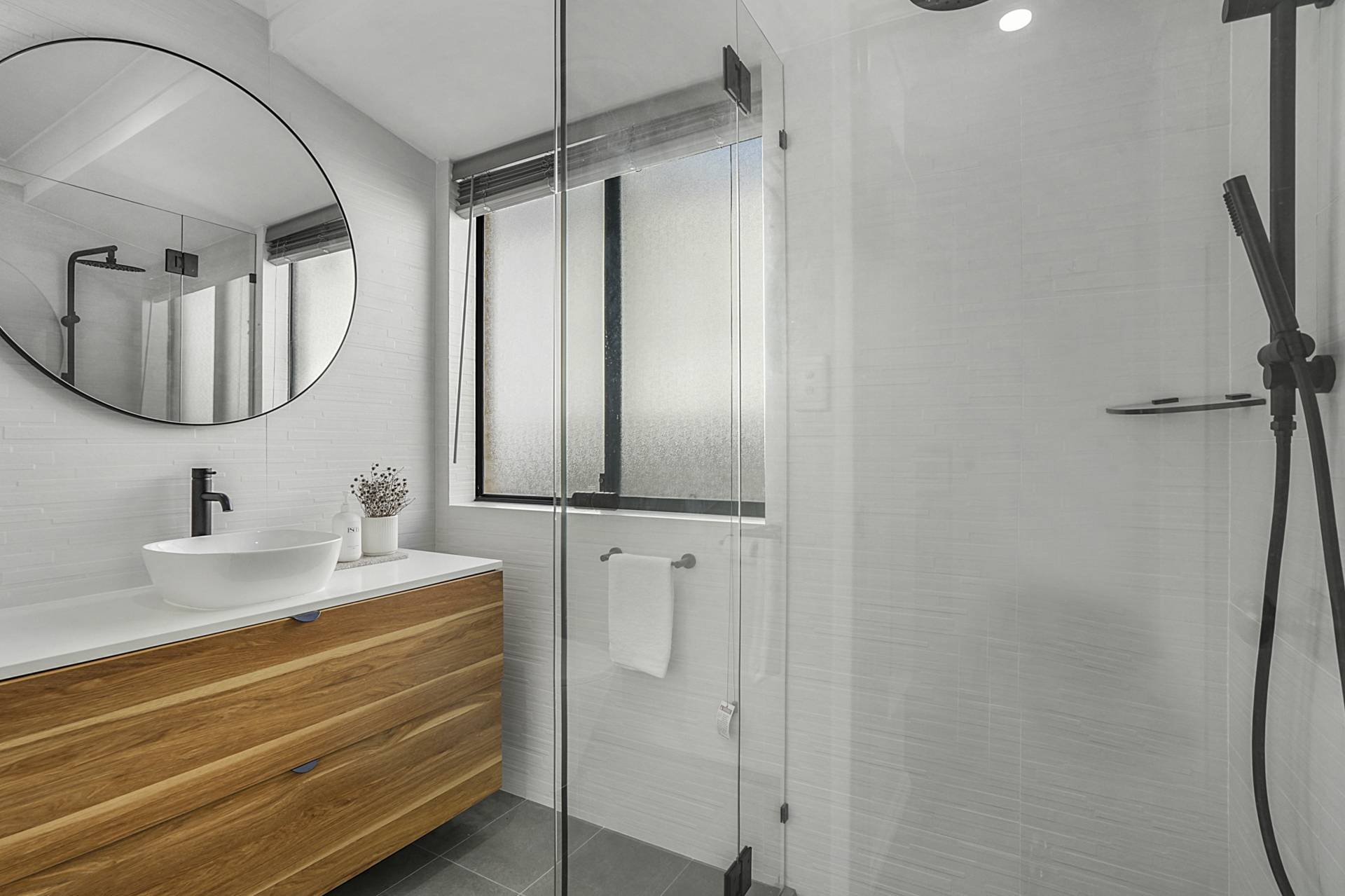 • Designer ensuite with floor-to-ceiling sculpted tiles, raised vanity with timber drawers & modern black tapware