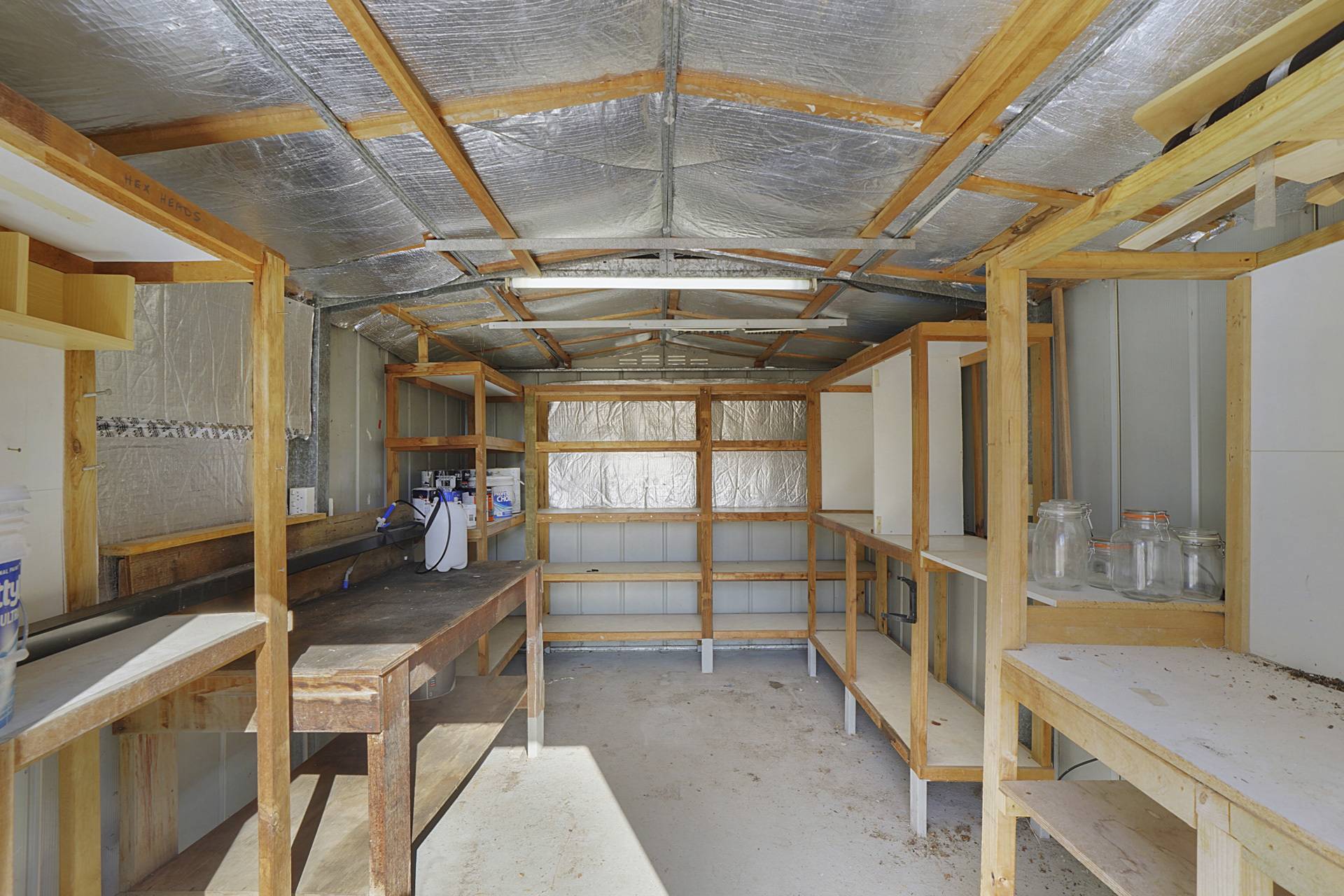 • Easy-care synthetic lawn and white-stone pathway to a powered shed with built-in racks & workbench