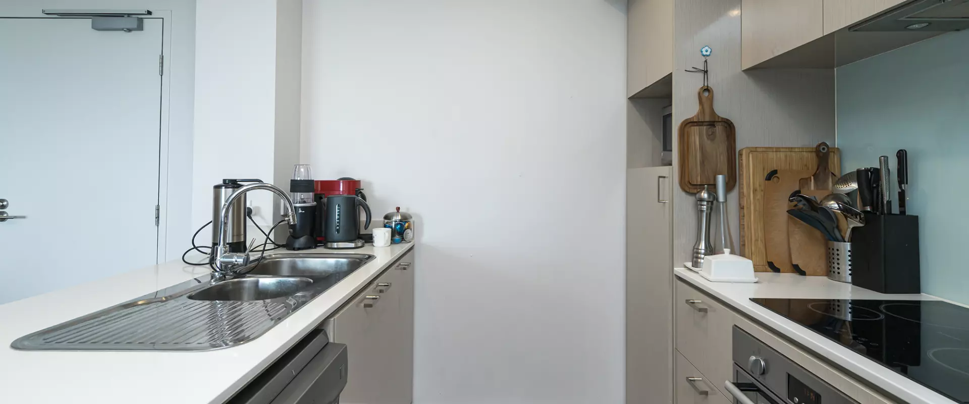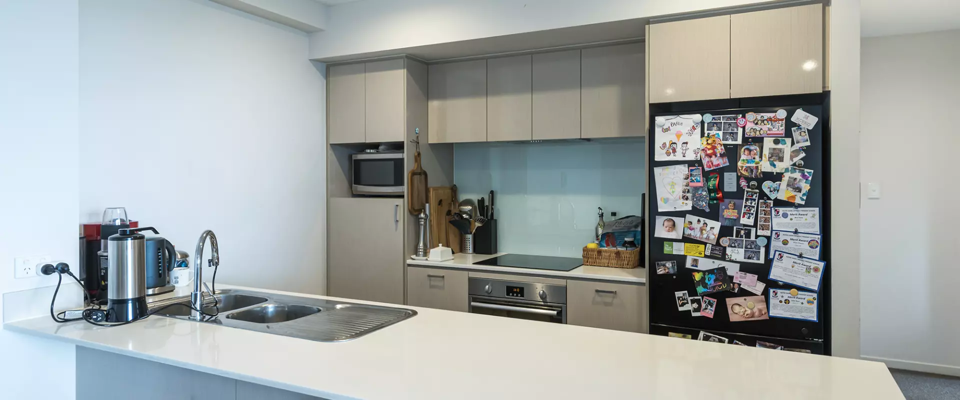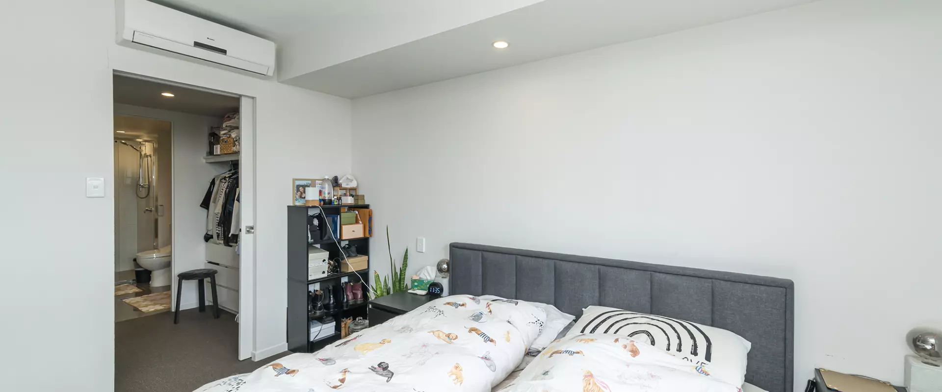 Reverse-cycle air conditioning in the living area and both bedrooms ensures a comfortable environment all year round. In the kitchen, find stainless steel appliances, including a fridge, induction cooktop and under-bench oven, sleek glass splashbacks, and ample storage.