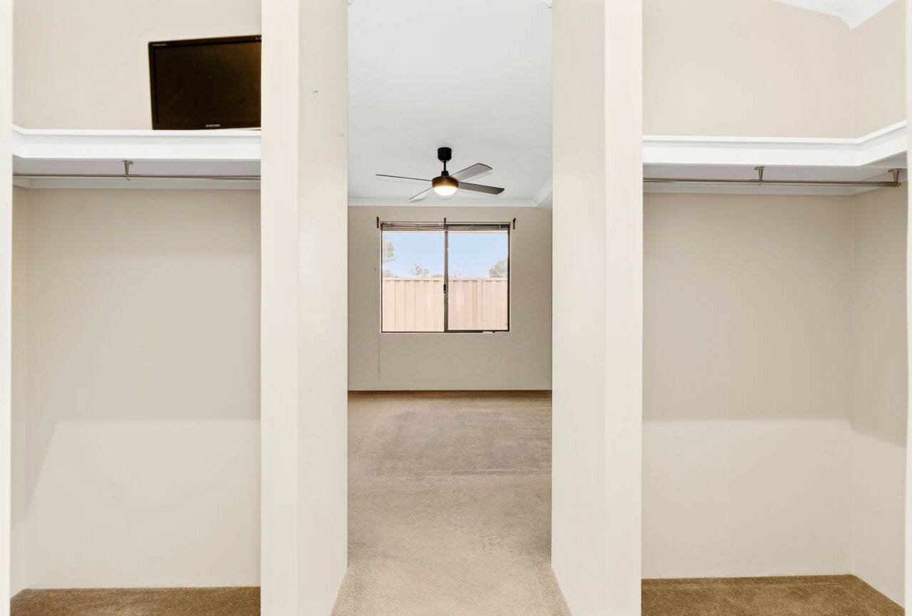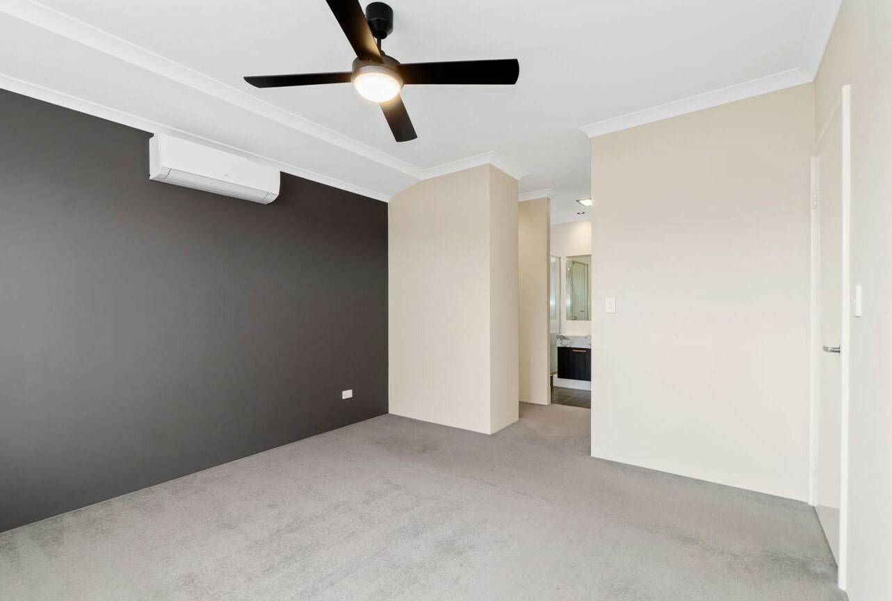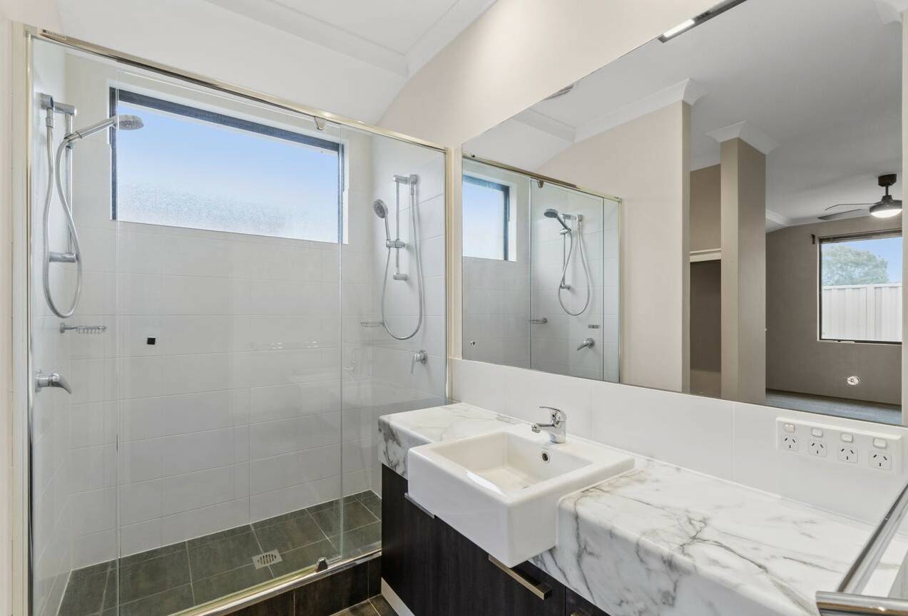 The master suite offers a true retreat, featuring his and hers wardrobes, ceiling fan, a spacious ensuite with dual shower heads, and its own split system air-conditioning.