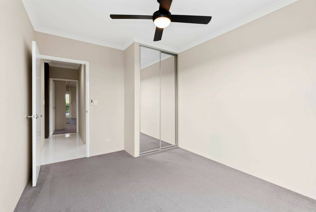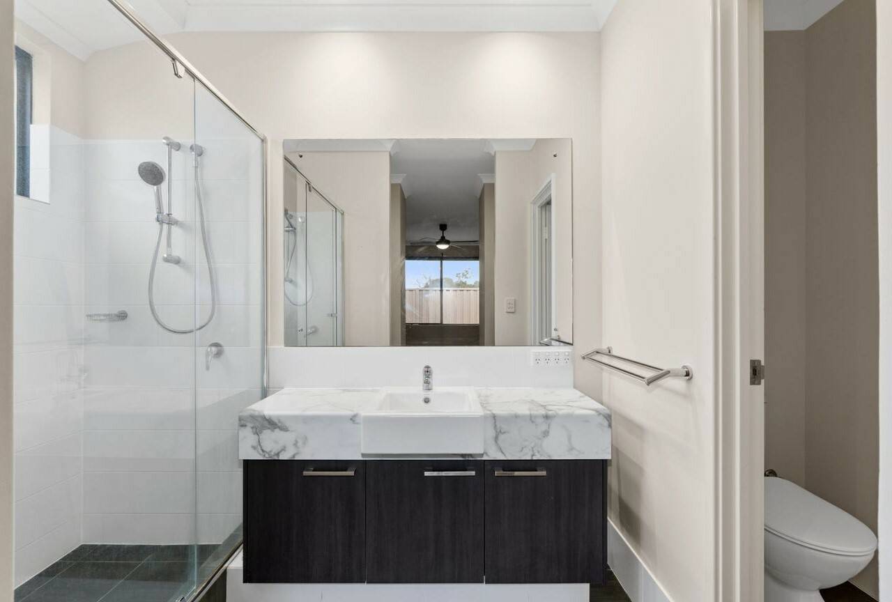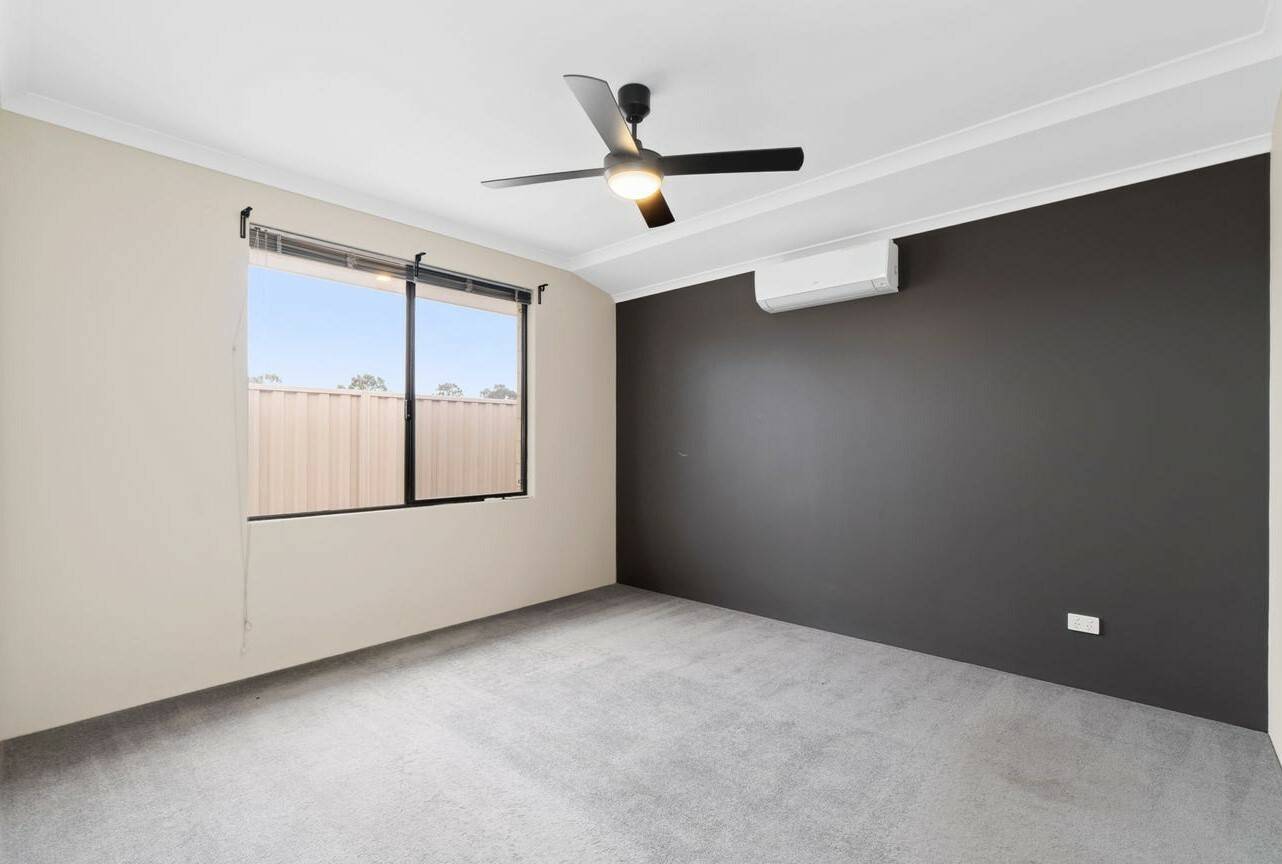 The master suite offers a true retreat, featuring his and hers wardrobes, ceiling fan, a spacious ensuite with dual shower heads, and its own split system air-conditioning.