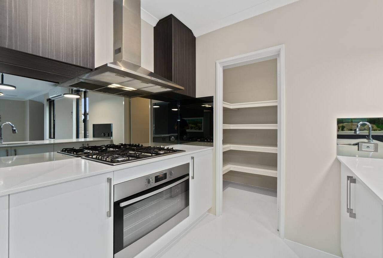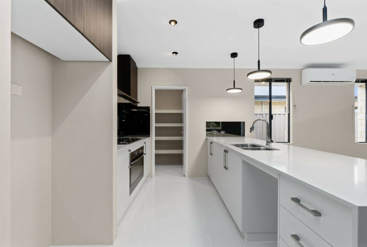 The kitchen is well appointed with a walk-in pantry, generous breakfast bar, 900mm oven, and gas cooktop, while the adjoining living area is enhanced by split system air-conditioning and ceiling fans to keep the space comfortable year-round.