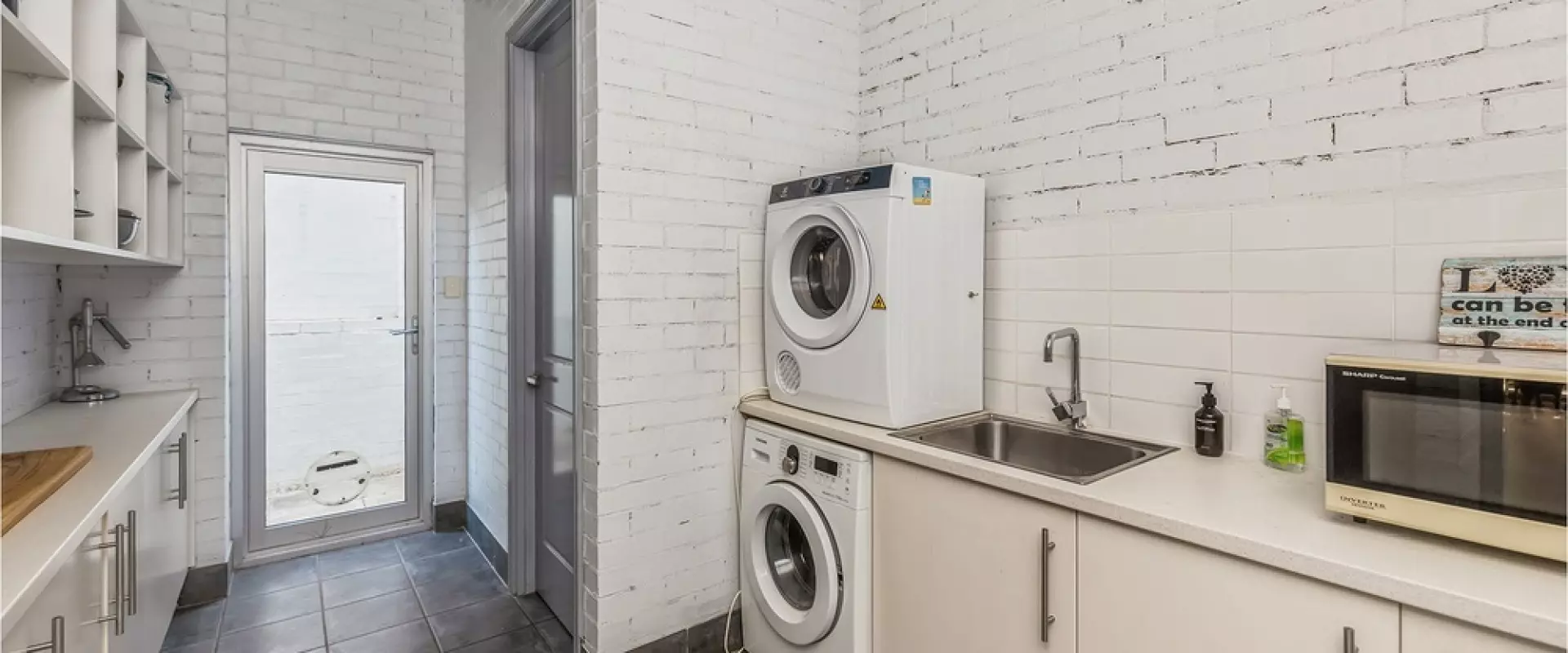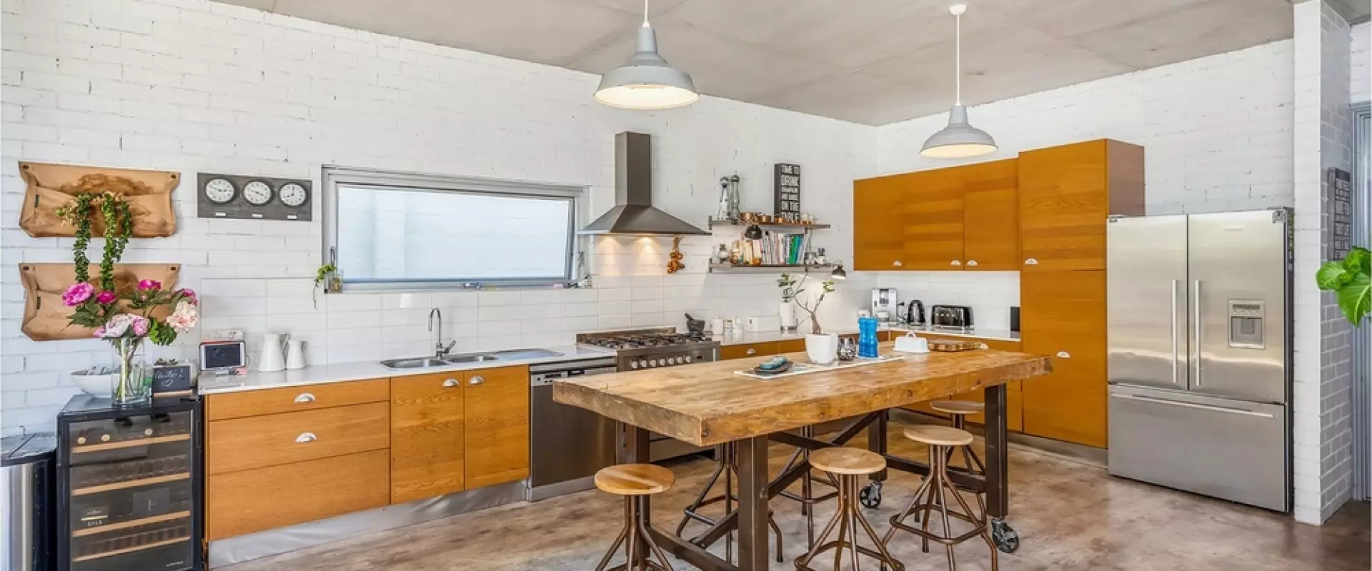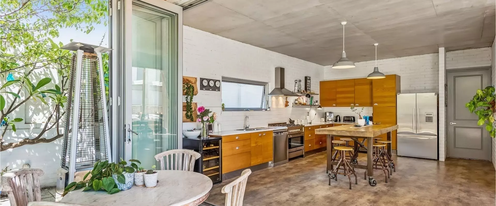 • Massive kitchen with exposed concrete ceilings, stainless steel appliances & large island bench