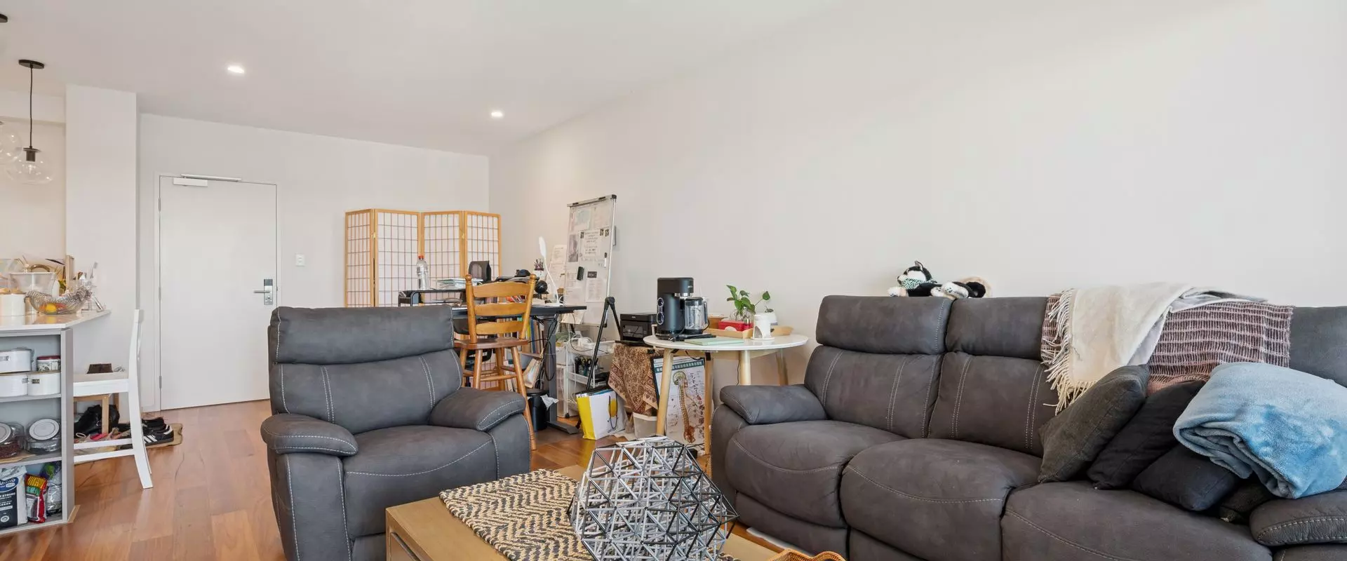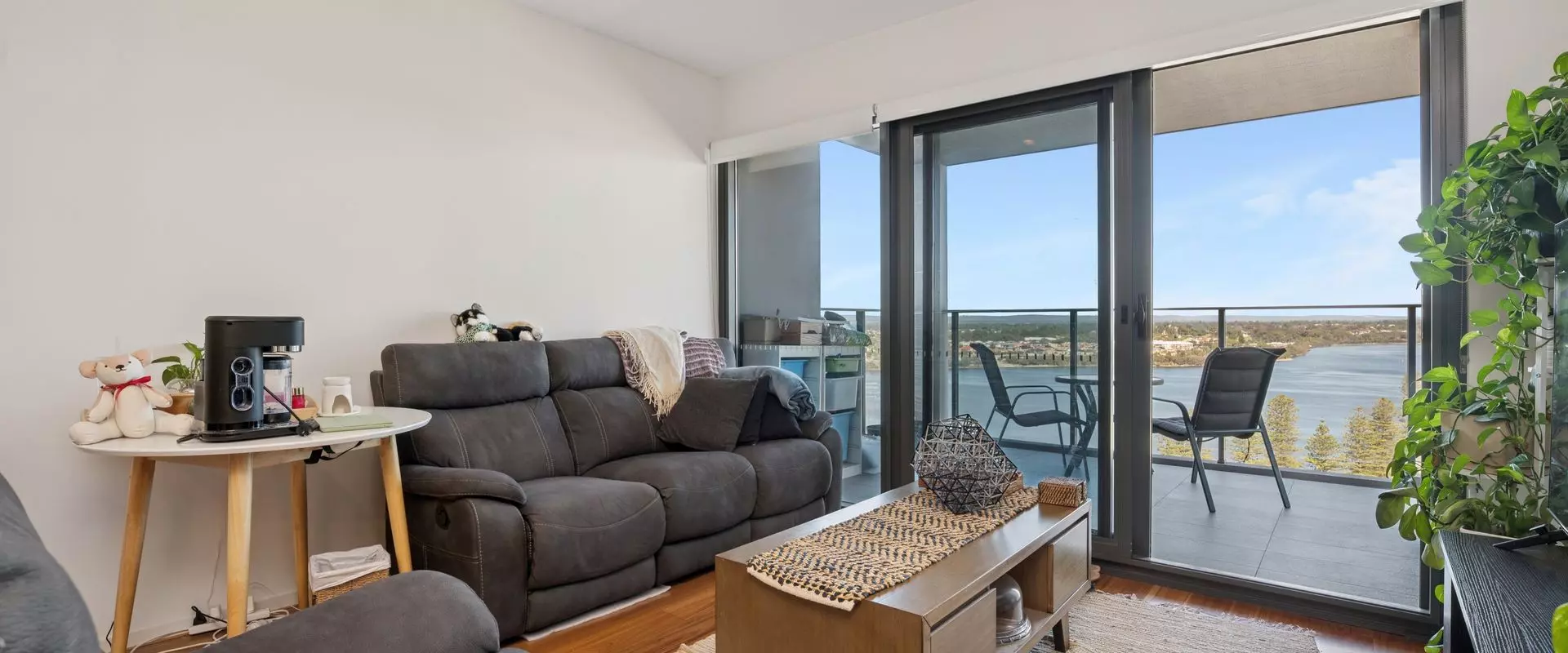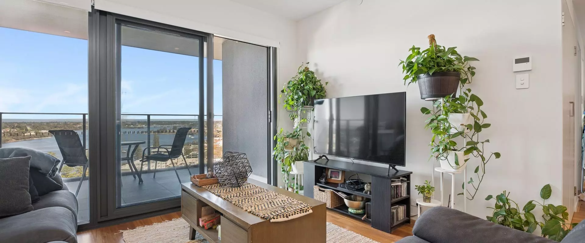 Open-plan living and dining opening to a private balcony with sweeping river views