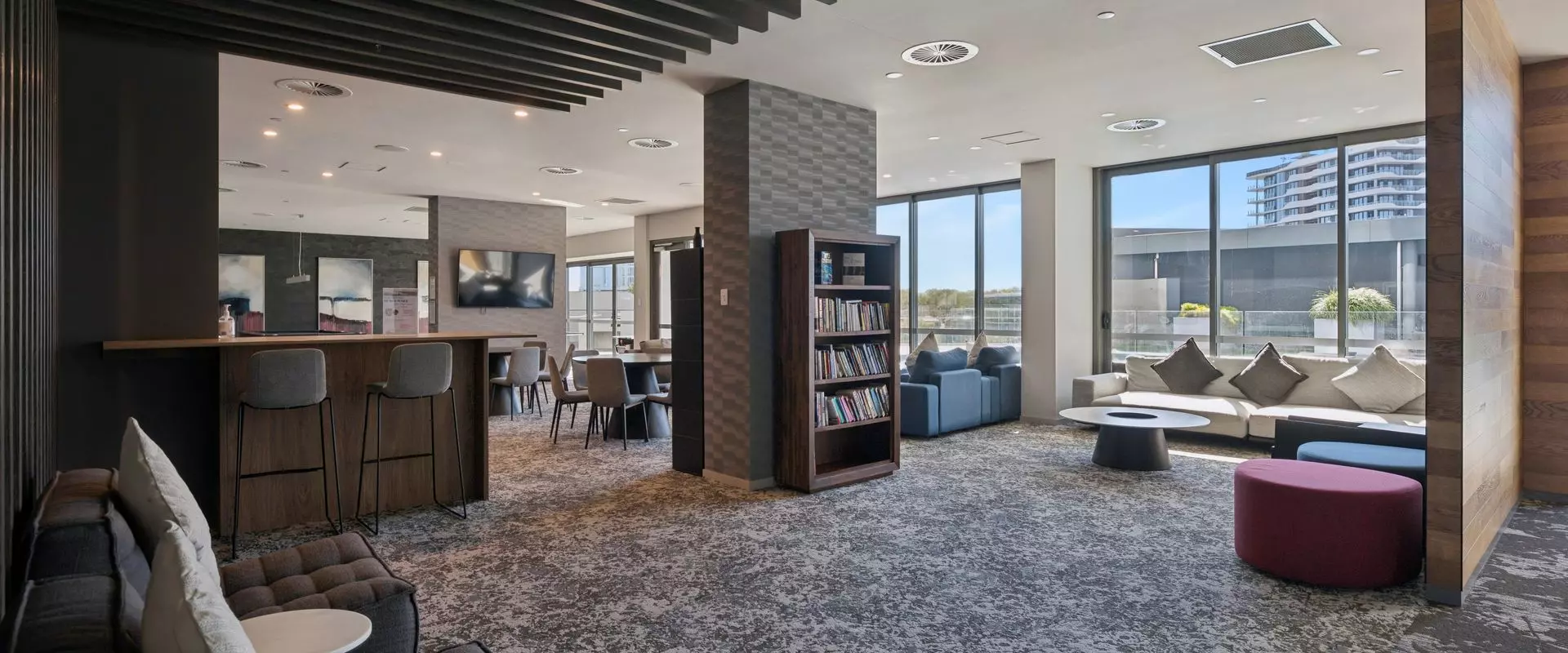 Business lounge, guest apartment, car share service, and electric car charging