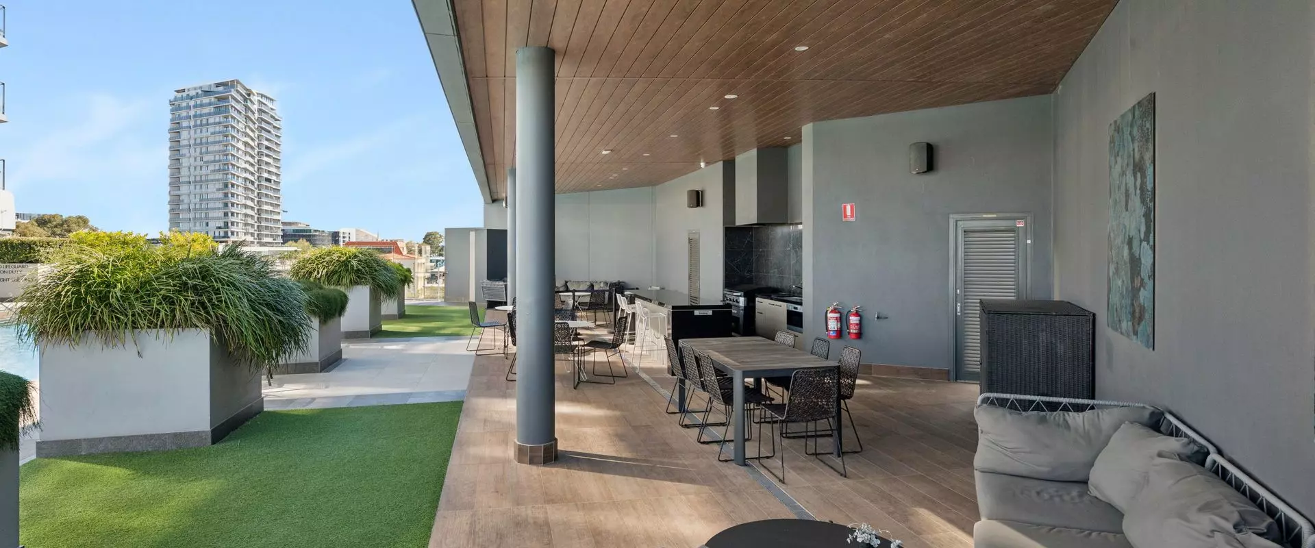 Landscaped 5th-floor deck and grand lobby entrance for a touch of luxury
