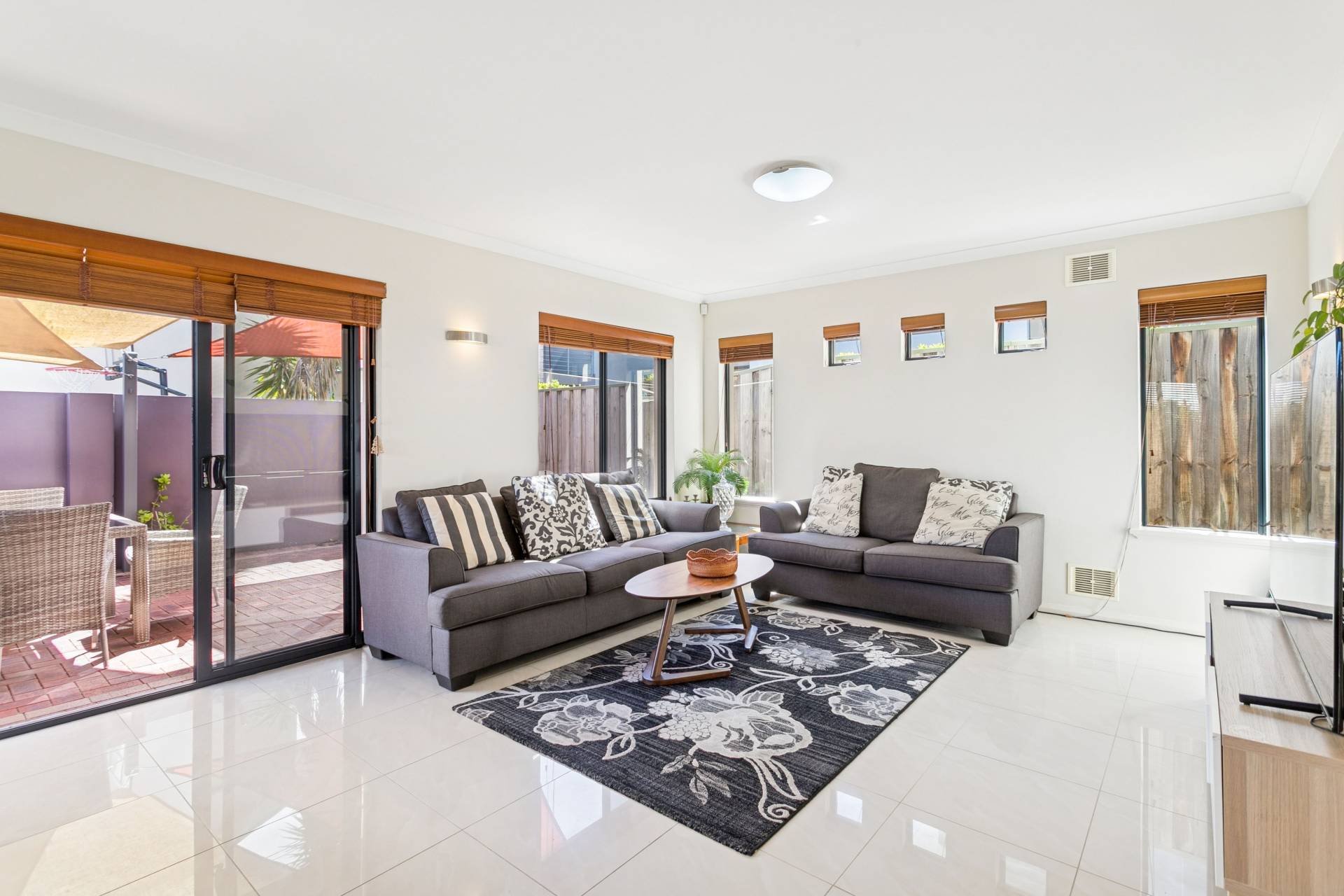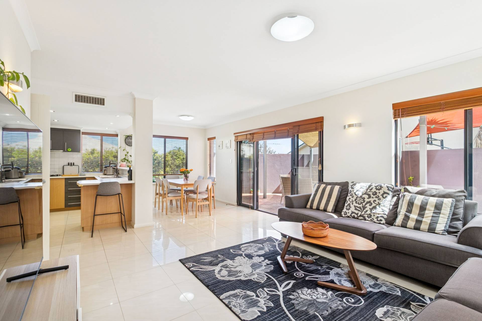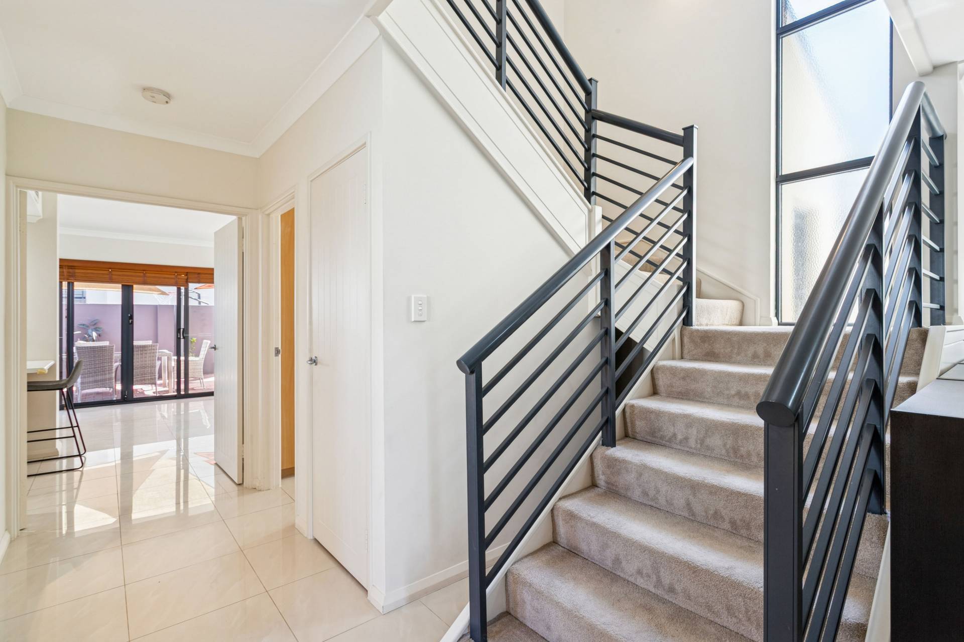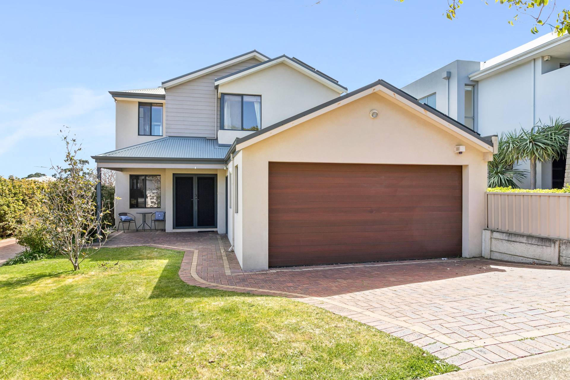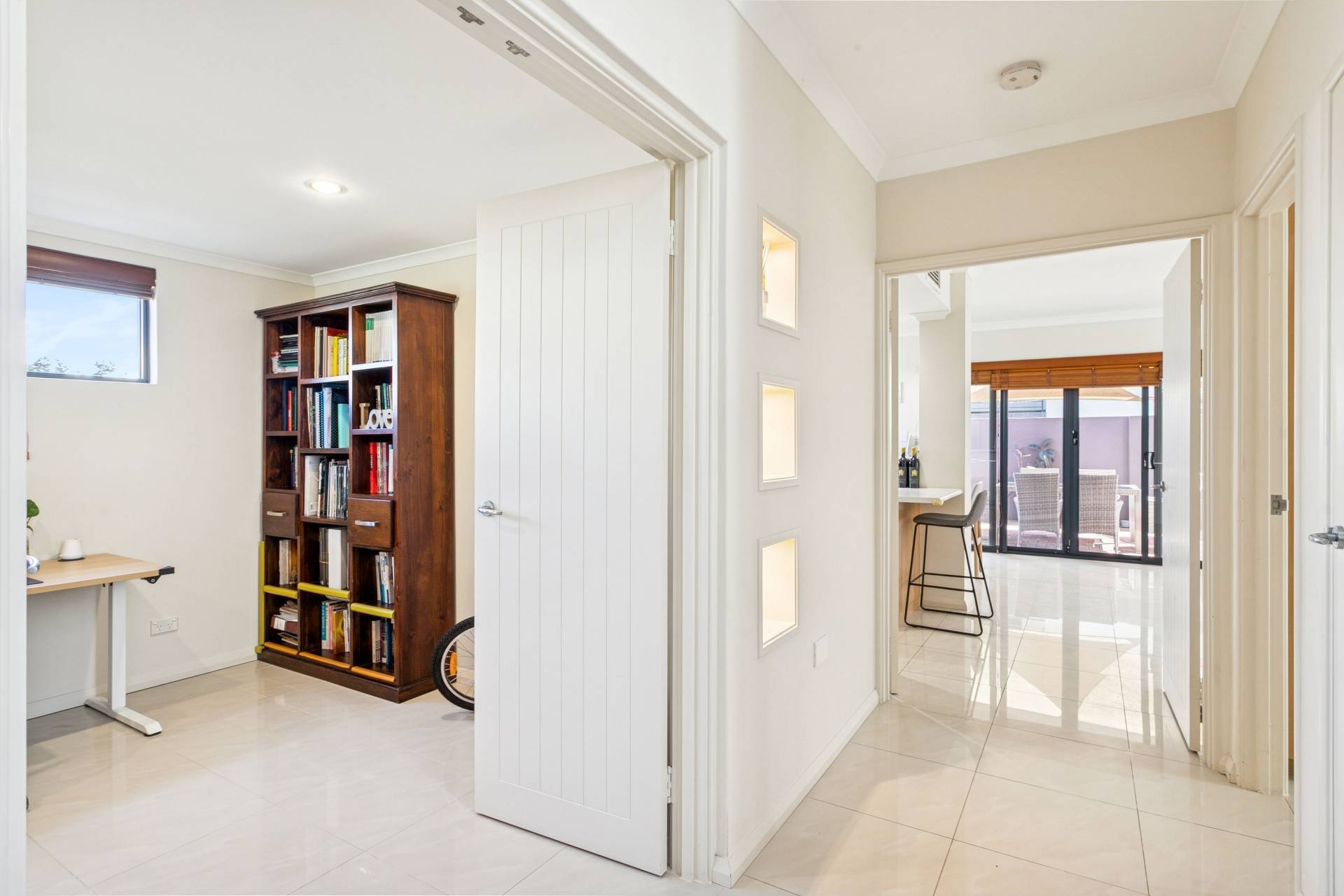 Upstairs, high ceilings and a wide hallway enhance the sense of space. Three well-appointed bedrooms include a stunning master suite with cathedral ceilings, walk-in robe, and spa-ensuite. A generous media room/4th bedroom connects seamlessly to the west-facing balcony, the perfect spot to soak up sunsets over Rottnest. Two additional bedrooms with built-in robes share a stylish bathroom with full-height tiling and bath.