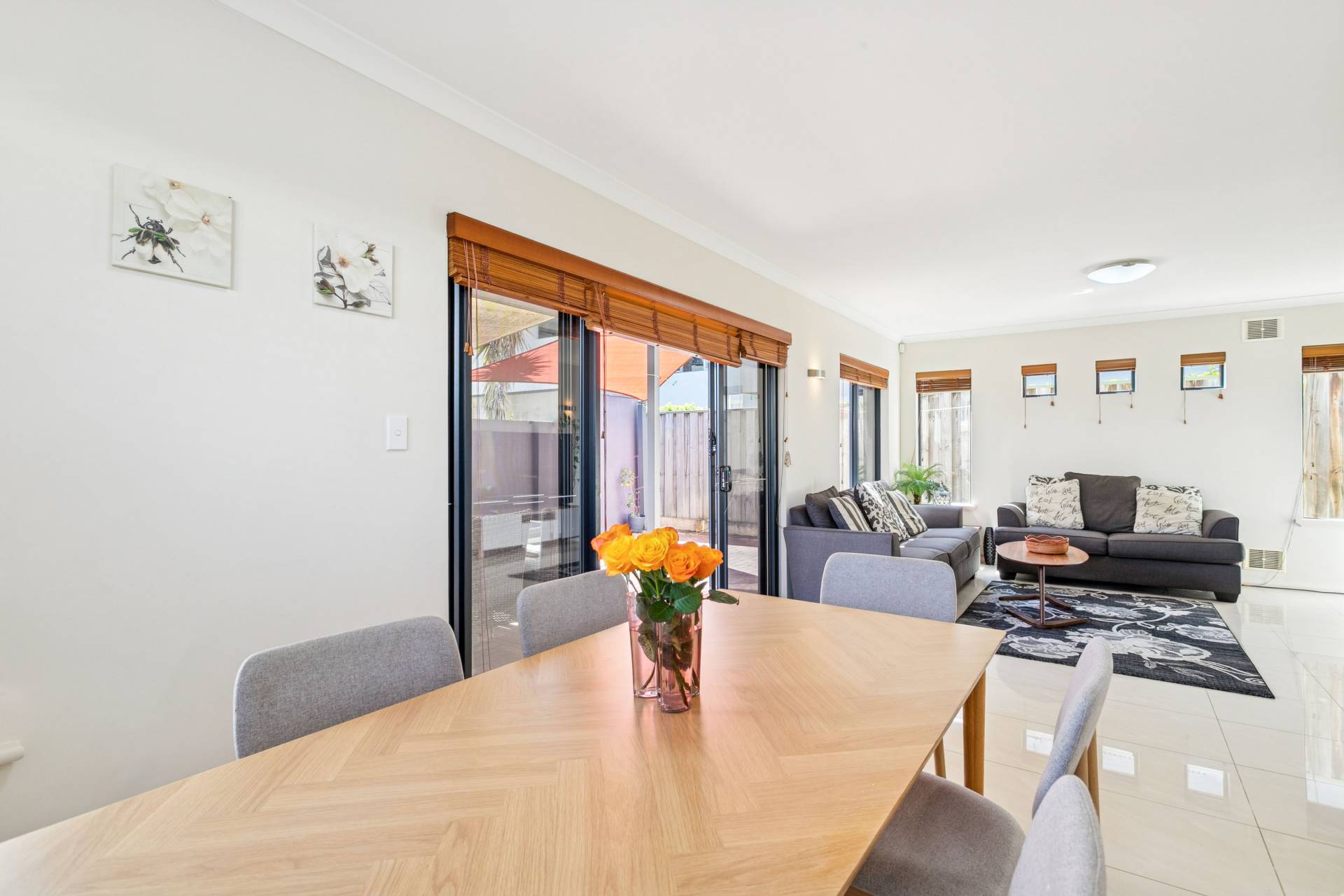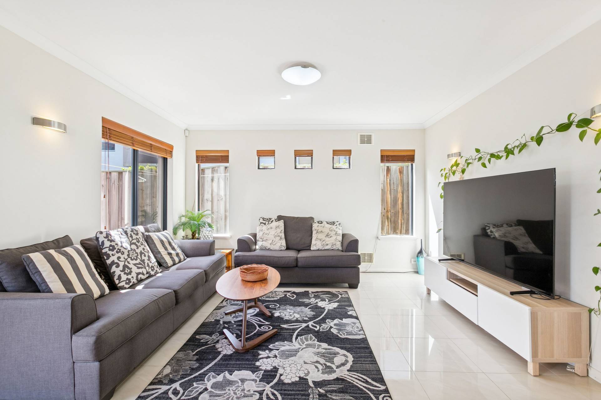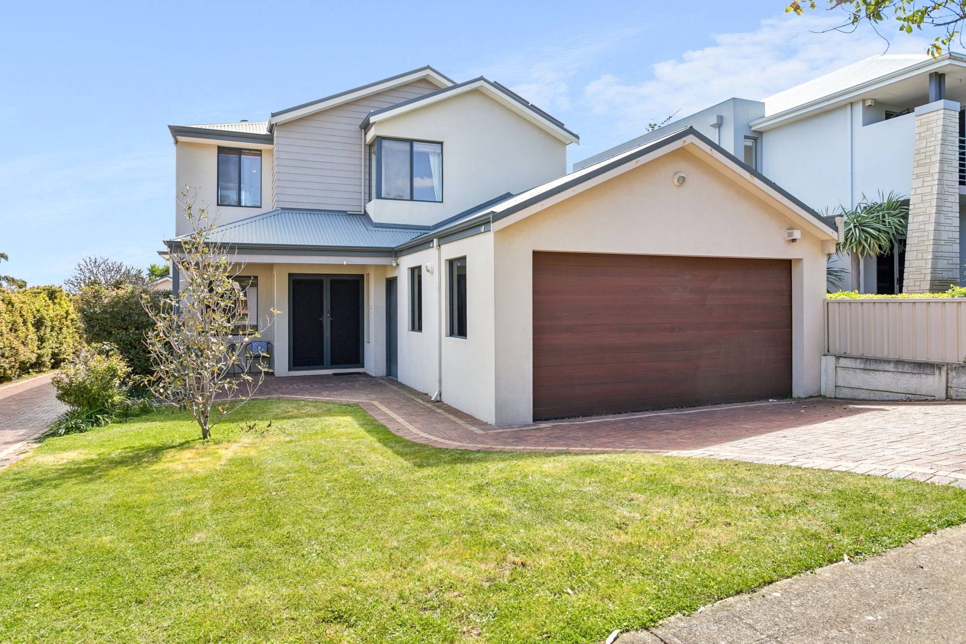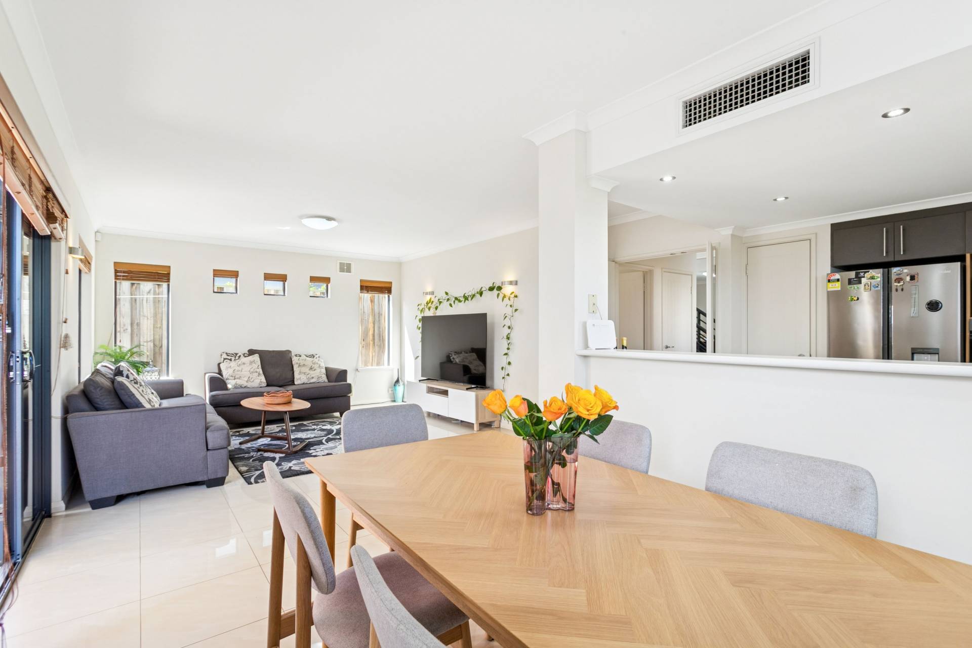 Upstairs, high ceilings and a wide hallway enhance the sense of space. Three well-appointed bedrooms include a stunning master suite with cathedral ceilings, walk-in robe, and spa-ensuite. A generous media room/4th bedroom connects seamlessly to the west-facing balcony, the perfect spot to soak up sunsets over Rottnest. Two additional bedrooms with built-in robes share a stylish bathroom with full-height tiling and bath.