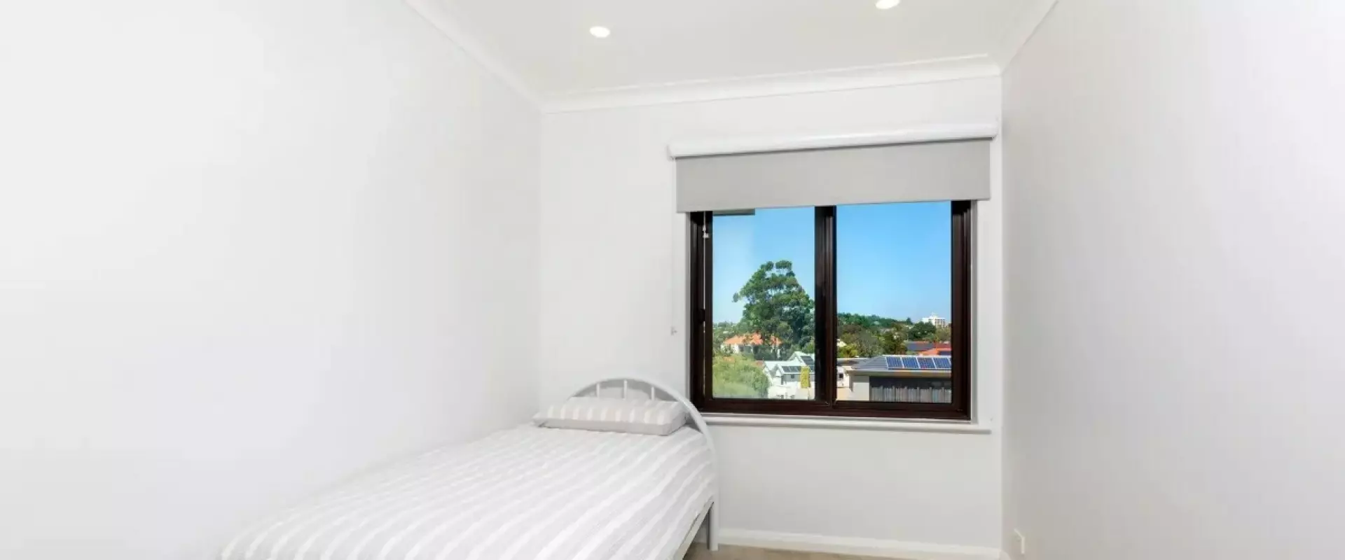 • Electric remote-control roller blinds in the living area Faux wood Venetian blinds and block-out roller blinds in the bedroom