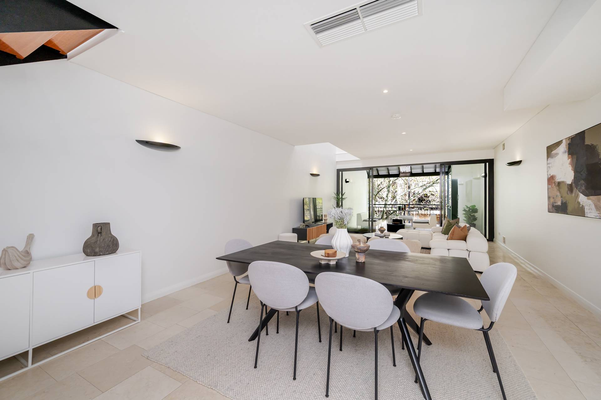 The ground floor opens to a spacious open-plan living and dining area, seamlessly connecting to a well-appointed kitchen featuring stone benchtops, generous storage and preparation space, and a suite of Bosch appliances. High ceilings and generous windows allow natural light to flood in, while the leafy street outlook and a good-sized balcony extend the living space outdoors. Perfect for entertaining, the balcony offers a relaxed setting for weekend gatherings, long summer evenings or simply enjoying a morning coffee in the fresh air. Comfort is further enhanced with reverse-cycle air conditioning, ensuring year-round climate control.