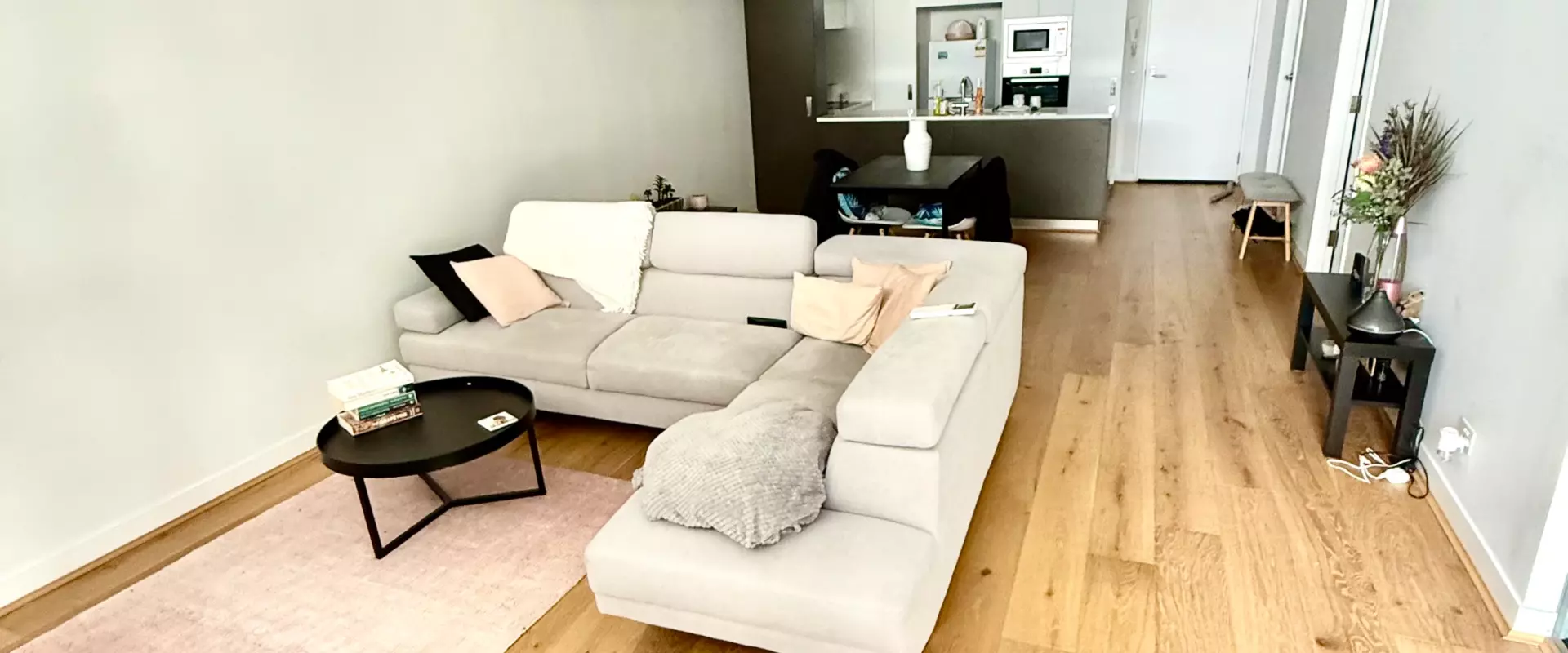 The open-plan living and dining area is filled with natural light, flowing effortlessly onto a private balcony – perfect for entertaining or simply unwinding. The well-appointed kitchen is finished with stone benchtops, Bosch appliances, and soft-close cabinetry, ideal for everyday cooking or hosting guests.