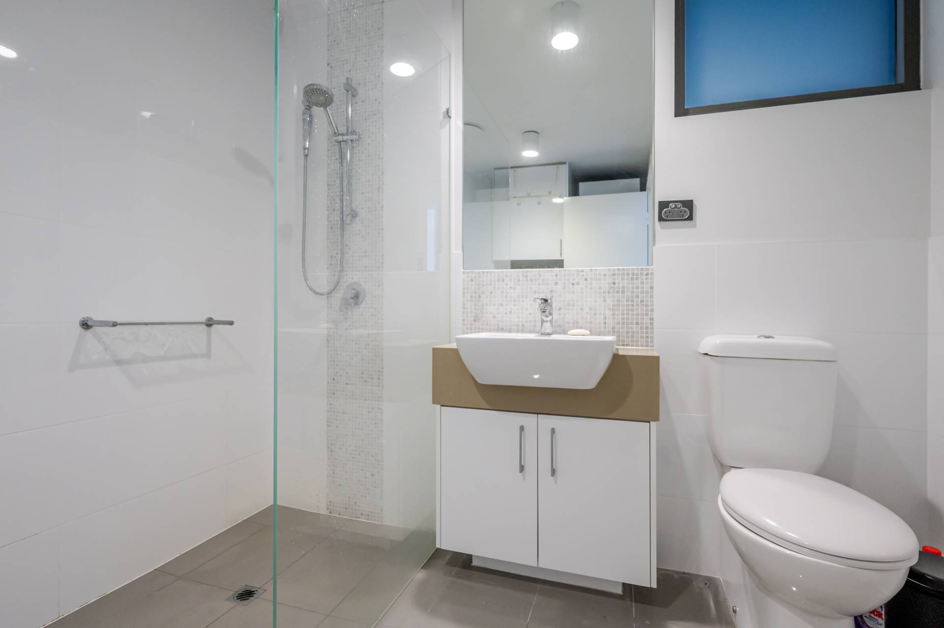 -One modern bathroom with walk-in glass shower, floor-to-ceiling tiles