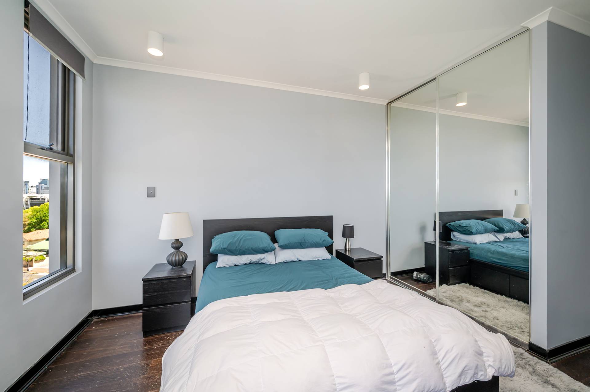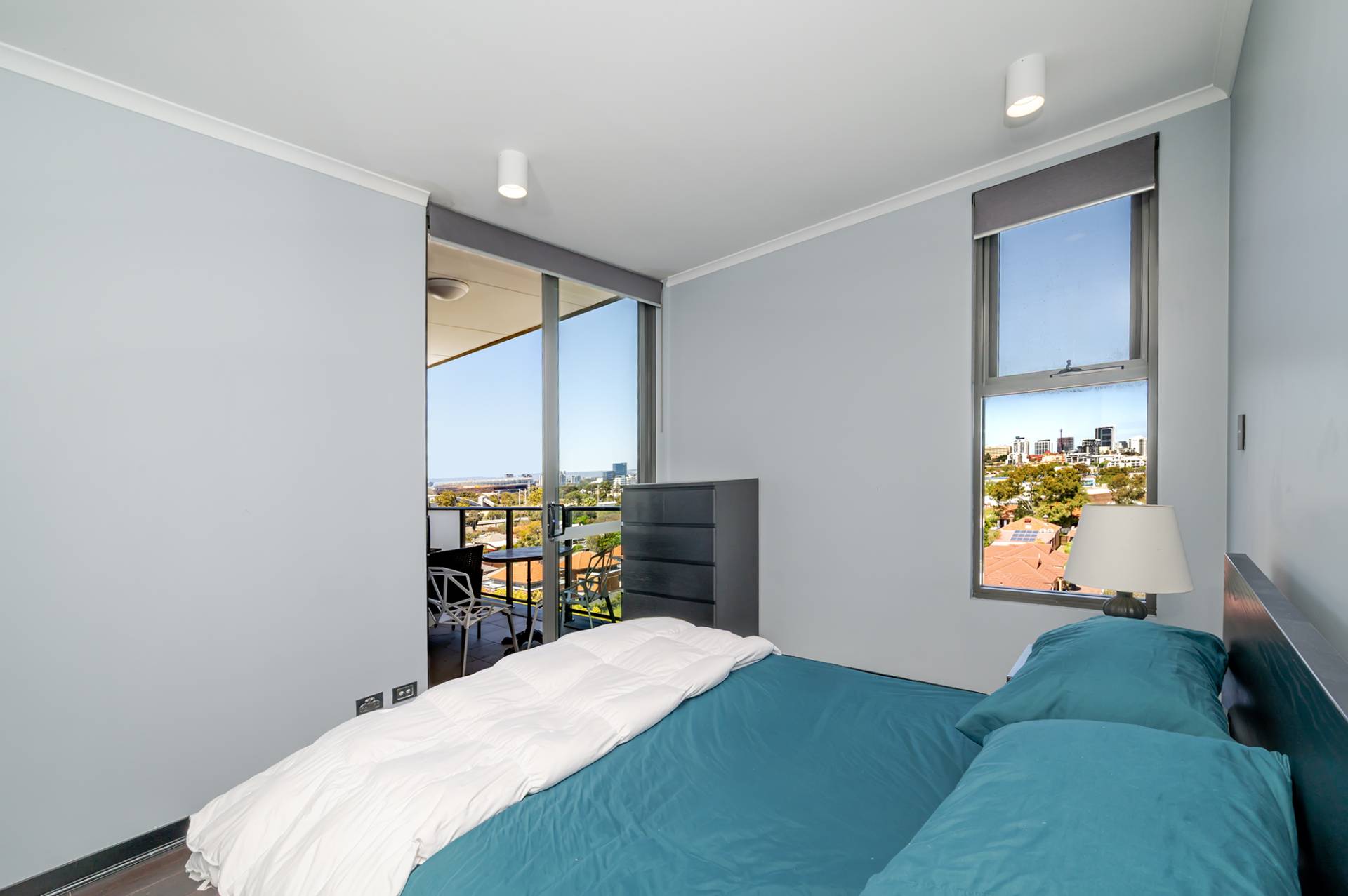 -One bright bedroom with mirrored sliding robes, door access to balcony with views