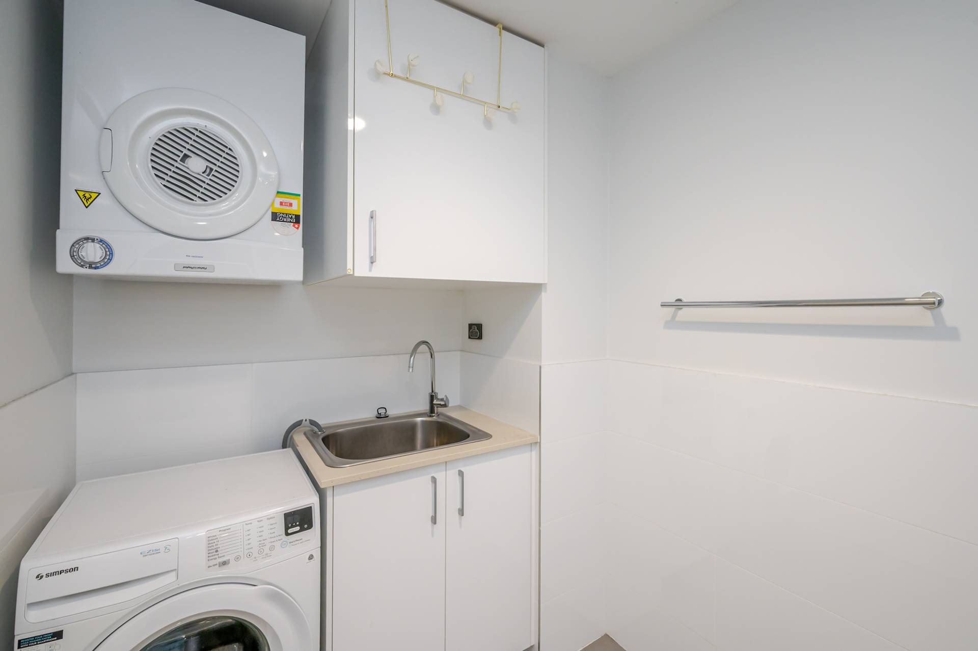 -Compact laundry with washing machine, mounted dryer, overhead cupboards