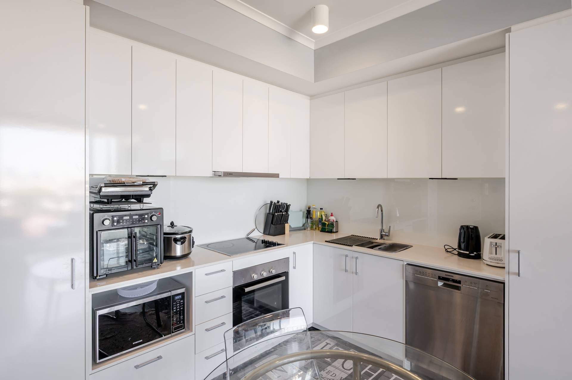 -Deluxe kitchen with ample bench space and stone benchtops, doble sink, overhead cupboards, bench space, glass splashbacks, and contemporary appliances