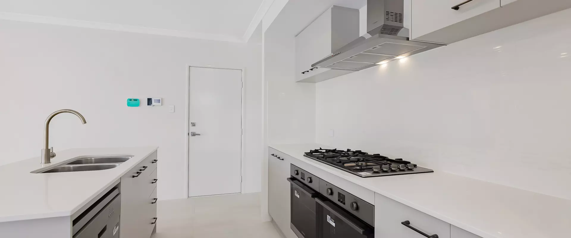 Modern kitchen with large gas cooktop, dual ovens, stone benchtops, sit-up breakfast bar and dishwasher