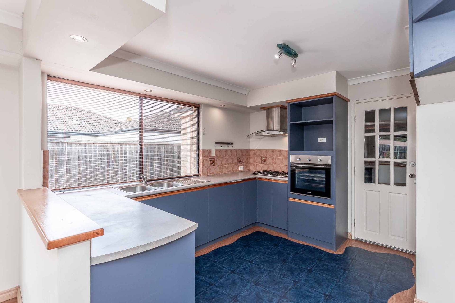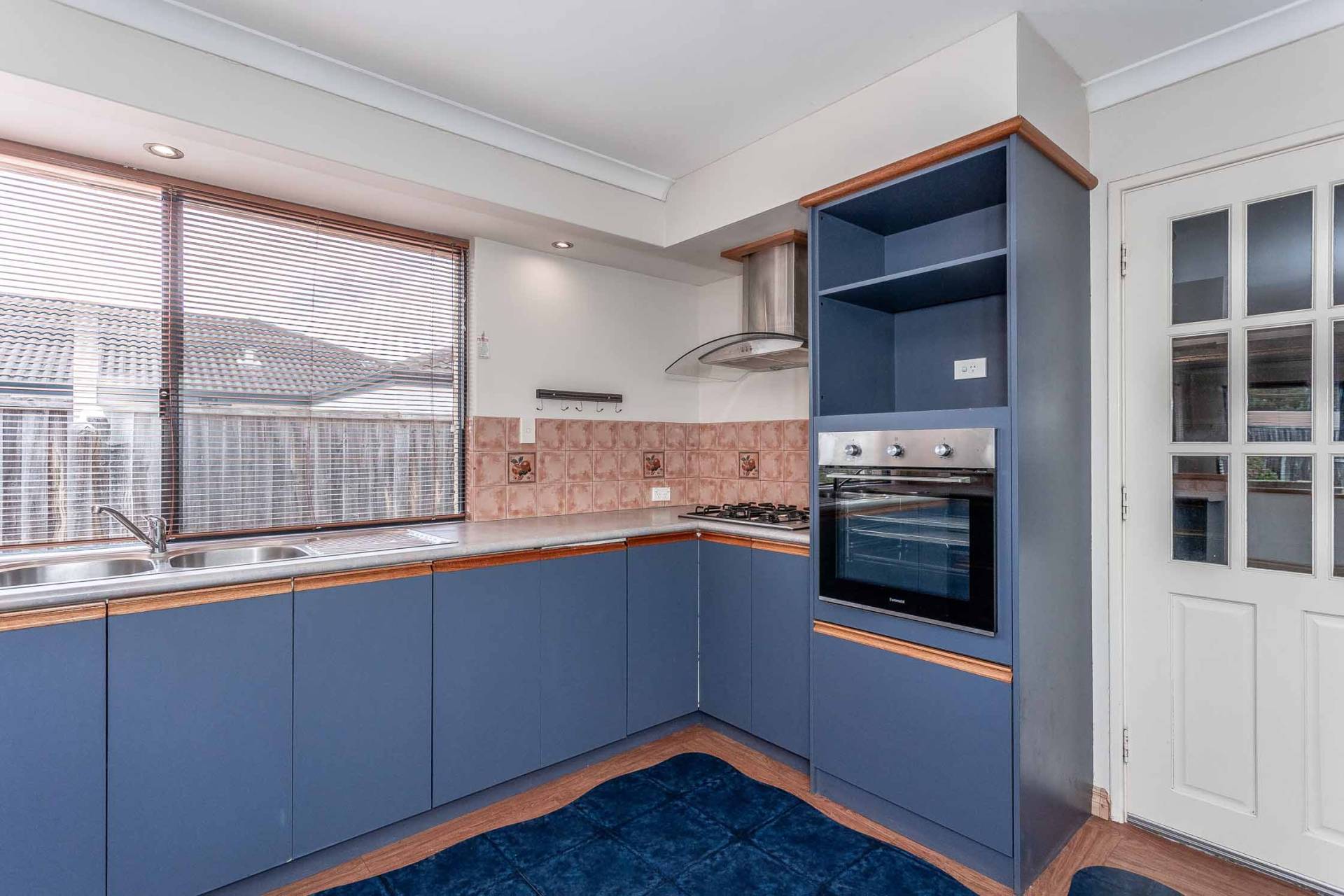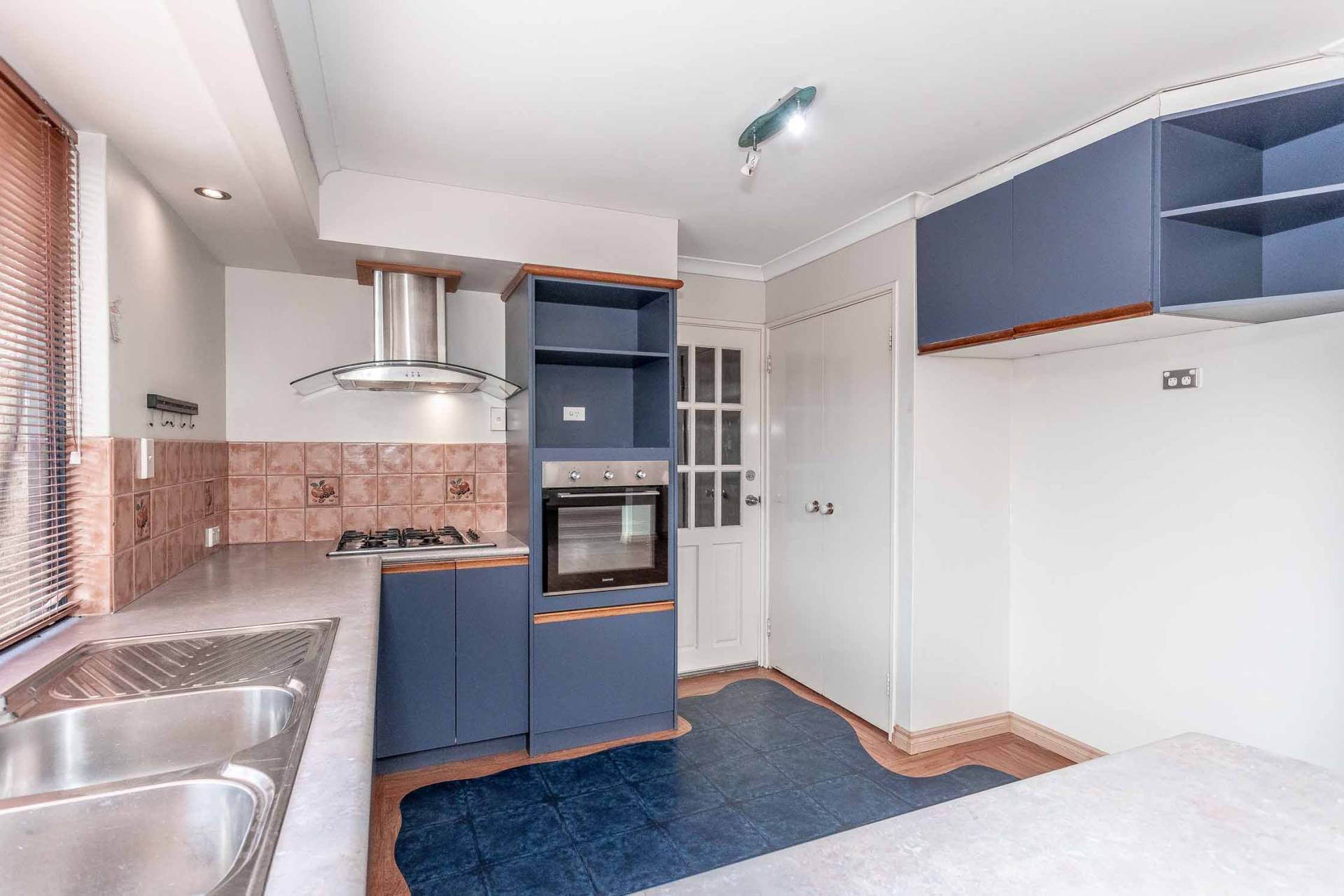 - Kitchen with gas cooktop, rangehood, double sink and dishwasher