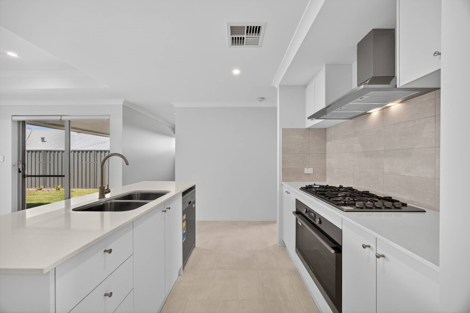 At the heart of the home, the kitchen combines style and function equipped with a large gas cooktop, oven, dishwasher, and plenty of storage. With overhead cupboards, and expansive bench space with a double sink, meal preparation and entertaining are made effortless.