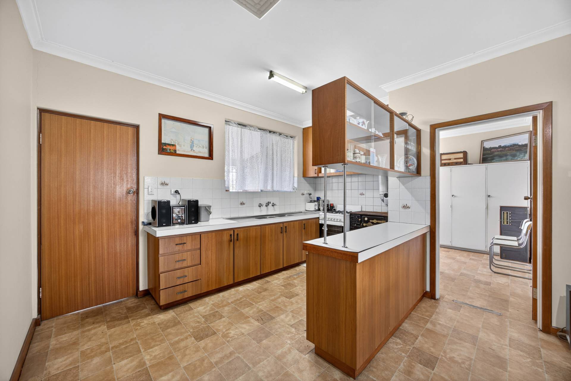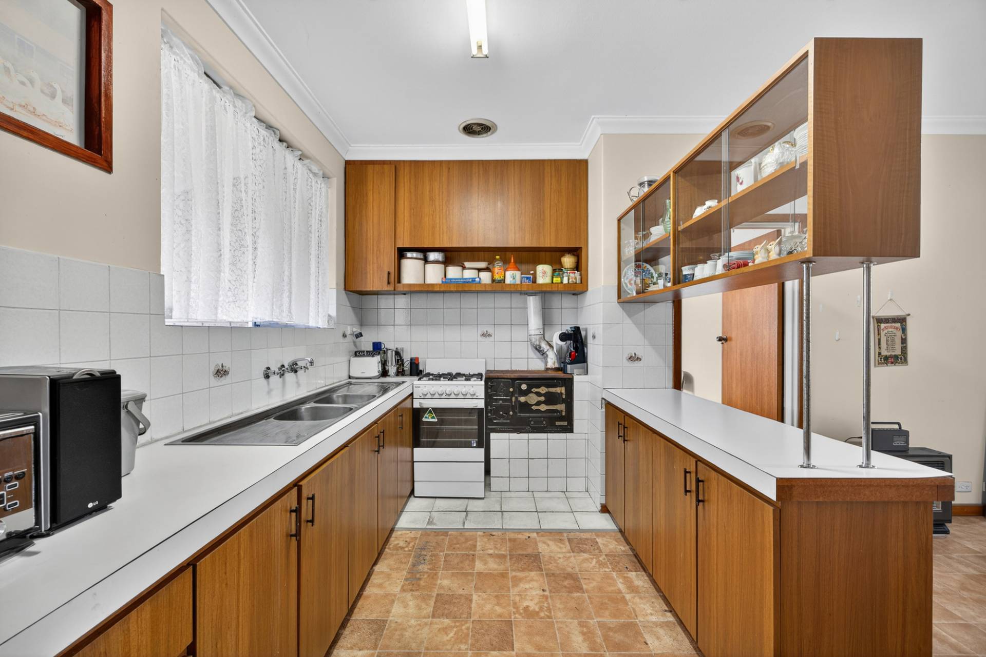 The kitchen is well equipped with dual sinks, a free standing oven and stove, plenty of bench space and overhead cupboards to keep everything neatly tucked away.