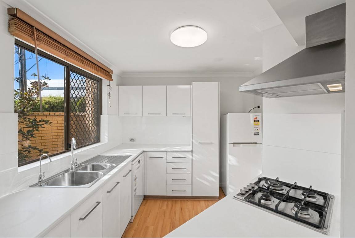 The modern kitchen features white cabinetry, stone-look benchtops, a stainless-steel gas cooktop with rangehood, built-in oven, dishwasher and sleek finishes.