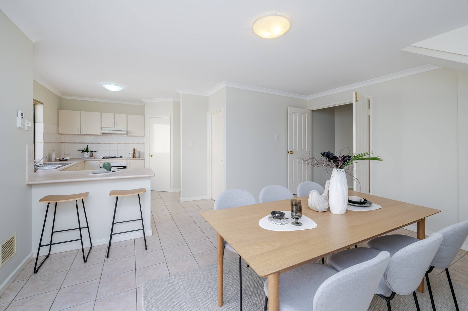 The kitchen forms the hub of the home, featuring ample bench space, stainless steel appliances, and a gas cooktop. It connects smoothly to the main living and dining zone, allowing for easy entertaining and family interaction.