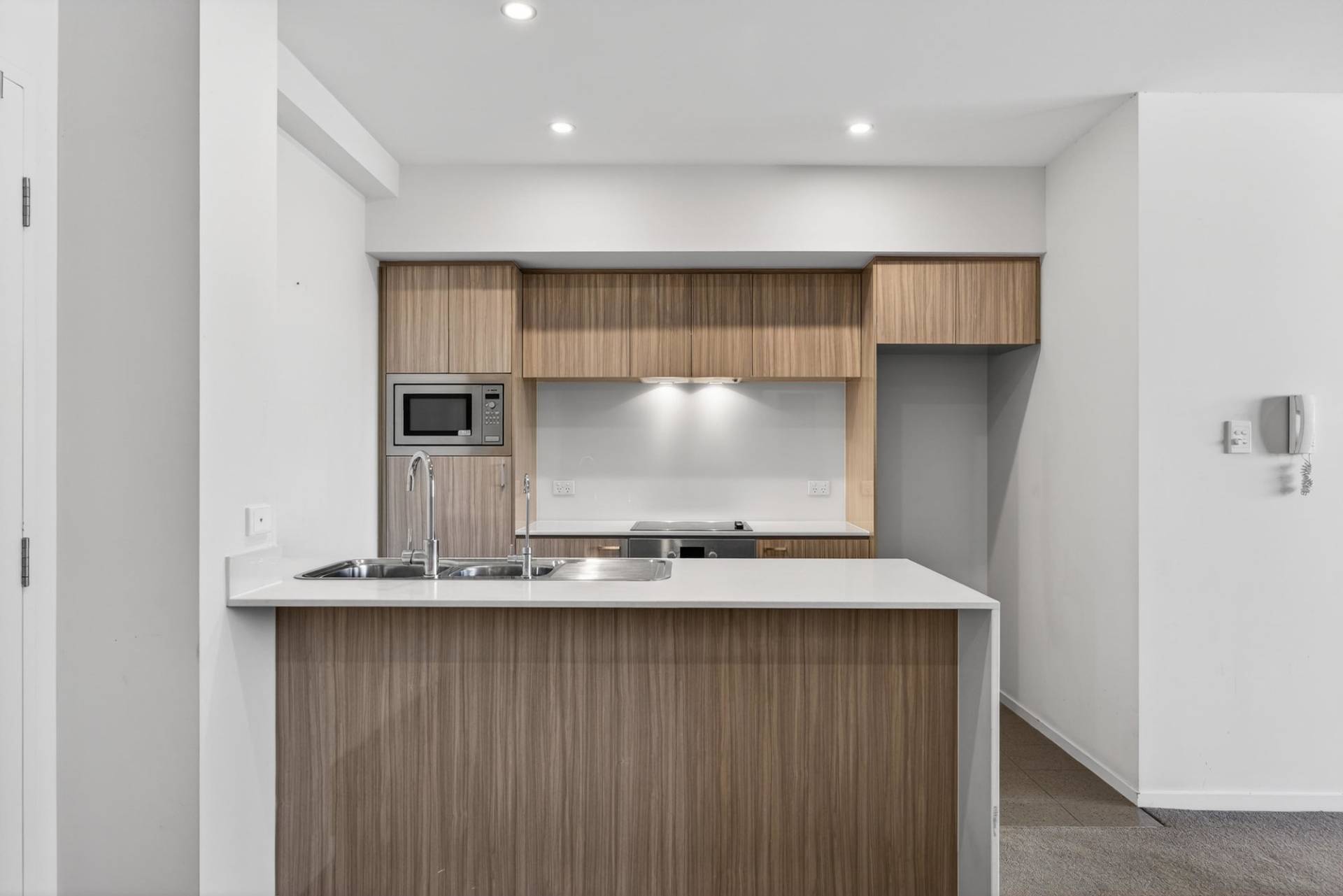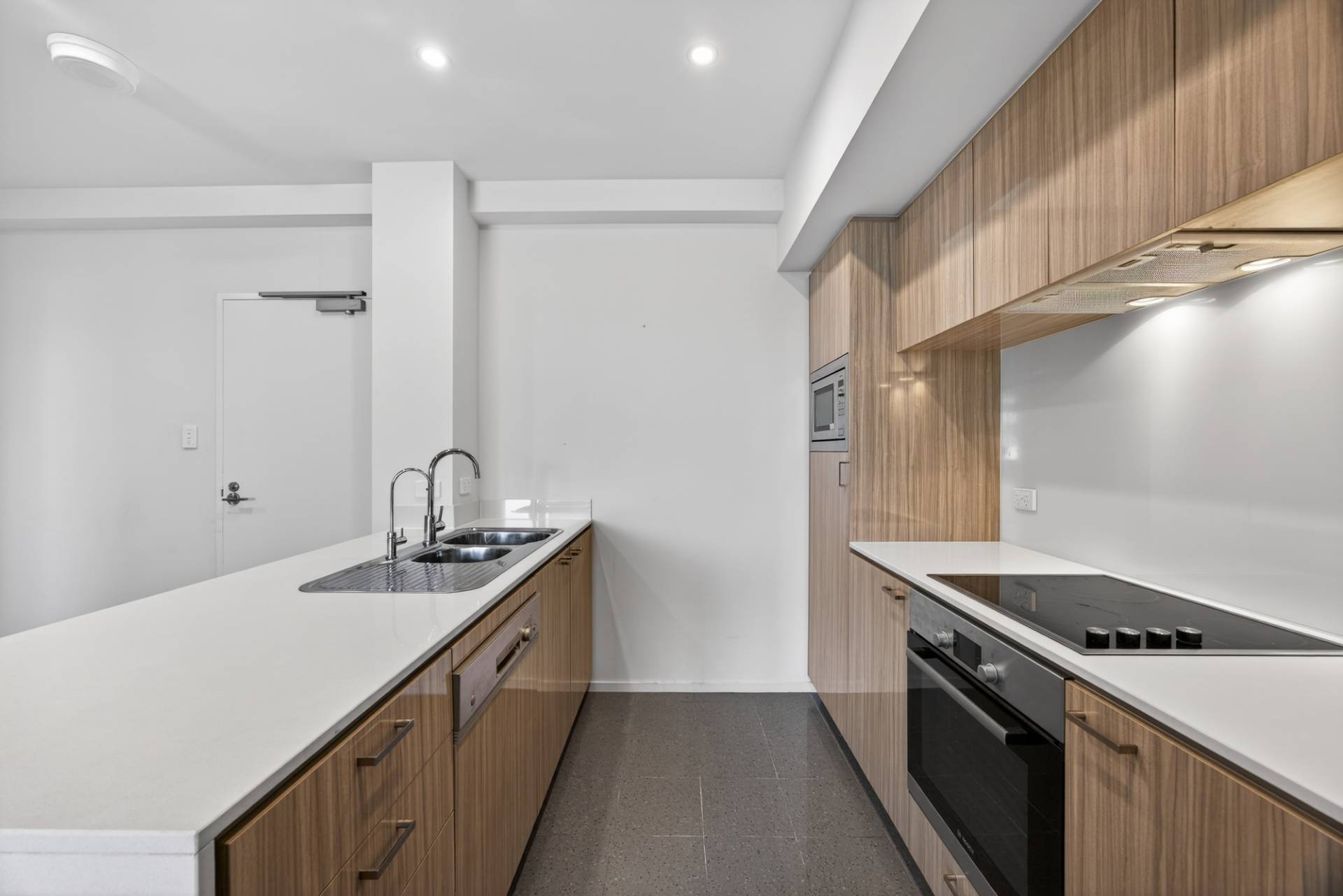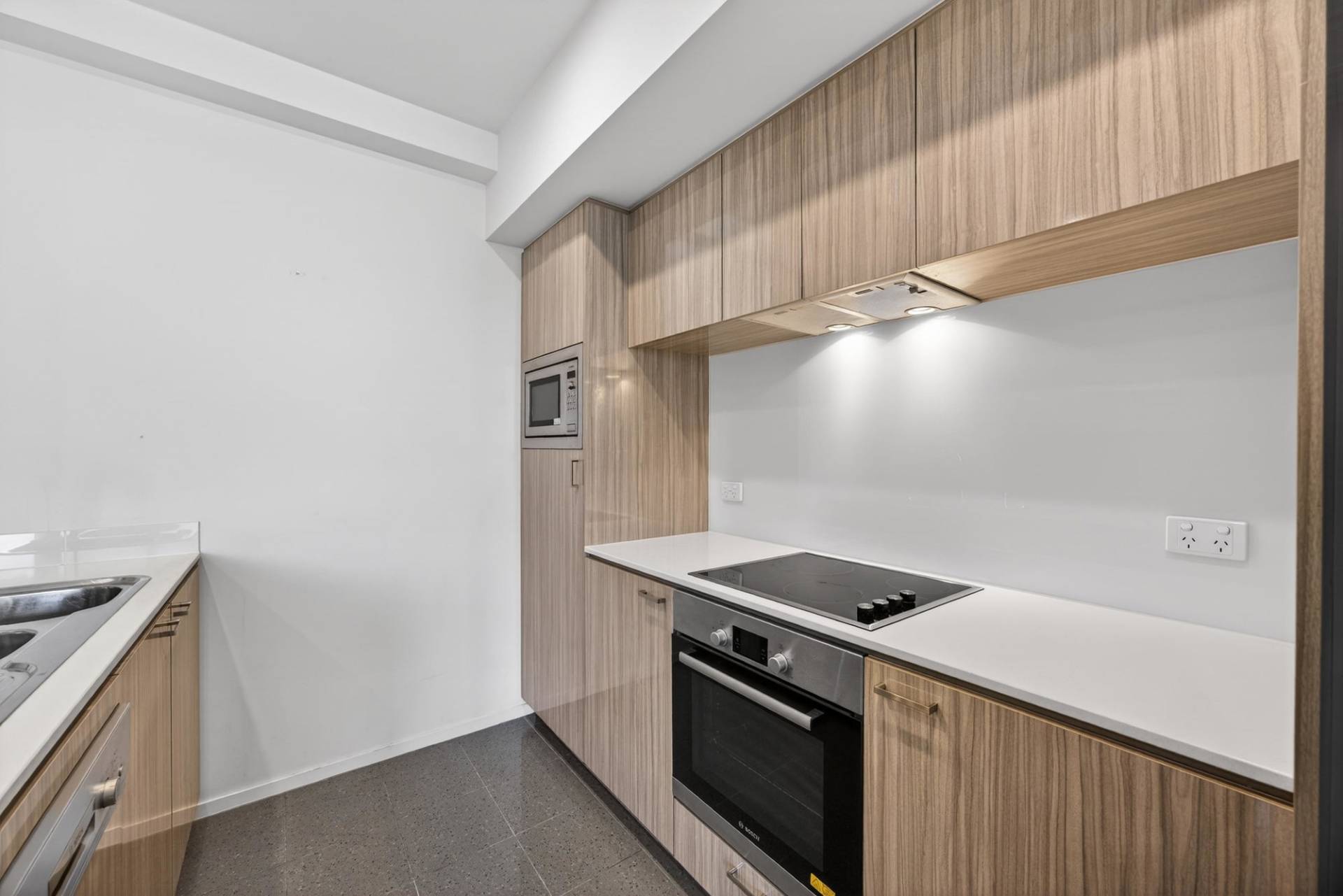 - Designer kitchen featuring stone bench tops, gloss white cabinetry, glass splashback, electric cooktop, Bosch appliances (including integrated dishwasher & microwave), double basin and excellent storage