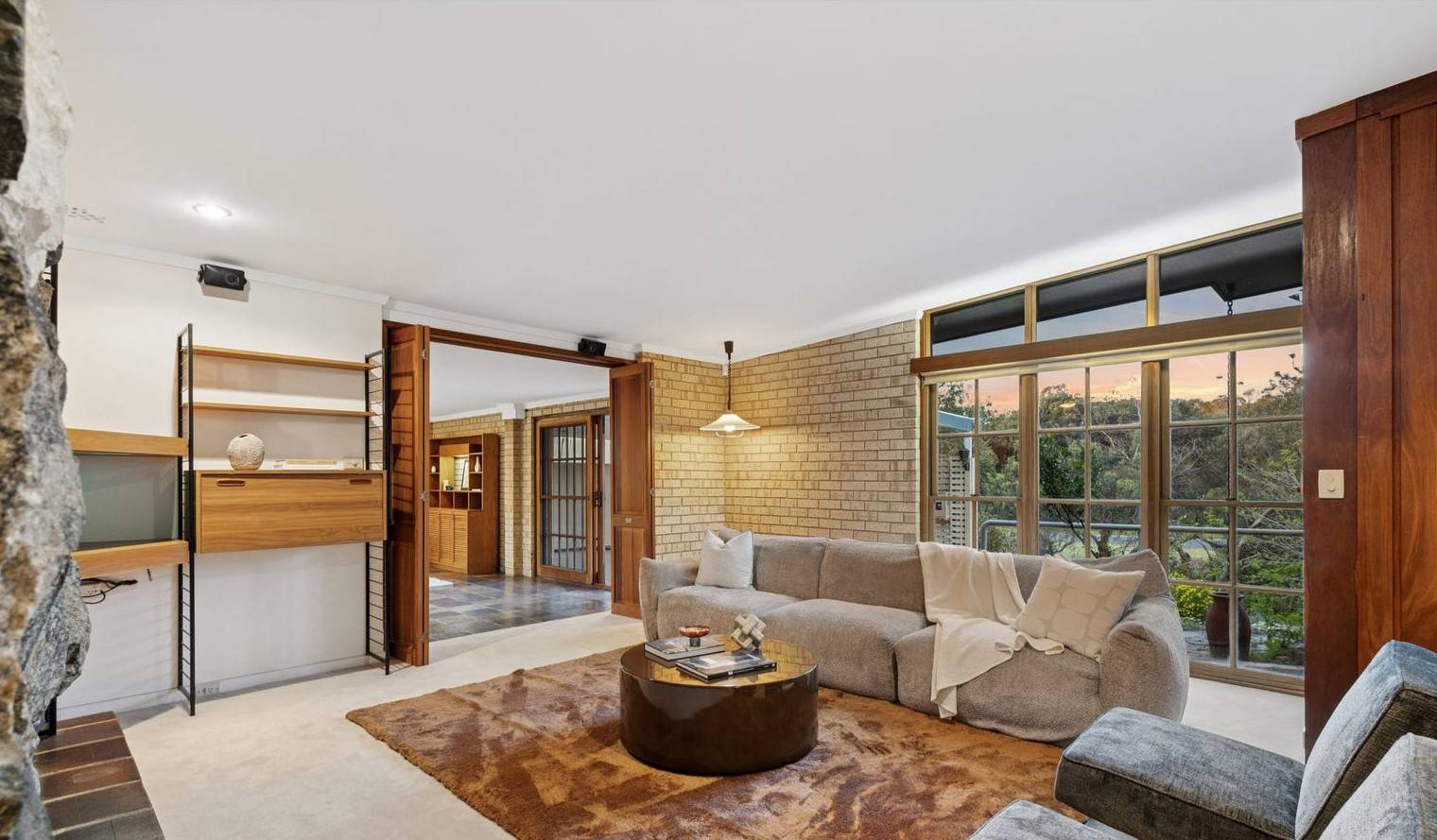Inside, the home flows effortlessly between living spaces, each filled with natural light and character. The dining area is a true standout, featuring a stunning picture window that frames the leafy surrounds and creates an inviting atmosphere for family meals or hosting guests.