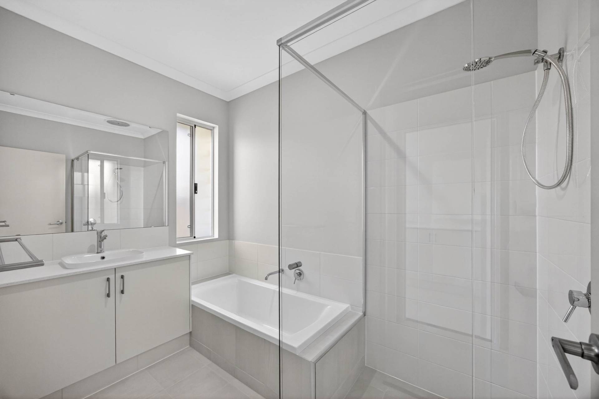 -Contemporary family bathroom with a separate bath and shower in neutral, modern finishes.