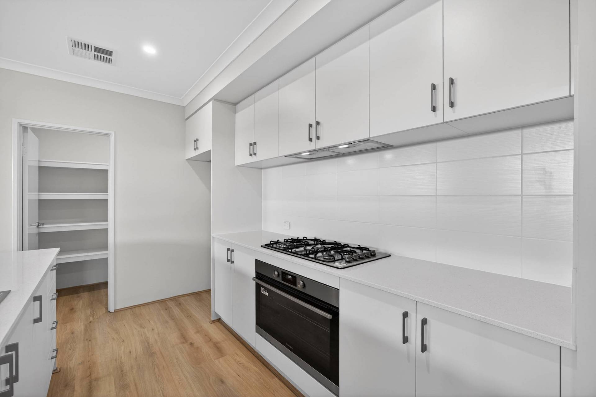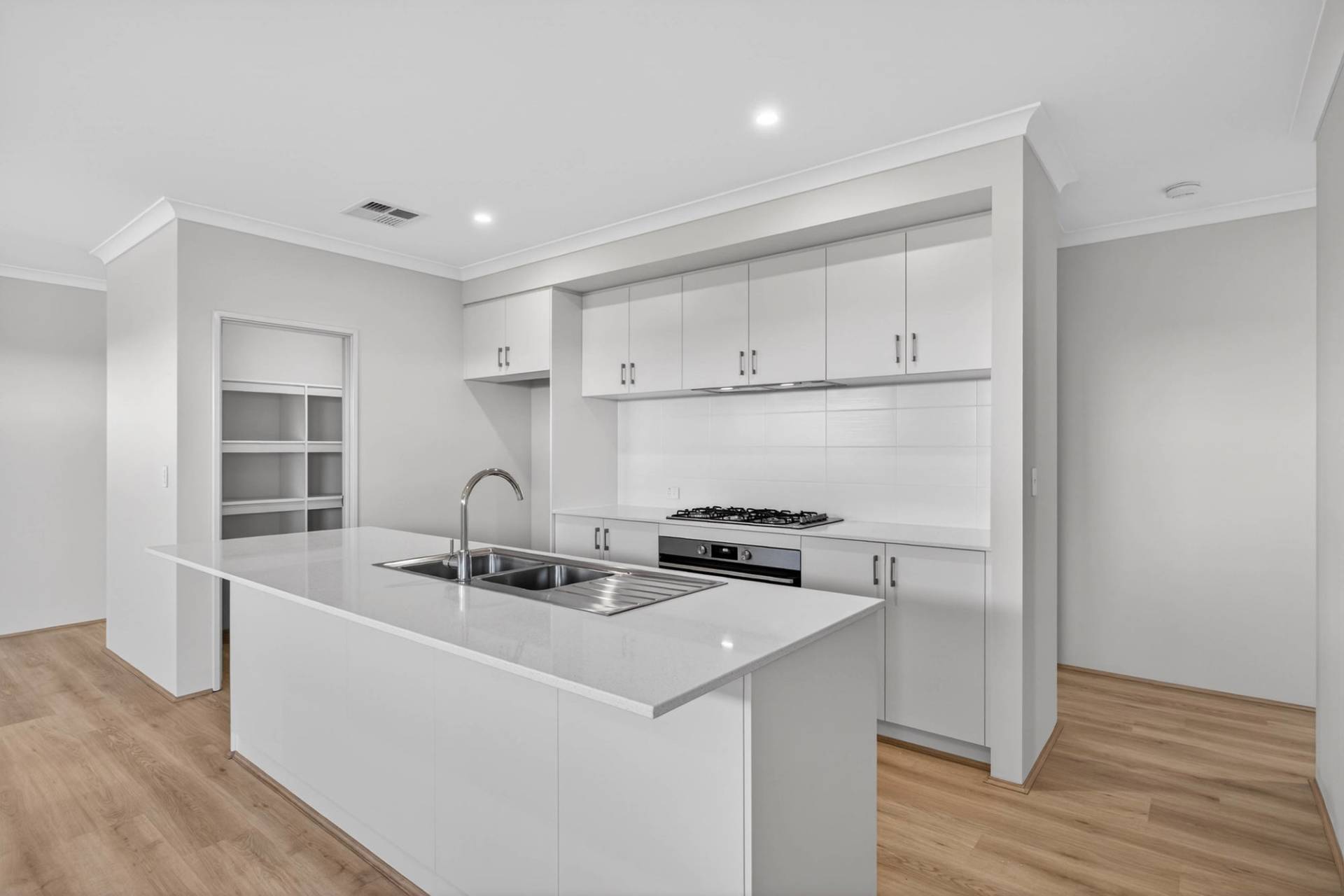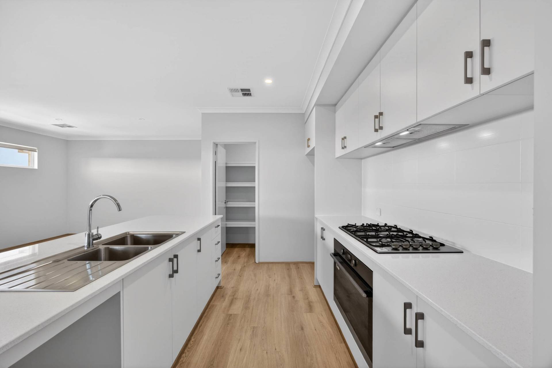 -Modern kitchen with a 900mm gas cooktop and oven, walk-in pantry, dual stainless steel sinks and plenty of storage.
