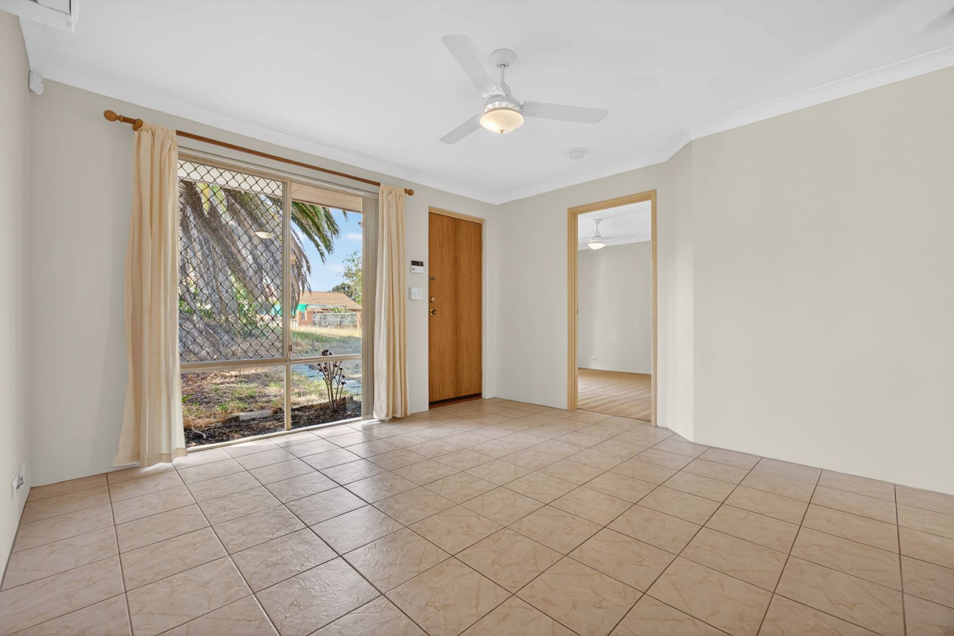 - Bright lounge room with tiled floors, decorative paint and curtains